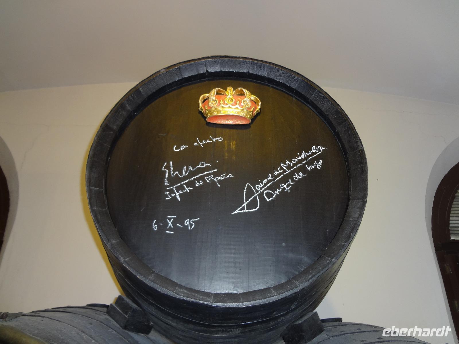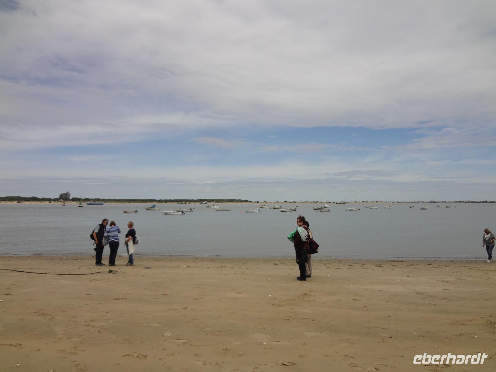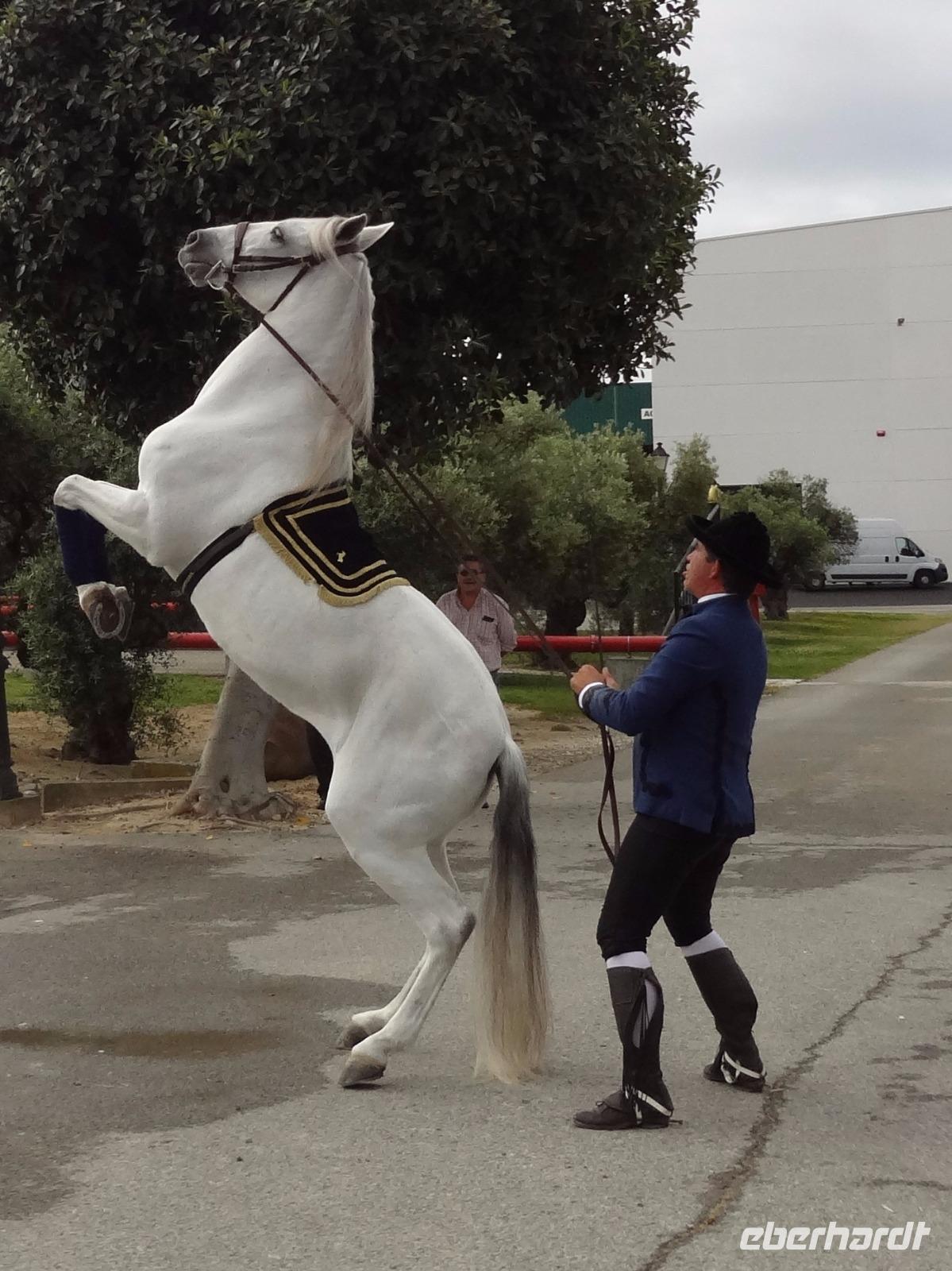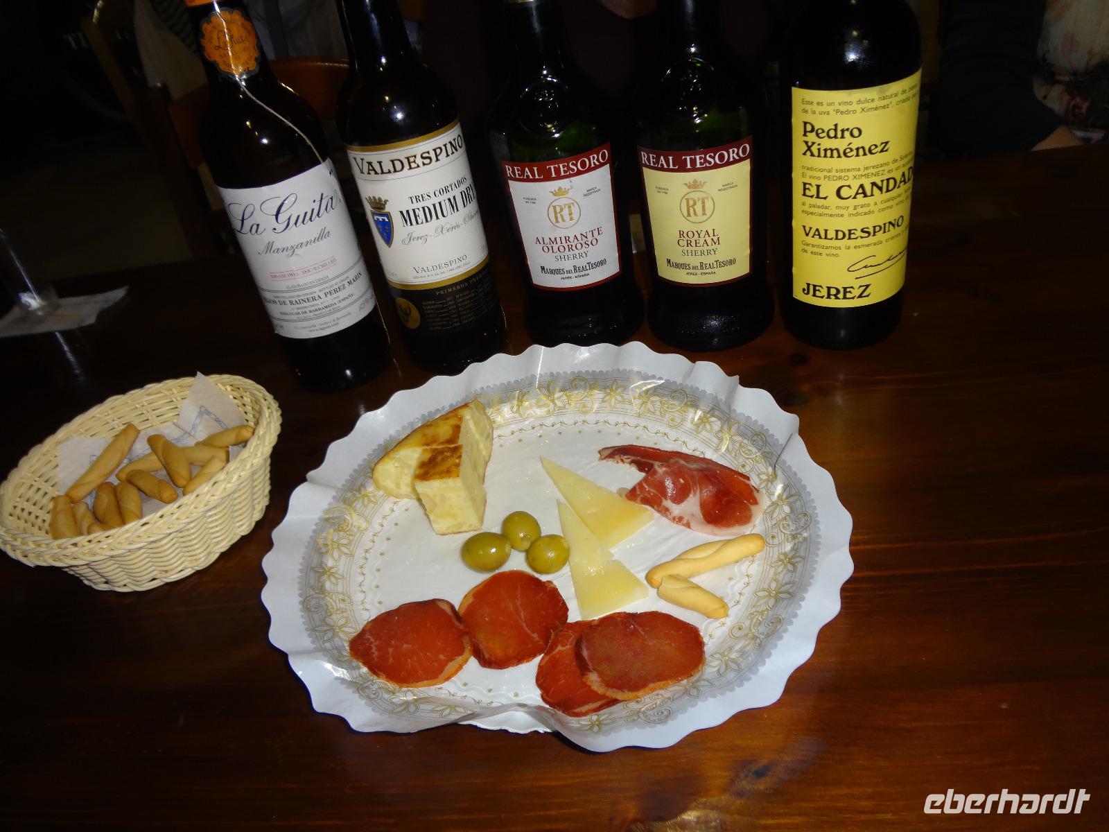 Ach, heute ist ja gar nicht sonnig, die Wolken machen sich breit und die Strassen sind nass. Wir fahren guten Mutes zu einer Bodega um die feinen Sherrys zu kosten. Auf die Pferdeshow danach freuen wir uns ganz besonders. Eine Bodega ist eine Kellerei und diese hier gehoert einer sehr reichen Familie die traditionsgemaess schon seit mehreren Generationen den koestlichen Sherry produzieren. Der Patio dieses Patrizierhauses ist wunderschoen und natuerlich sehr gepflegt und nobel. Die antiken Pendeluhren, Moebel und Tapisserien wirken geradezu feudal. In den Wohnraeumen sind heute Stuehle und jeweils ein Podium aufgestellt da verschiedene Konferenzen gehalten werden so koennen wir uns diese Raeumlichkeiten bloss vorstellen in welchem Glanz sie sich ansonsten zeigen. Ein Gaestebuch gibt es in einer Bodega nicht, da besondere Gaeste einfach ein Fass beschriften, welches dann zu ihren Ehren zur Besichtigung aufgestellt wird. Wir hoeren von der Bodega-Mitarbeiterin, wie man Sherry herstellt, dass es so viele verschiedene Sherrys gibt, von trocken bis zu ganz suess. Jedes Fass wird mit 500 Liter Sherry gefuellt und die Hefe wird immer wieder weitergegeben. So sind am Ende alle Sherries einer Kellerei miteinander verwandt und werden auch uebereinander gestapelt und gelagert. Tausende von Faesser, unten die aeltesten und oben die Enkelchen so lagern sie in diesem klimatisierten Riesenkeller. Wir schauen uns auch die Abfuellung, Etiketierung und Verkorkung der Flaschen an, wundern uns jedoch dass wir da auch Rum, Schnaps und ganz andere Getraenke auf dem Voerderband sehen. Ja, diese Bodega ist so erfolgreich und hat so eine moderne Abfuellung, dass sie die Dienste auch verkaufen. Hier kommt wieder die Bodega Mitarbeiterin und fuehrt uns hinaus, da es aufgehoert hat zu regnen und wir ein ganz spezielles Spektakel vorgefuehrt bekommen. Eine eigene Pferdeshow, bloss fuer uns. Bald schon kommt die Flamencotaenzerin und dreht sich mit ihrem schoenen, getupften Kleid und weissem Zottelschal wie eine Feder im Winde. Der stolze Reiter schreitet mit seinem Rappen auf sie zu und die drei vereinen sich nun in einem harmonischen Tanz des Gebens und Nehmens, der Ueberheblichkeit und Unterwuerfigkeit. Eine gekonnte Dressurshow wie wir es noch nie gesehen haben. Nun stolziert ein junger Schimmel ueber unsere Buehne, der Reiter schreitet seitlich neben ihm her und haelt die Zuegel so, dass der Schimmel alle Gehweisen auch verstehen kann. Seitlich trabend, mit Vorderbeinen gestreckt, langsam galopierend im Takt der Musik und noch viele andere Tricks kennt dieser wunderschoene Schimmel. Die Kapriole gelingt ihm perfekt und der Applaus ist ihm sicher. Oh nein, der Regen kommt zurueck, schade, aber die Show geht eh schon dem Ende zu, muss aber abgebrochen werden. Wir fluechten schnell wieder in den Keller denn nun wollen wir den Sherry, von dem wir so viel gehoert haben, auch verkosten. Erst einen trockenen, aehnlich wie Weisswein, zu Fisch und so, danach einen halb trockenen, zu Vorspeisen, der Oleoso zu Aperitif, der suessere aus zwei Traubensorten zu Dessert und zu guter letzt den rosinenhaften ober-super-suessen Sherry um alles klebrig, haftend zu machen. Die Tapas werden gegen Ende gereicht und schmecken vorzueglich. Es gibt zwei Sorten Schinken und feinen Kaese aus dieser Gegend. Angeheitert freuen wir uns schon sehr auf diese Tapas, die sich als Mittagessen entpuppen. Jetzt wird auch noch viel Sherry fuer sich selbst, die lieben blumengiessenden Nachbarn und katzenfuetternde Verwandte gekauft ehe wir wieder zu Esther in ihren Julia-Bus einsteigen. Es gibt ja auf allen Julia-Bussen Welan und so schicken wir die ersten Fotos dieses Tages schon um die Welt. Siesta-time fuer 20 Min und danach Bootsausflug in den Nazional- und Naturpark la Donana. Das wird eine kurze Siesta. Mit einem gruenen Jeep fahren wir nun teilweise im Wasser auf dem Strand entlang der Muendung des Guadalquivier Flusses. Viele Voegel und ganze Vogelscharen werden aufgescheucht was fuer schoene Fotos sorgt. Ueber grosse Duenen fuehrt uns die Sandstrasse vorbei an Blumen, Bueschelgrass, Wachholderbeeren- und Pinienbaeume. Wir steigen auch aus und vertreten uns die Fuesse, sodass wir gelassen weiterfahren koennen. Auf dem Weg begegnen wir schwarzen Wildschweinen auch Familien mit Frischlinge und vielen verschiedenen Reh- und Vogelarten. Die holperige Fahrt ist lustig und unsere Kameras wollen wieder mal alles futtern was sie sehen. Bald sind wir bei einer Anlegestelle wo auch schon ein groesseres Boot auf uns wartet und uns wieder zum Ausgangspunkt segelt. Es war eine schoene Ausfahrt, das Wetter hat so- so-la-la mitgespielt und es regnet erst wieder richtig, als wir im Bus Platz genommen haben. Ein bisschen geschafft sind wir nun schon von diesem vollen Tag und die Pause bis zum Abendessen wird noetigst gebraucht. Unser Abendessen, das herrliche Hotelbuffet, ist wieder sehr schmackhaft, dazu goennen wir uns wieder einen Wein und zum Abschluss vielleicht doch noch einen Sherry !