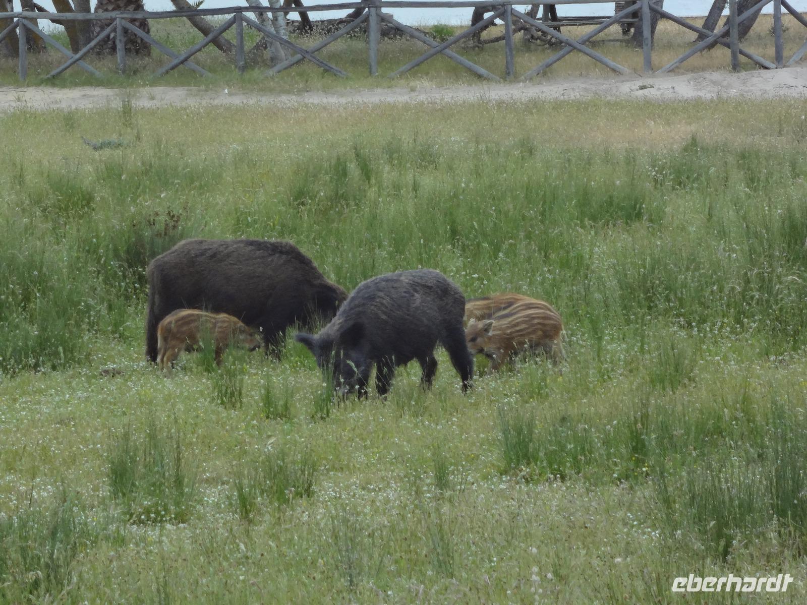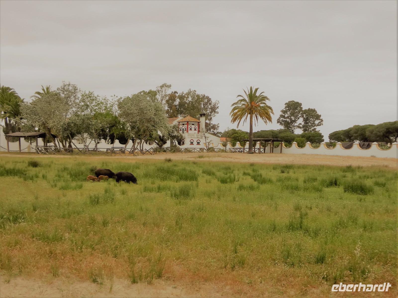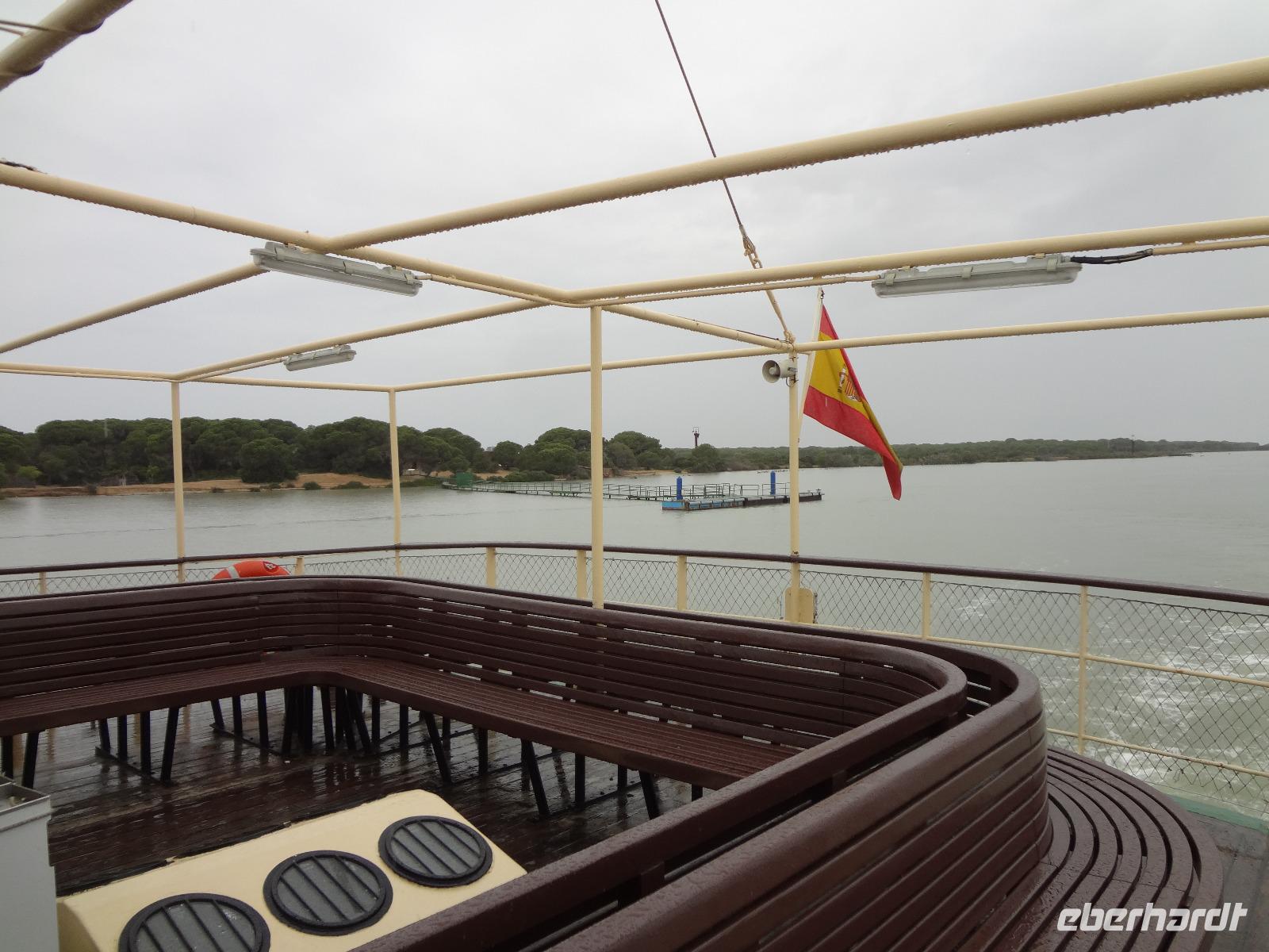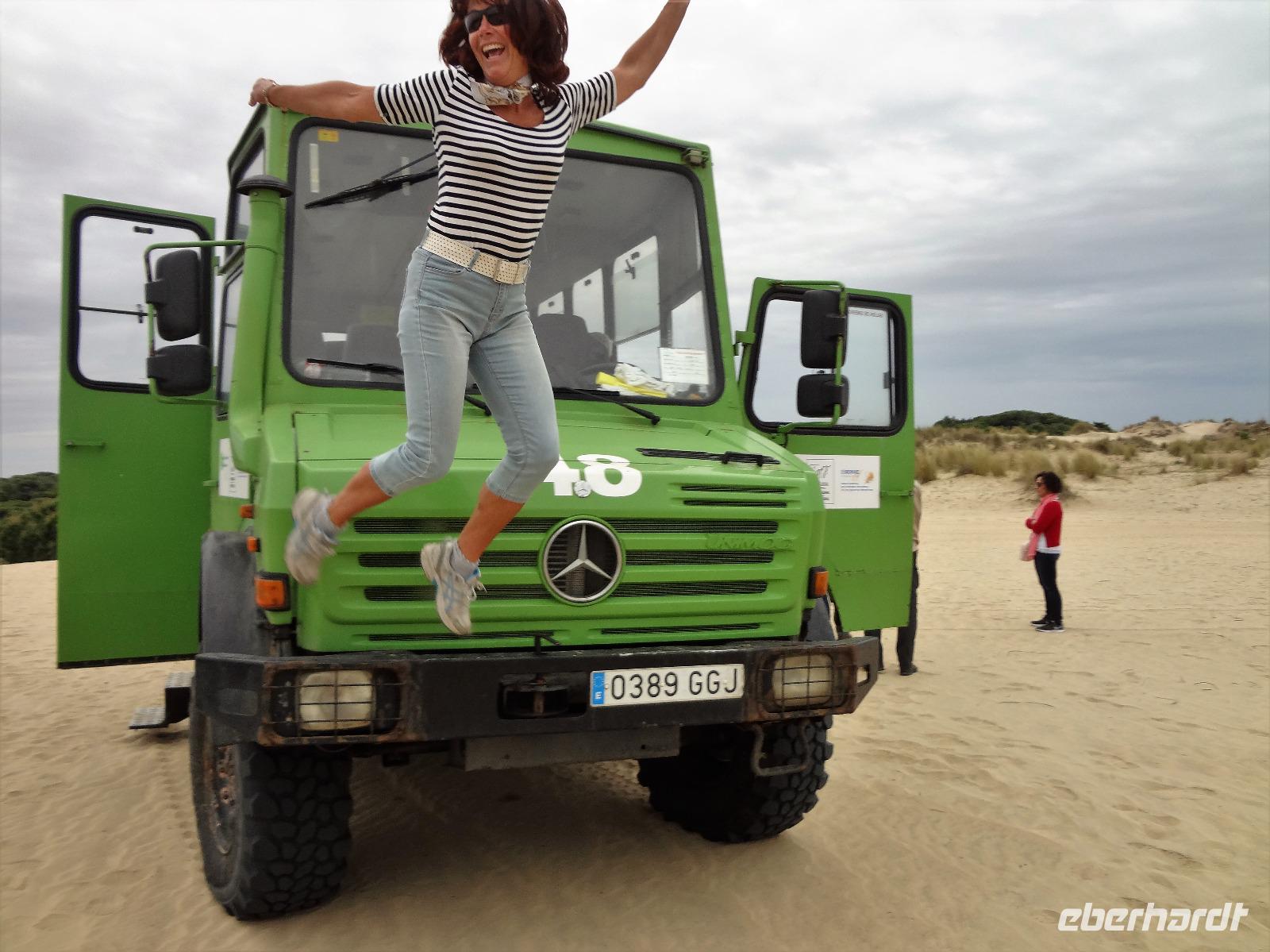 Ach, heute ist ja gar nicht sonnig, die Wolken machen sich breit und die Strassen sind nass. Wir fahren guten Mutes zu einer Bodega um die feinen Sherrys zu kosten. Auf die Pferdeshow danach freuen wir uns ganz besonders. Eine Bodega ist eine Kellerei und diese hier gehoert einer sehr reichen Familie die traditionsgemaess schon seit mehreren Generationen den koestlichen Sherry produzieren. Der Patio dieses Patrizierhauses ist wunderschoen und natuerlich sehr gepflegt und nobel. Die antiken Pendeluhren, Moebel und Tapisserien wirken geradezu feudal. In den Wohnraeumen sind heute Stuehle und jeweils ein Podium aufgestellt da verschiedene Konferenzen gehalten werden so koennen wir uns diese Raeumlichkeiten bloss vorstellen in welchem Glanz sie sich ansonsten zeigen. Ein Gaestebuch gibt es in einer Bodega nicht, da besondere Gaeste einfach ein Fass beschriften, welches dann zu ihren Ehren zur Besichtigung aufgestellt wird. Wir hoeren von der Bodega-Mitarbeiterin, wie man Sherry herstellt, dass es so viele verschiedene Sherrys gibt, von trocken bis zu ganz suess. Jedes Fass wird mit 500 Liter Sherry gefuellt und die Hefe wird immer wieder weitergegeben. So sind am Ende alle Sherries einer Kellerei miteinander verwandt und werden auch uebereinander gestapelt und gelagert. Tausende von Faesser, unten die aeltesten und oben die Enkelchen so lagern sie in diesem klimatisierten Riesenkeller. Wir schauen uns auch die Abfuellung, Etiketierung und Verkorkung der Flaschen an, wundern uns jedoch dass wir da auch Rum, Schnaps und ganz andere Getraenke auf dem Voerderband sehen. Ja, diese Bodega ist so erfolgreich und hat so eine moderne Abfuellung, dass sie die Dienste auch verkaufen. Hier kommt wieder die Bodega Mitarbeiterin und fuehrt uns hinaus, da es aufgehoert hat zu regnen und wir ein ganz spezielles Spektakel vorgefuehrt bekommen. Eine eigene Pferdeshow, bloss fuer uns. Bald schon kommt die Flamencotaenzerin und dreht sich mit ihrem schoenen, getupften Kleid und weissem Zottelschal wie eine Feder im Winde. Der stolze Reiter schreitet mit seinem Rappen auf sie zu und die drei vereinen sich nun in einem harmonischen Tanz des Gebens und Nehmens, der Ueberheblichkeit und Unterwuerfigkeit. Eine gekonnte Dressurshow wie wir es noch nie gesehen haben. Nun stolziert ein junger Schimmel ueber unsere Buehne, der Reiter schreitet seitlich neben ihm her und haelt die Zuegel so, dass der Schimmel alle Gehweisen auch verstehen kann. Seitlich trabend, mit Vorderbeinen gestreckt, langsam galopierend im Takt der Musik und noch viele andere Tricks kennt dieser wunderschoene Schimmel. Die Kapriole gelingt ihm perfekt und der Applaus ist ihm sicher. Oh nein, der Regen kommt zurueck, schade, aber die Show geht eh schon dem Ende zu, muss aber abgebrochen werden. Wir fluechten schnell wieder in den Keller denn nun wollen wir den Sherry, von dem wir so viel gehoert haben, auch verkosten. Erst einen trockenen, aehnlich wie Weisswein, zu Fisch und so, danach einen halb trockenen, zu Vorspeisen, der Oleoso zu Aperitif, der suessere aus zwei Traubensorten zu Dessert und zu guter letzt den rosinenhaften ober-super-suessen Sherry um alles klebrig, haftend zu machen. Die Tapas werden gegen Ende gereicht und schmecken vorzueglich. Es gibt zwei Sorten Schinken und feinen Kaese aus dieser Gegend. Angeheitert freuen wir uns schon sehr auf diese Tapas, die sich als Mittagessen entpuppen. Jetzt wird auch noch viel Sherry fuer sich selbst, die lieben blumengiessenden Nachbarn und katzenfuetternde Verwandte gekauft ehe wir wieder zu Esther in ihren Julia-Bus einsteigen. Es gibt ja auf allen Julia-Bussen Welan und so schicken wir die ersten Fotos dieses Tages schon um die Welt. Siesta-time fuer 20 Min und danach Bootsausflug in den Nazional- und Naturpark la Donana. Das wird eine kurze Siesta. Mit einem gruenen Jeep fahren wir nun teilweise im Wasser auf dem Strand entlang der Muendung des Guadalquivier Flusses. Viele Voegel und ganze Vogelscharen werden aufgescheucht was fuer schoene Fotos sorgt. Ueber grosse Duenen fuehrt uns die Sandstrasse vorbei an Blumen, Bueschelgrass, Wachholderbeeren- und Pinienbaeume. Wir steigen auch aus und vertreten uns die Fuesse, sodass wir gelassen weiterfahren koennen. Auf dem Weg begegnen wir schwarzen Wildschweinen auch Familien mit Frischlinge und vielen verschiedenen Reh- und Vogelarten. Die holperige Fahrt ist lustig und unsere Kameras wollen wieder mal alles futtern was sie sehen. Bald sind wir bei einer Anlegestelle wo auch schon ein groesseres Boot auf uns wartet und uns wieder zum Ausgangspunkt segelt. Es war eine schoene Ausfahrt, das Wetter hat so- so-la-la mitgespielt und es regnet erst wieder richtig, als wir im Bus Platz genommen haben. Ein bisschen geschafft sind wir nun schon von diesem vollen Tag und die Pause bis zum Abendessen wird noetigst gebraucht. Unser Abendessen, das herrliche Hotelbuffet, ist wieder sehr schmackhaft, dazu goennen wir uns wieder einen Wein und zum Abschluss vielleicht doch noch einen Sherry !