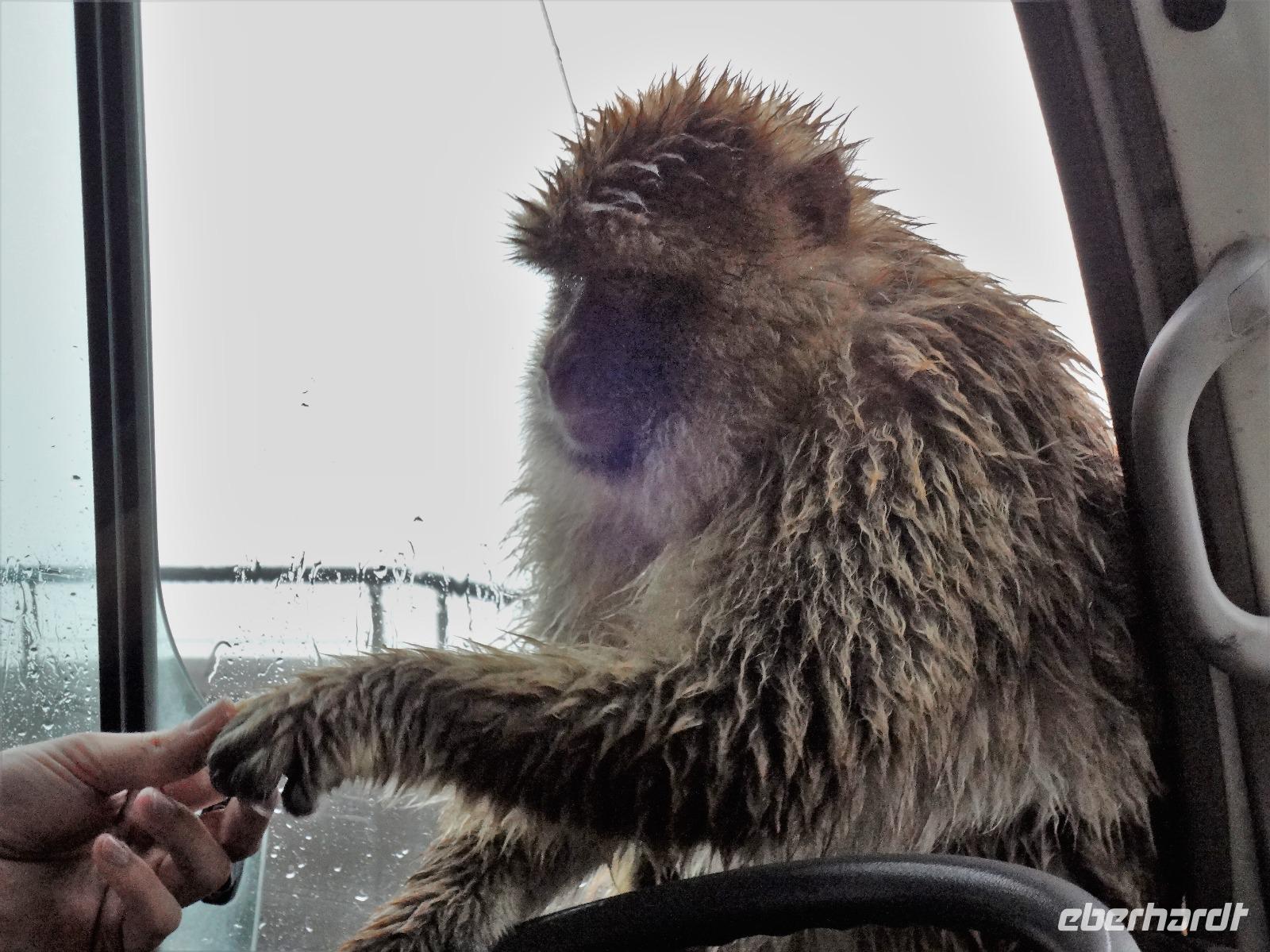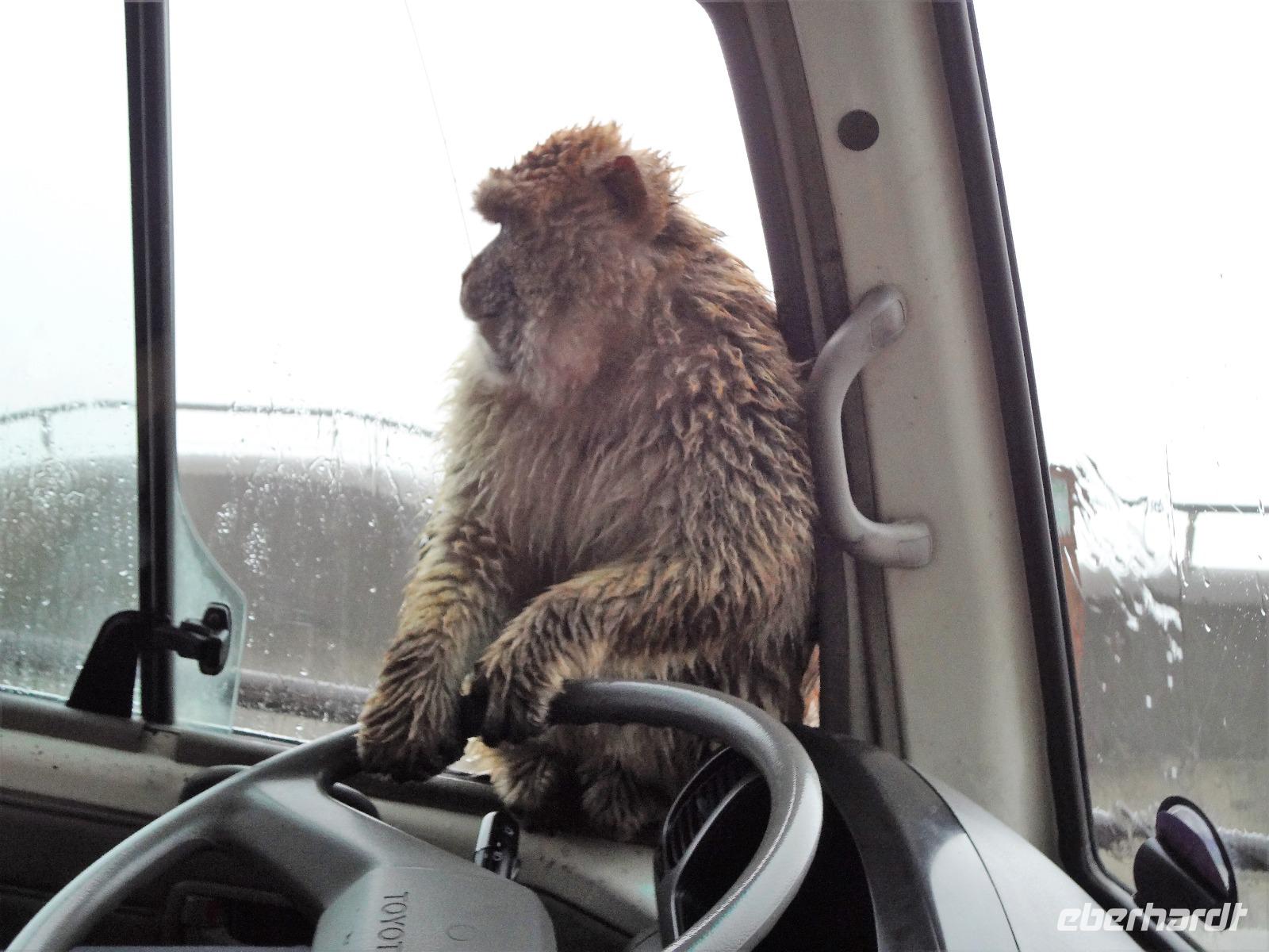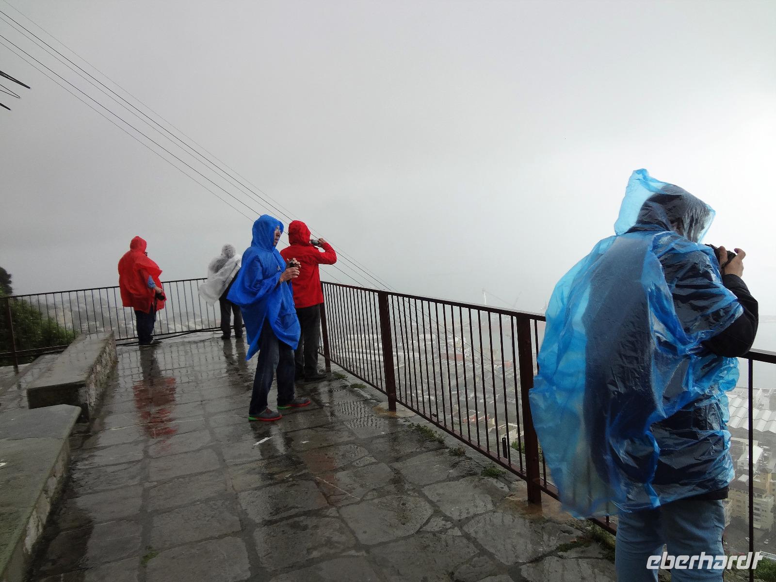 Es giesst in Stroemen, nur gut, denken wir, dass wir von Jerez abfahren, denn es kann ja bloss besser werden. So dachten wir. Das war der Plan.....Es sollte jedoch ganz anders kommen ! Die Strecke von Jerez bis nach Gibraltar dauert 1 ½ Stunden, normalerweise, doch fahren wir vom Regen in die Traufe. Die Wolken haengen bald schon bis zur Autobahn hinunter und so dauert die Fahrt ½ Stunde laenger. Ach, da kann man gut dahindoesen und alle administrativen Arbeiten erledigen. Alle Busse haben tollen Welan Empfang und jeder, der nicht gerade mit „Augenlieder von innen anschauen" beschaeftigt ist, kontrolliert was die Boerse macht, schreibt wieder mal seinen Freunden, staunt ueber die Genauigkeit des Wetter-apps, liest was Mr.Trump twittert und wundert sich ueber die vielen Neuigkeiten aller seiner 1000 Freunde auf Facebook. So kommen wir in Gibraltar an, man sieht nur grau in grau, aber irgendwo ist der Felsen dieser britischen Hochburg versteckt. In den geschlagenen 3 Minuten vom Bus ins Zollgebaeude sind wir trotz Regenjacken total durchnaesst. Jeans, haben die unangenehme Eigenart das Wasser aufzusaugen und schleunigst das Hosenbein hinaufzuschiessen bis zum Guertel. Mit unseren Paessen in der Hand, lassen uns die Spanier ausreisen und die Briten auch ungehindert in ihr Territorium einreisen. Der lokale Bus wartet schon auf uns, doch muessen wir eine Strasse ueberqueren. Dies laesst uns schnell entscheiden, dass eine Pelleriene erstanden werden muss. Gedacht, getan. Die meisten unter uns sind nun stolze Besitzer solcher blauen und roten Pellerienen mit Gibraltar Aufdruck. Der gutaussehende polnische junger Chauffeur, legt auch schon das deutsche Band ein, sodass wir eine lustige Fuehrung durch die Stadt, um die Stadt und auf den Felsen hoeren koennen. Schon im Jahre 1704 uebergaben die Spanier diesen Felsen, auf ewig, dem Staate Gross Britanien. Immer wieder brachte das zu Unstimmigkeiten, Kaempfen und Schlachten. Wir fahren auch bald schon ueber die Landebahn des Flughafens Gibraltars und vorbei an dem Friedhof aller gefallenen Soldaten der Schlacht von Trafalgar 1805. Im Regendunst sehen wir den Hafen und die bekannte Rosia Bucht. Der Regen nimmt zu, unterdessen scheuttet es wie aus Kuebel gegossen, dies bringt uns zum Europa point. 22 Km von Afrika entfernt seien wir hier und wir kruemmen uns vor Lachen ueber die Erklaerung, denn sie ist immer auf Sicht, Sonne, Hitze und Waerme ausgerichtet. Genau diese Elemente sind heute bestens geheimgehalten. Die Moschee und der Leuchtturm sind Gott Sei Dank so gross, dass wir sie sogar sehen koennen und wir knipsen wie wild ! denn ansonsten haben wir bislang bloss weiss-grau melierte Bilder des heutigen Tages zu verzeichnen. Wir fahren auch an jenem Felsen vorbei, der eine Schwester auf dem afrikanischen Kontinent hat. Herkules ist derjenige Gott, der die beiden auseinanderhaelt. Der hat heute aber auch gefehlt ! Von Europa Point aus, ahnt man Afrika gegenueber, Mittelmeer oestlich und Atlantik westlich, pflatsch ! Nun fahren wir in die Wolken hinein auf den Felsen. Dort sind auch die Saint Michaels Hoehlen. Ein ganzer Konzertsaal ist in der ersten Hoehle und die Stalagmiten und Stalagtiten sind riesengross und dick. Die Beleuchtung ist discoaehnlich bunt und dies versetzt uns in die 70 Jahre. Sogar die Koenigin Elisabeth war im Jahre 1954 hier auf Besuch, es war ihre erste und letzte Visite (wobei es sonnig war und es doch noch keine Discobeleutung gab). Lady Di und Prinz Philip hingegen haben in Gibraltar sogar ihre Flitterwochen verbracht ! Nur gut, dass unser Bus so Nahe an die Hoehlen fahren kann und wir mit unseren Pellerinen und durchgesaugten Schuhen und Jeans schnell gehen koennen, so entfliehen wir eventuell dem Schnupfen. Einige Aeffchen sind unterwegs, wohl bloss die hungrigsten oder haben die Affen untereinander ausgehandelt wer bei diesem Wetter raus muss ? Solange Affen auf dem Felsen Gibraltars wohnen, wird es auch Englaender in Gibraltar geben so heisst es. Bei der Aussichtsterrasse fluechtet ein Affe durchs Chauffeur-fenster in den Bus hinein und haelt sich am Steuerrad fest, dafuer bekommt er natuerlich eine Gage, eine Banane, Stueck um Stueck, sodass wir alle unseren neuen Passagier fotografieren koennen. Der Arme, hat wahrscheinlich das kurze Los der Affenkolonie gezogen und war nun dran ! Triefend nass, schaut selbst ein niedliches Aeffchen wie eine groessere Ratte aus. Nach diesem Spektakel fahren wir wieder den Felsen hinunter denn wir wollen auch noch die Main Street, aber eher vom Bus aus, sehen. Die Geschaefte sind heute eh alle geschlossen, da heute Feiertag auf Gibraltar ist. Also fahren wir wieder zur Grenze und werden von Esther auf der spanischen Seite erwartet. Unterdessen ist ueberall Hochwasser und wir schauen dem regen Treiben zu, wie Busse ueber Gehsteige fahren, Autos bis zur Tuere hin im Wasser stecken bleiben und Leute kreuz und quer huepfen und waddeln. Muehsam kaempfen wir uns durchs Wasser, die Strasse aehnelt immer mehr einem Kanal, wir wollen nichts wie weg. Unsere Esther schafft es und zur Belohnung und Erleichterung kehren wir unterwegs ein, essen ein offeriertes Sandwich und trinken etwas Warmes dazu. Endlich sind wir in dem noblen Marbella. Das Hotel ist wunderschoen gelegen. Zwischen Strand und Altstadt, da fuehlen wir uns wieder wohl. In den grossen Zimmer haengt nun jeder seine triefende Bekleidung auf und mancher freut sich, dass die Baren so schoen im Trockenen angelegt sind. Ein sagenhaftes Buffet erwartet uns spaeter. Diesen Tag werden wir nicht so schnell vergessen und die Pellerinen werden uns gezwungenermassen immer an Gibraltar erinnern. Das Buffet, ahhhh... und die Kuba-Bar danach bringen uns wieder in vollen Schwung und versuessen diesen Abend sehr angenehm. Einige tanzten bis um 1 Uhr in der Frueh zu den suedlandischen Rythmen.
