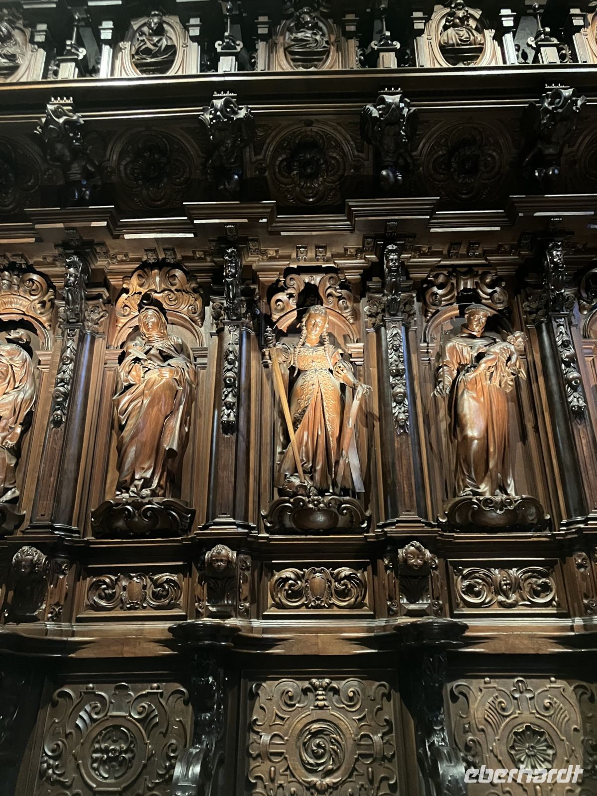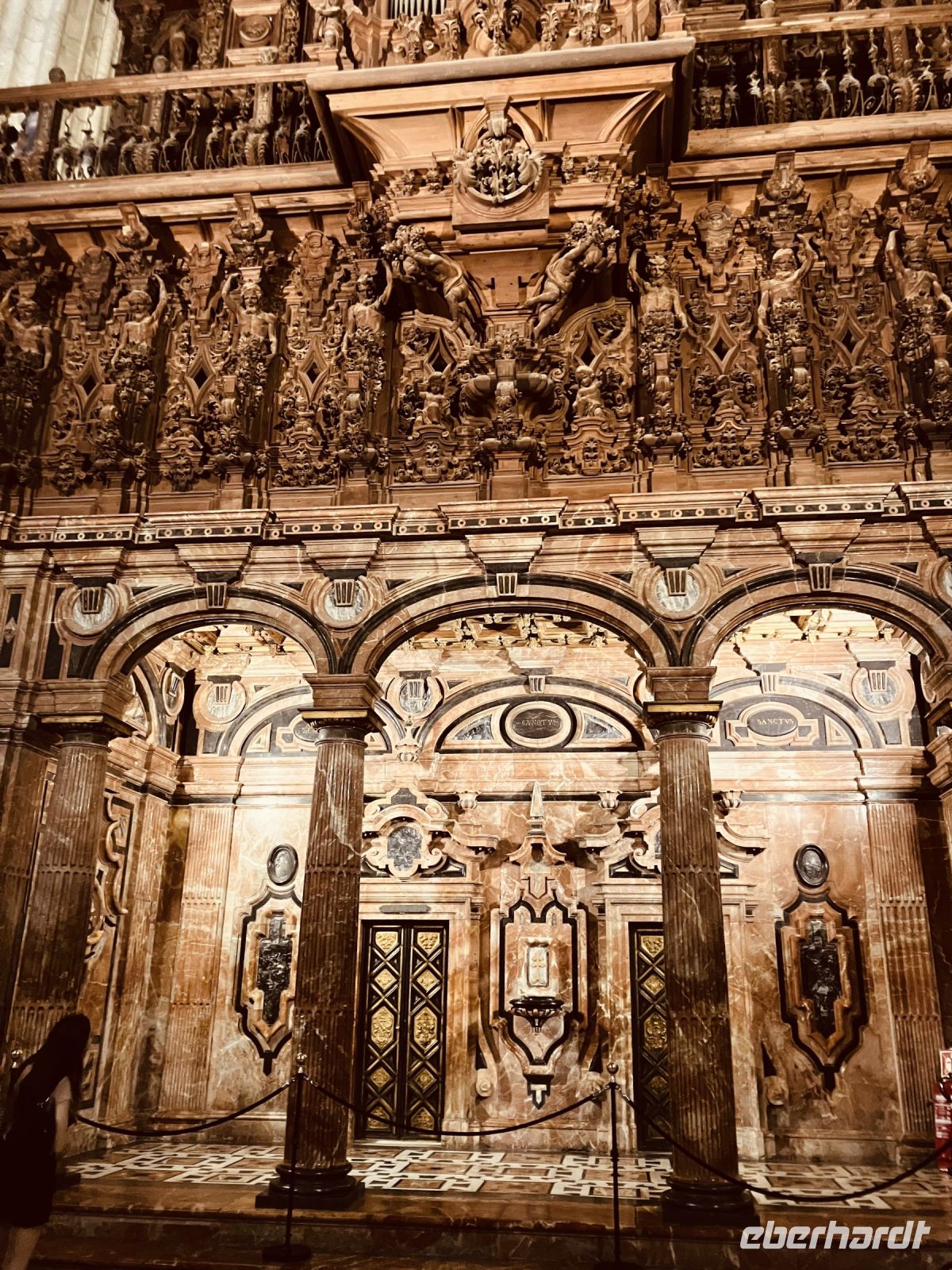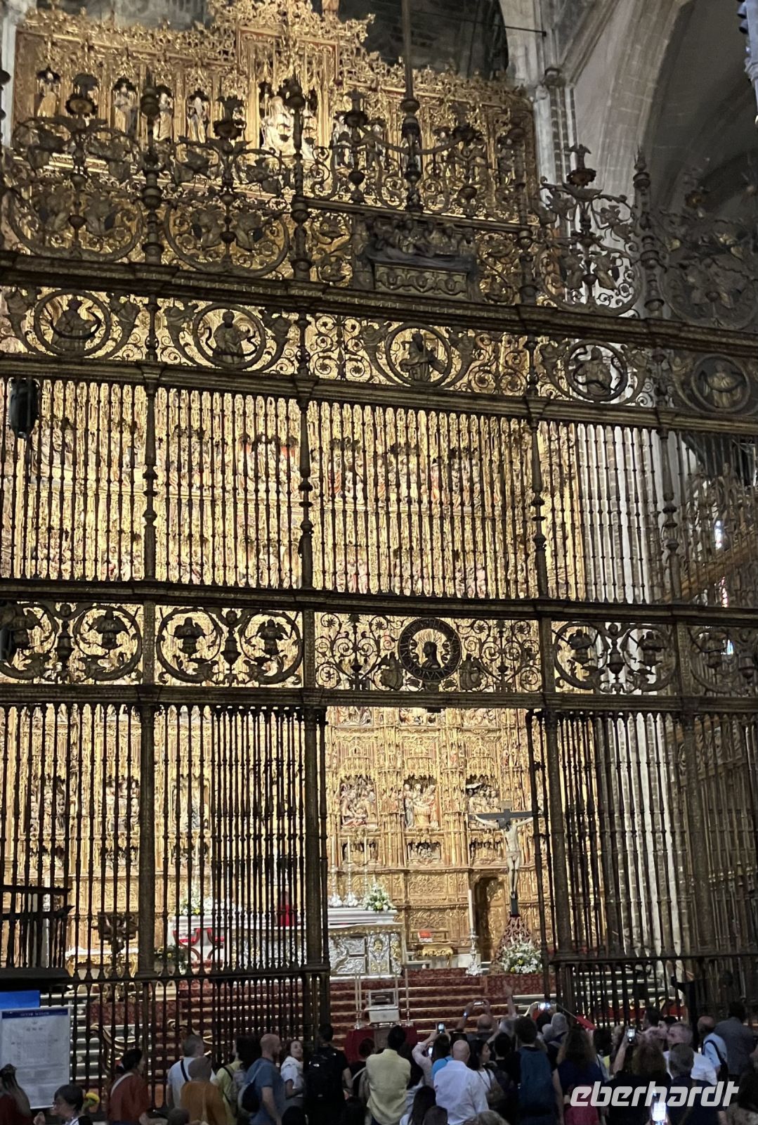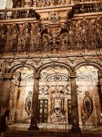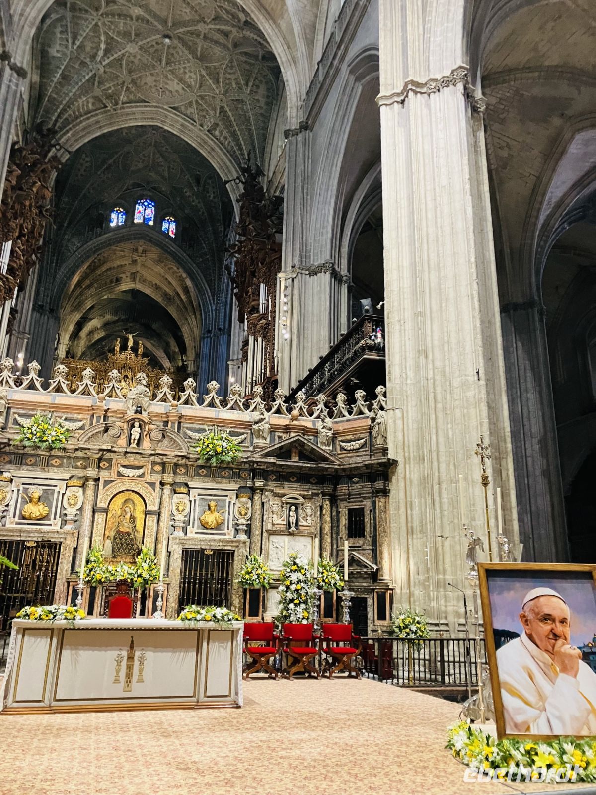 Anschließend führte uns Kate zur Kathedrale María de la Sede, der weltweit größten gotischen Kathedrale und einem wahren Schmuckstück Sevillas. Schon von außen war die Kathedrale überwältigend: ihre gewaltigen Bögen und detailreichen Fassaden ließen uns staunen. Im Inneren erwartete uns eine Welt voller Pracht – hohe Gewölbe, funkelnde Glasfenster und der prächtige Hauptaltar, der in Gold erstrahlte. Doch der Besuch hatte seine Herausforderungen: Immer wieder fiel das Licht aus, und bei allen für einige Verwirrung sorgte. Noch beleuchtet war ein Bild am Altar, das an den verstorbenen Papst Francisco erinnerte – ein stiller Moment der Besinnung inmitten der viele Besucher der Kathedrale.