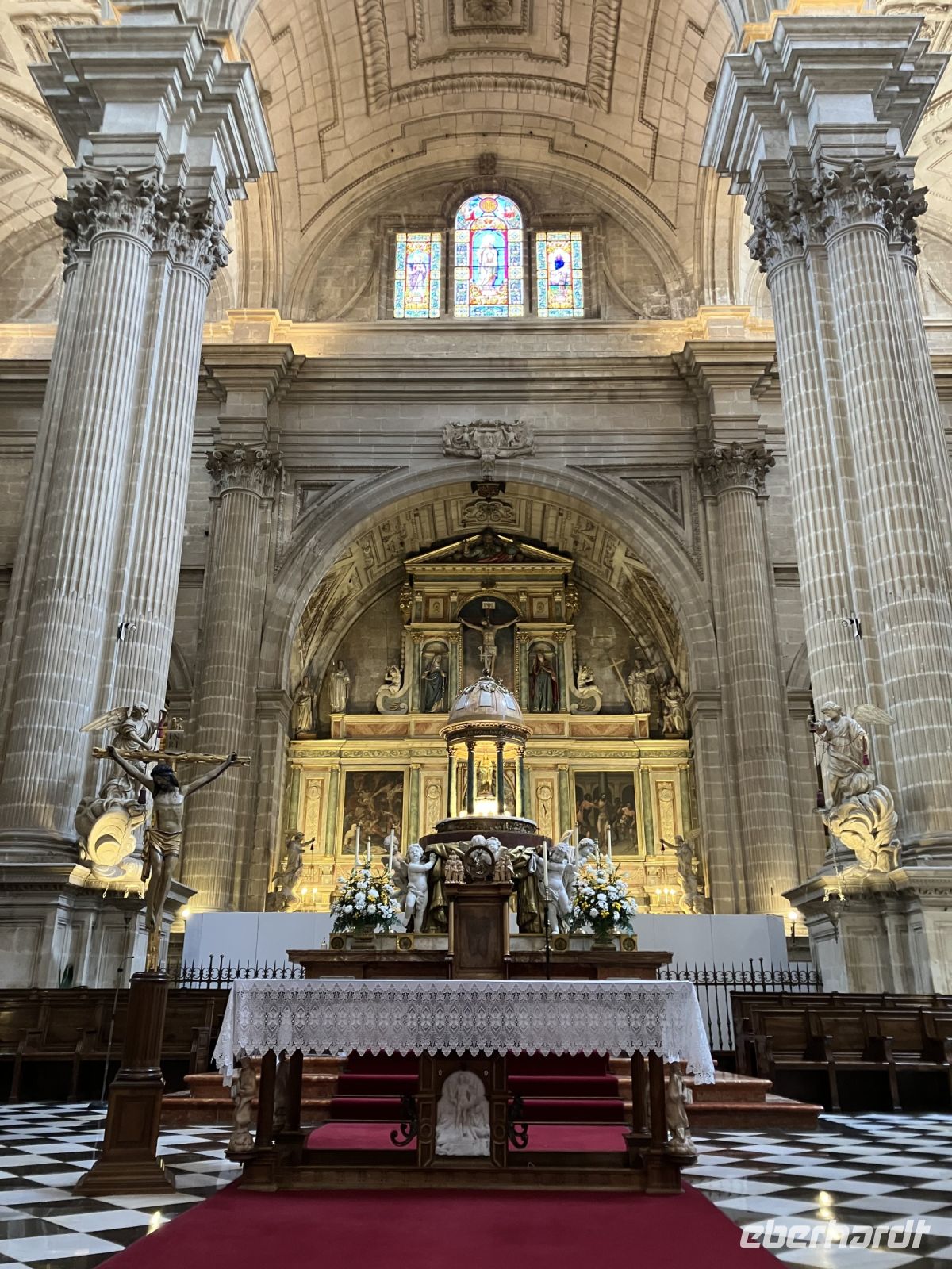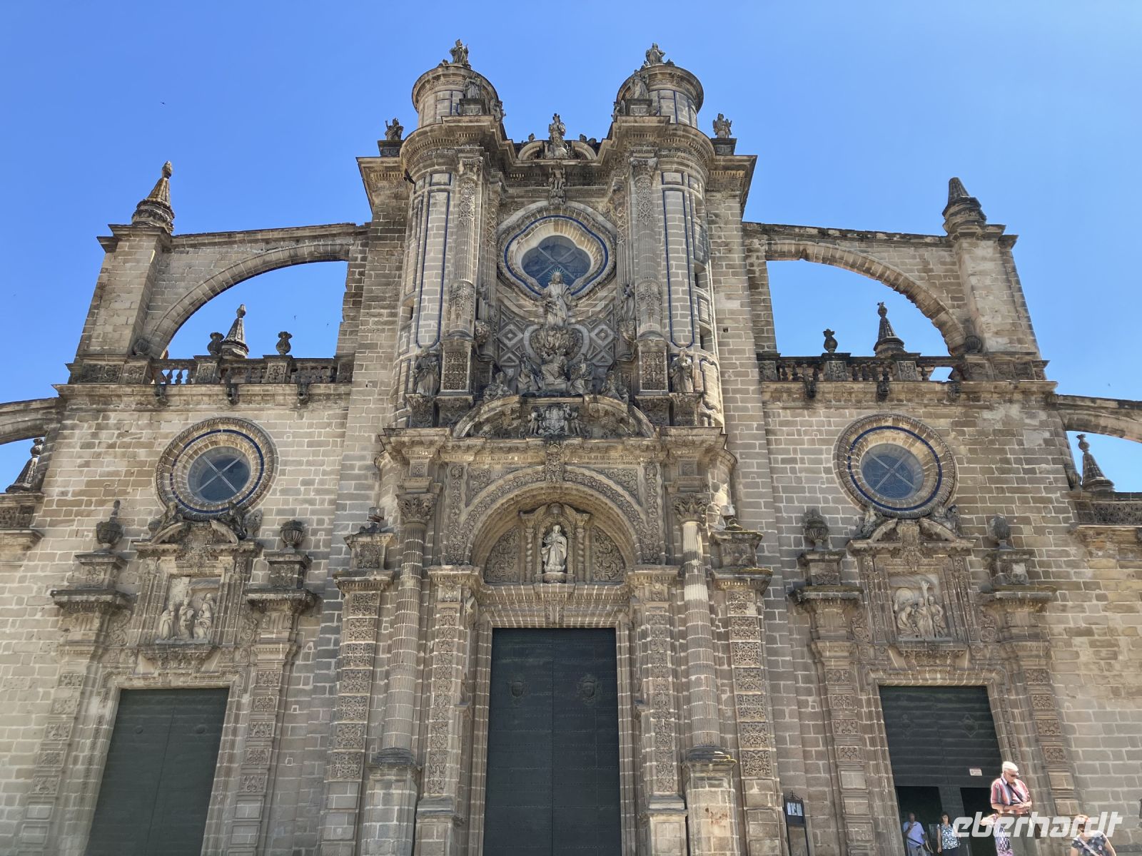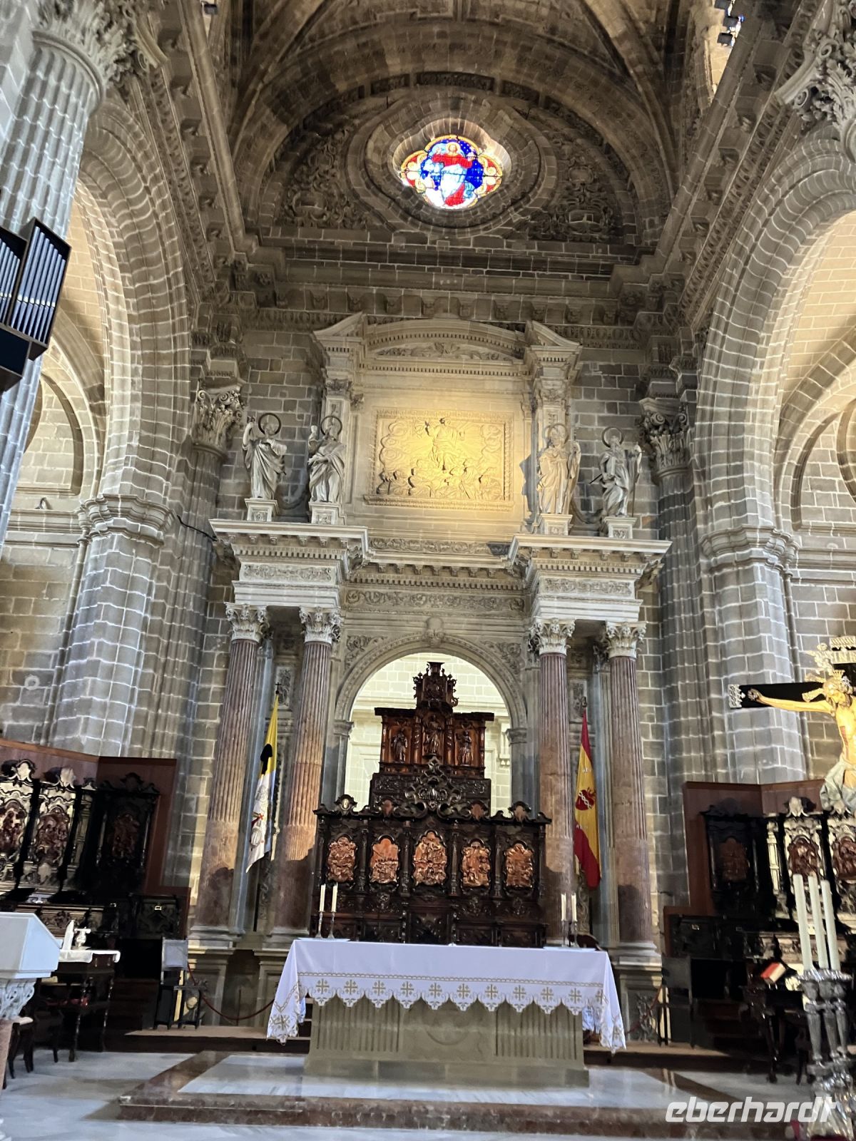 Weiter ging es zur Kathedrale, einer prächtigen katholischen Kirche aus dem 17. Jahrhundert, die majestätisch auf einem Hügel über Jerez de la Frontera thront. Schon von außen beeindruckte uns die barocke Fassade mit ihren filigranen Details und dem hohen Glockenturm, der wie ein Wächter über der Stadt ragt. Im Inneren erwartete uns eine Welt voller Pracht: hohe Gewölbe, funkelnde Altäre und bunte Glasfenster, die das Licht in Regenbogenfarben brachen.