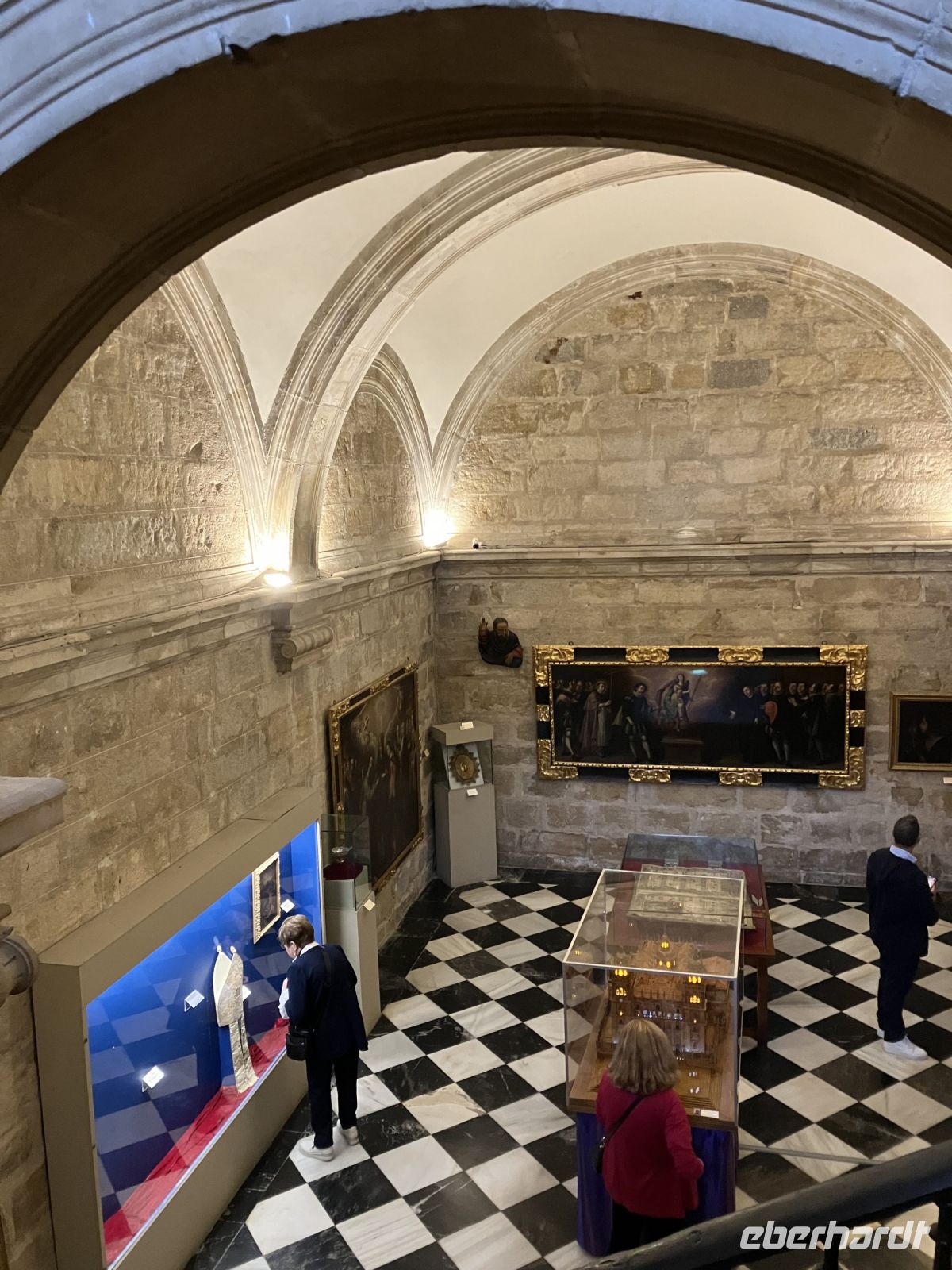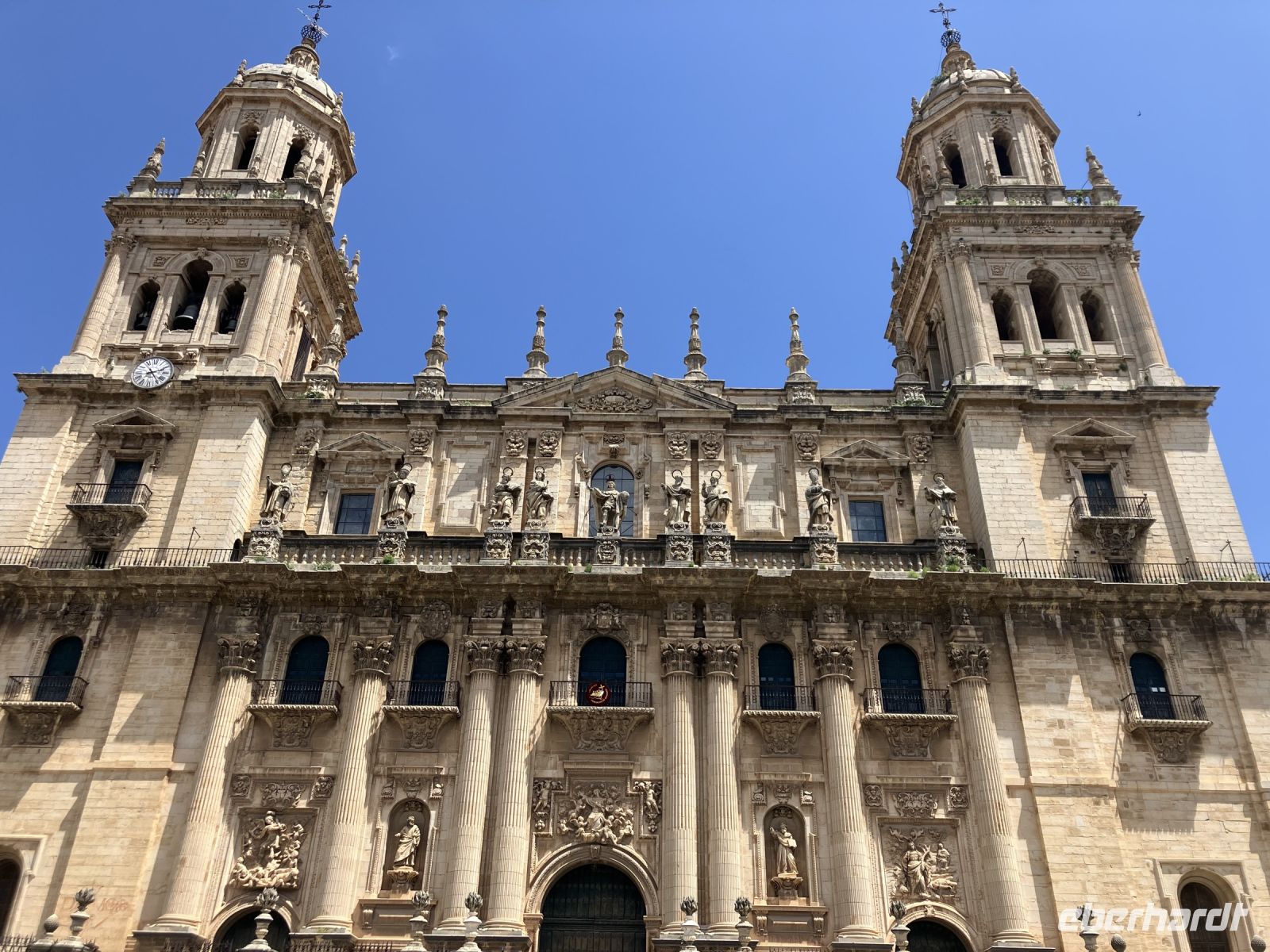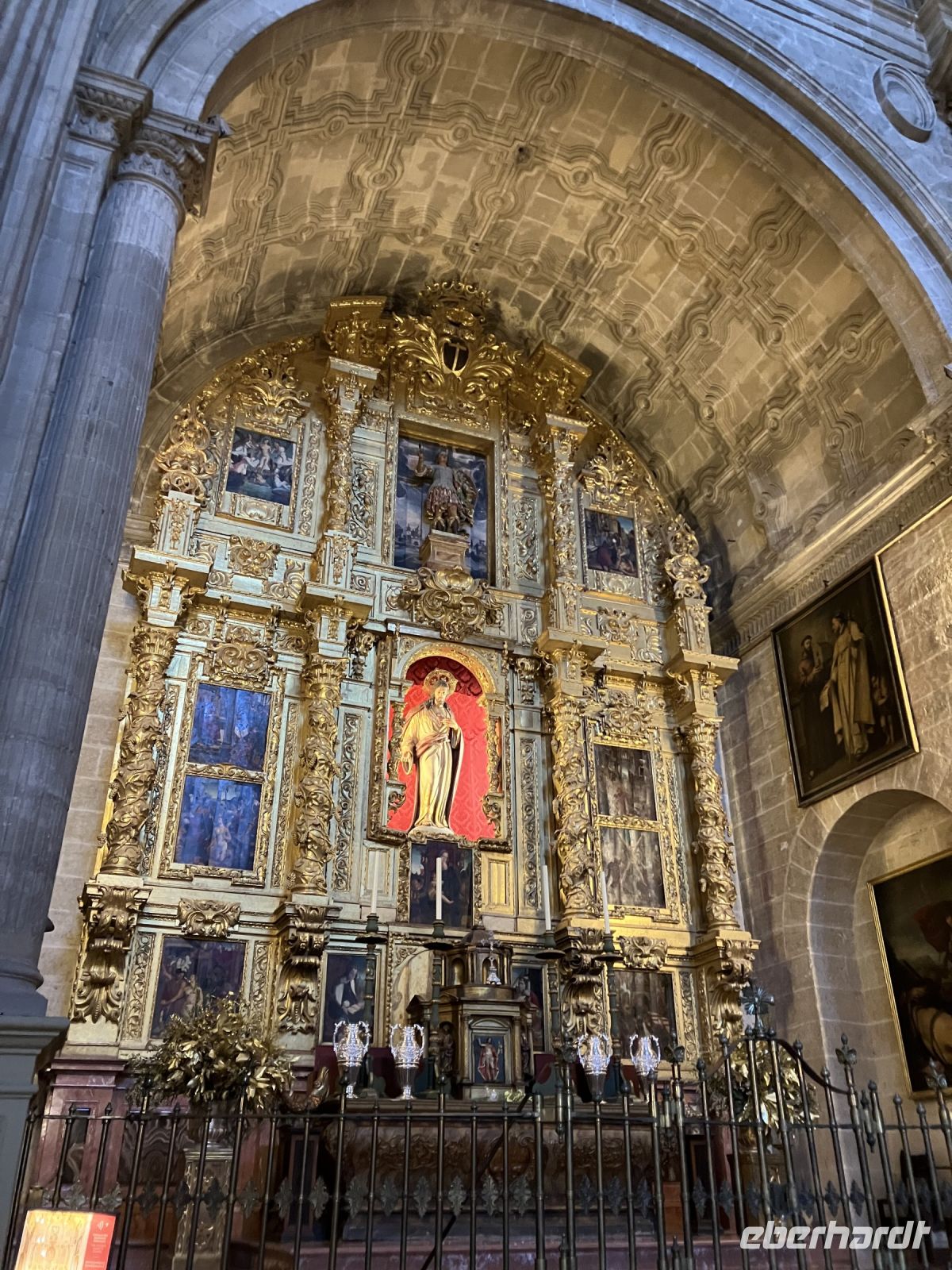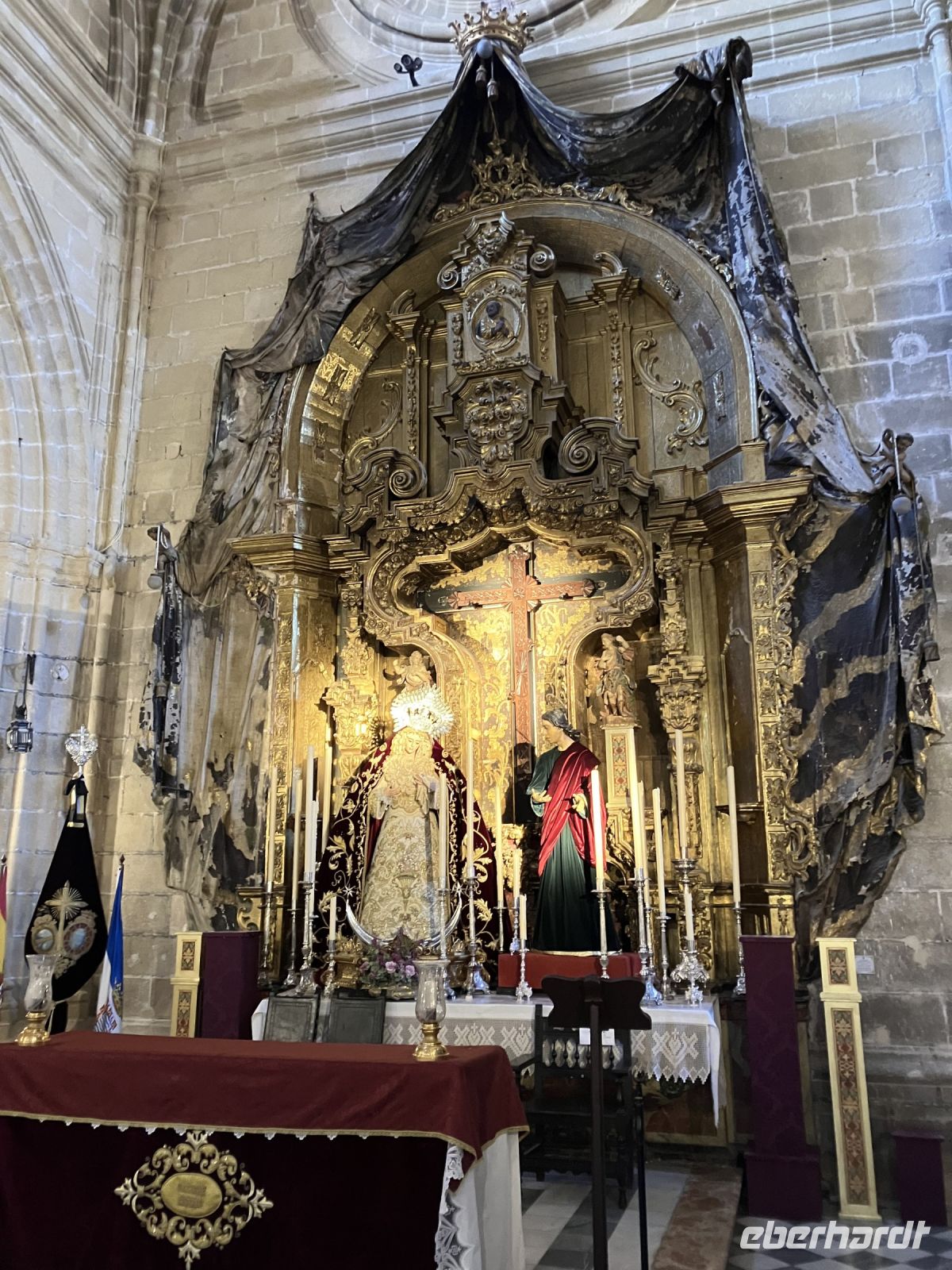 Weiter ging es zur Kathedrale, einer prächtigen katholischen Kirche aus dem 17. Jahrhundert, die majestätisch auf einem Hügel über Jerez de la Frontera thront. Schon von außen beeindruckte uns die barocke Fassade mit ihren filigranen Details und dem hohen Glockenturm, der wie ein Wächter über der Stadt ragt. Im Inneren erwartete uns eine Welt voller Pracht: hohe Gewölbe, funkelnde Altäre und bunte Glasfenster, die das Licht in Regenbogenfarben brachen.