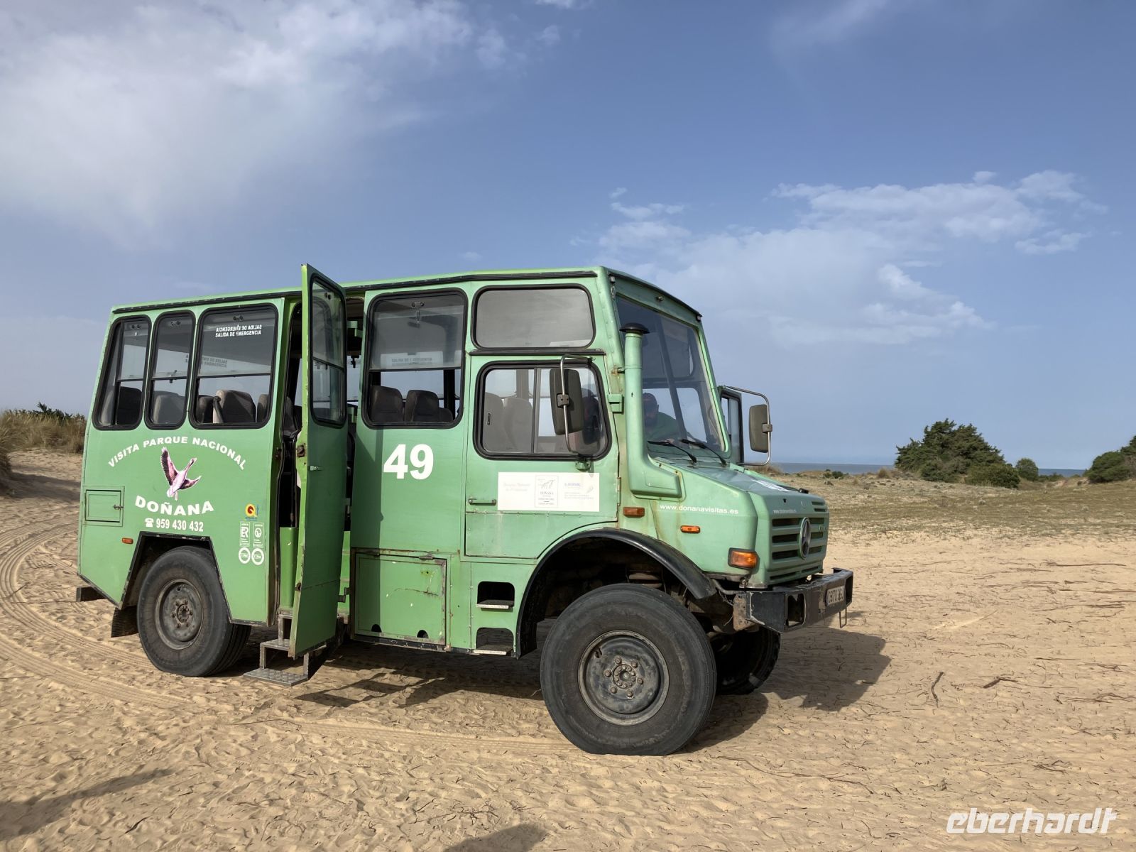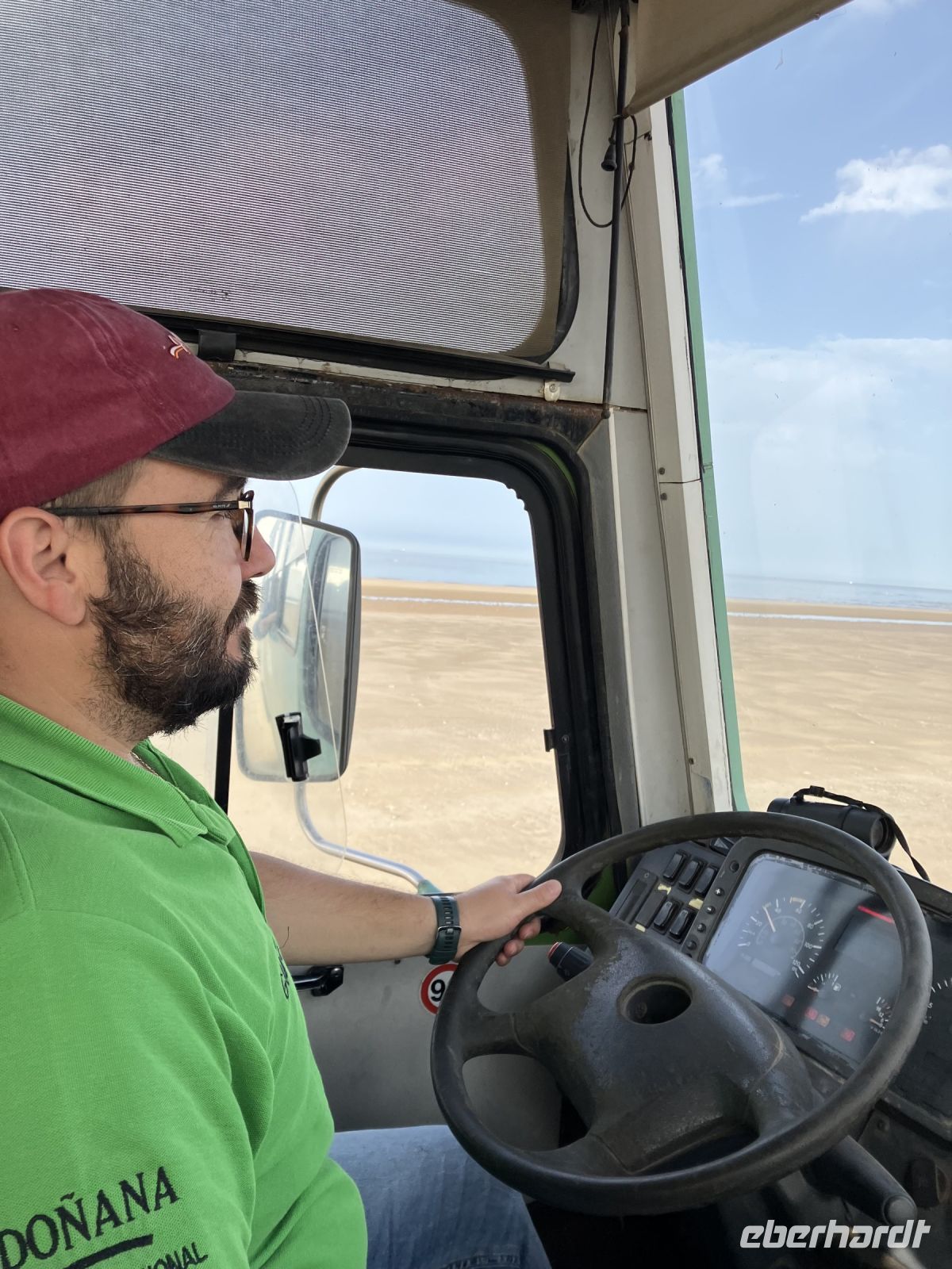 Am anderen Ufer erwartete uns Francisco, unser erfahrener Fahrer, mit einem robusten Offroad-Geländewbus. Mit ihm ging es schaukelnd los, entlang des Flussufers bis zur Mündung des Guadalquivir, wo das Wasser in den weiten, glitzernden Atlantik überging. Dann tauchten wir in die beeindruckenden Dünenlandschaften des Nationalparks ein – goldene Sandhügel, die mit Schirmkiefern und Phönizischem Wacholder bewachsen sind. Francisco erzählte uns brachte uns die verschiedenen Ökosysteme des Parks näher, während der den Geländewagen geschickt über die Sandpisten manövrierte.