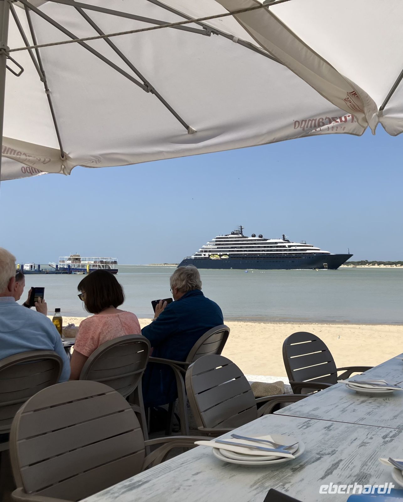 Zurück in Sanlúcar ließen wir uns an der immer lebhafter werdenden Uferpromenade nieder, wo wir ein viel zu reichhaltiges Mittagessen genossen, während ein Kreuzfahrtschiff den Guadquivir in Richtung Sevilla an uns vorbeizog.