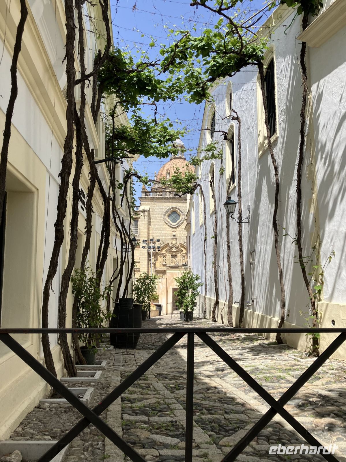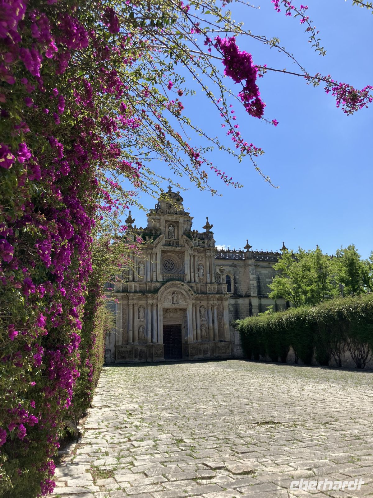 Auf dem Weg in die Altstadt von Jerez legten wir noch einen kurzen Fotostopp am Kartäuserkloster La Cartuja de Jerez ein, dem Ursprungsort der Kartäuserpferde. Die imposante Klosteranlage, umgeben von stillen Gärten und alten Mauern, strahlte eine fast mystische Ruhe aus. Die imposante Steinfassade leuchtete in der Mittagssonne, und wir erfuhren, dass die Mönche hier im 15. Jahrhundert begannen, die edlen Pferde zu züchten, die heute weltberühmt sind. Natürlich nutzten wir die Gelegenheit für ein paar Erinnerungsfotos vor den beeindruckenden Toren des Klosters.