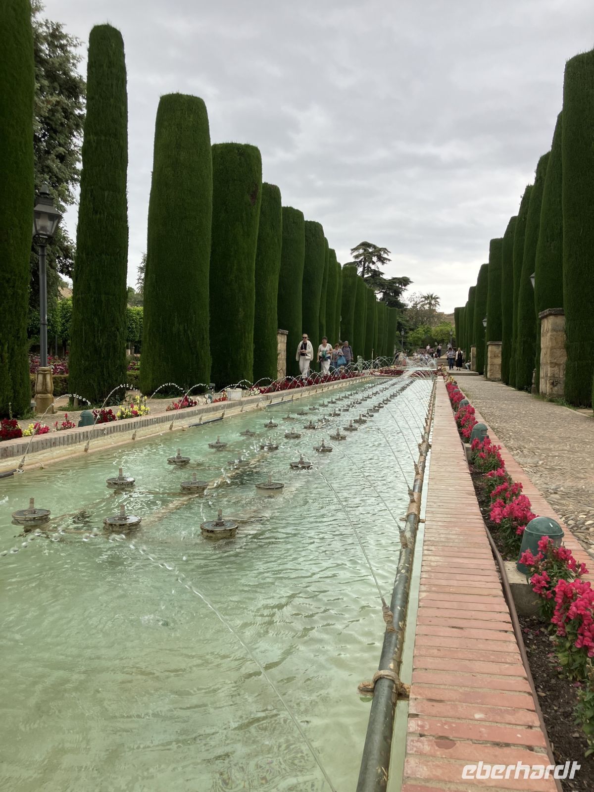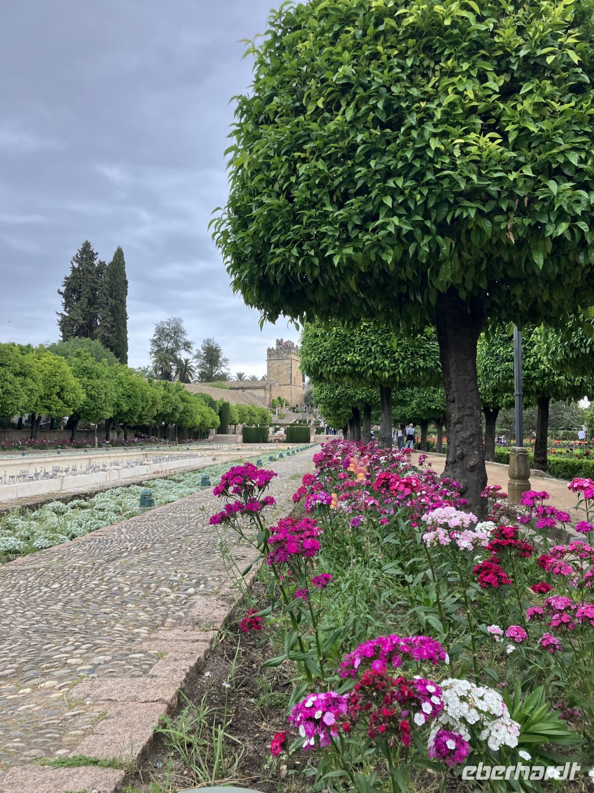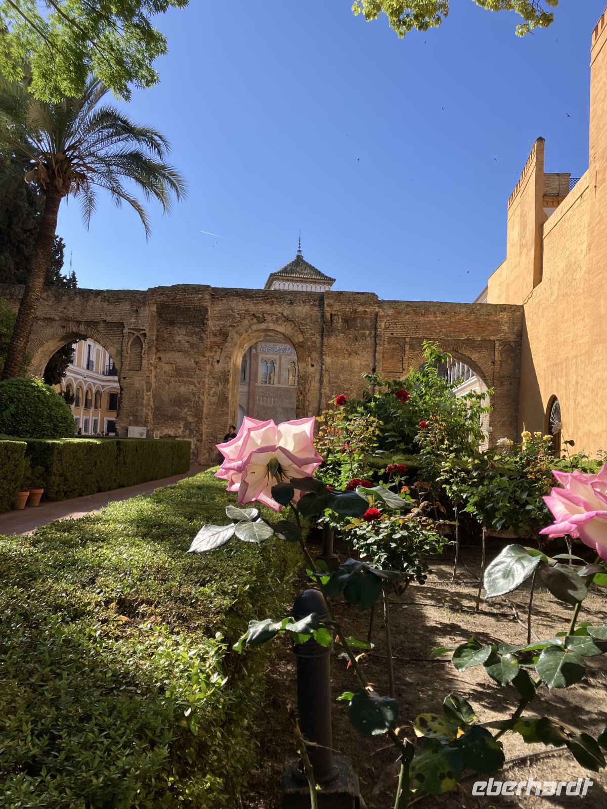 Und wir schlenderten zum Alcázar, genauer gesagt zur Alcazaba, der maurischen Festung, die majestätisch über der Stadt thront. Von außen betrachtet, mit ihren roten Ziegelmauern und den üppigen Gärten, wirkte sie wie aus einem Märchenbuch. Die Palmen wiegten sich sanft im Wind, und der Duft von Orangenblüten lag in der Luft. Wir machten Fotos vor den alten Toren und ließen die Geschichte auf uns wirken – fast konnten wir die Schritte der Sultane von einst hören.