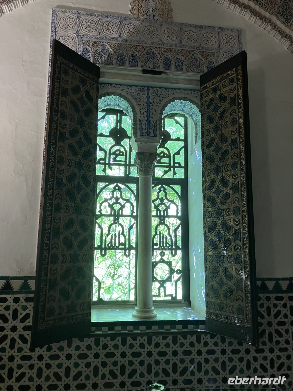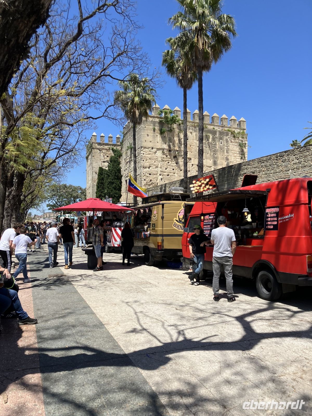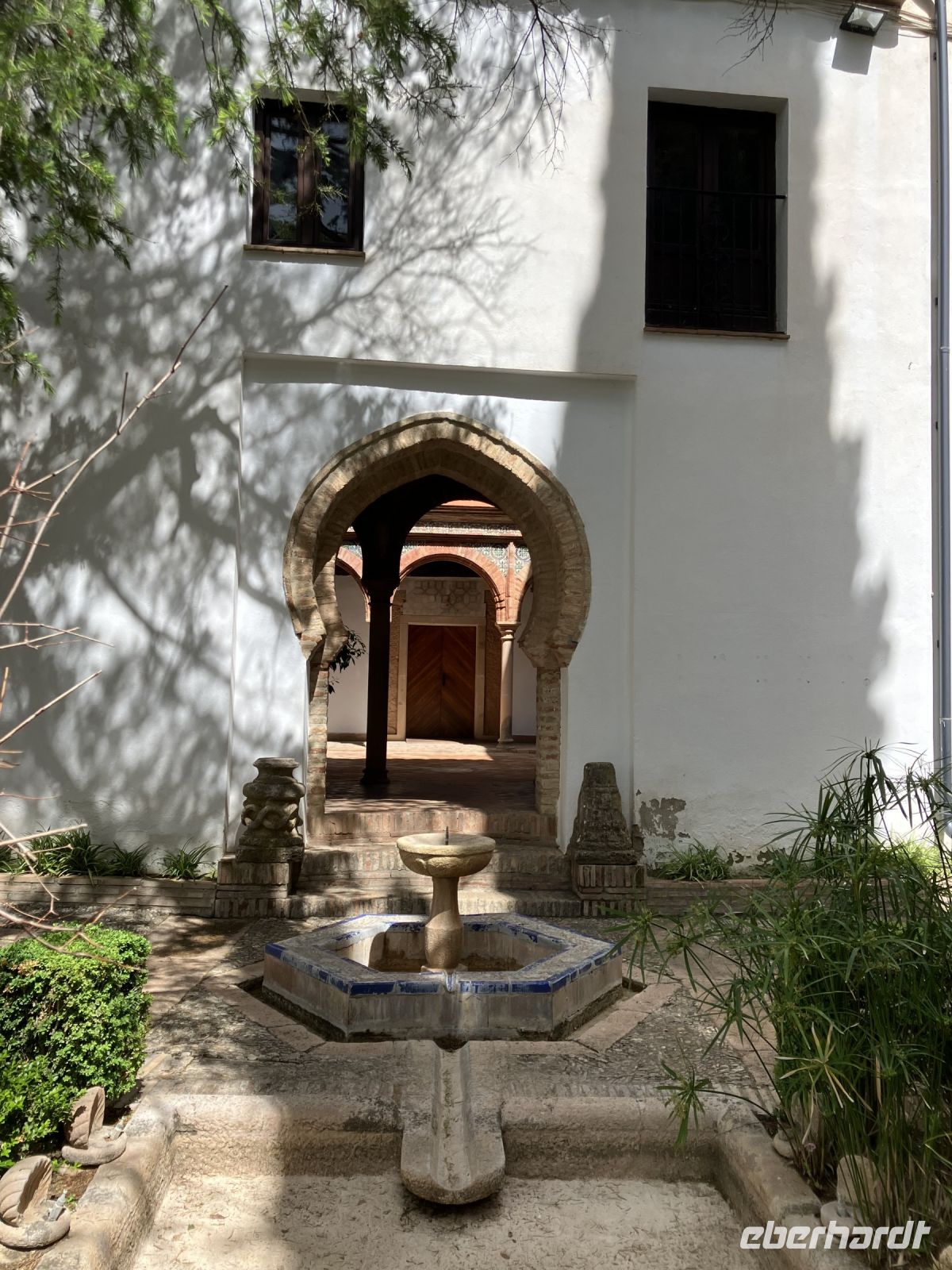 Und wir schlenderten zum Alcázar, genauer gesagt zur Alcazaba, der maurischen Festung, die majestätisch über der Stadt thront. Von außen betrachtet, mit ihren roten Ziegelmauern und den üppigen Gärten, wirkte sie wie aus einem Märchenbuch. Die Palmen wiegten sich sanft im Wind, und der Duft von Orangenblüten lag in der Luft. Wir machten Fotos vor den alten Toren und ließen die Geschichte auf uns wirken – fast konnten wir die Schritte der Sultane von einst hören.