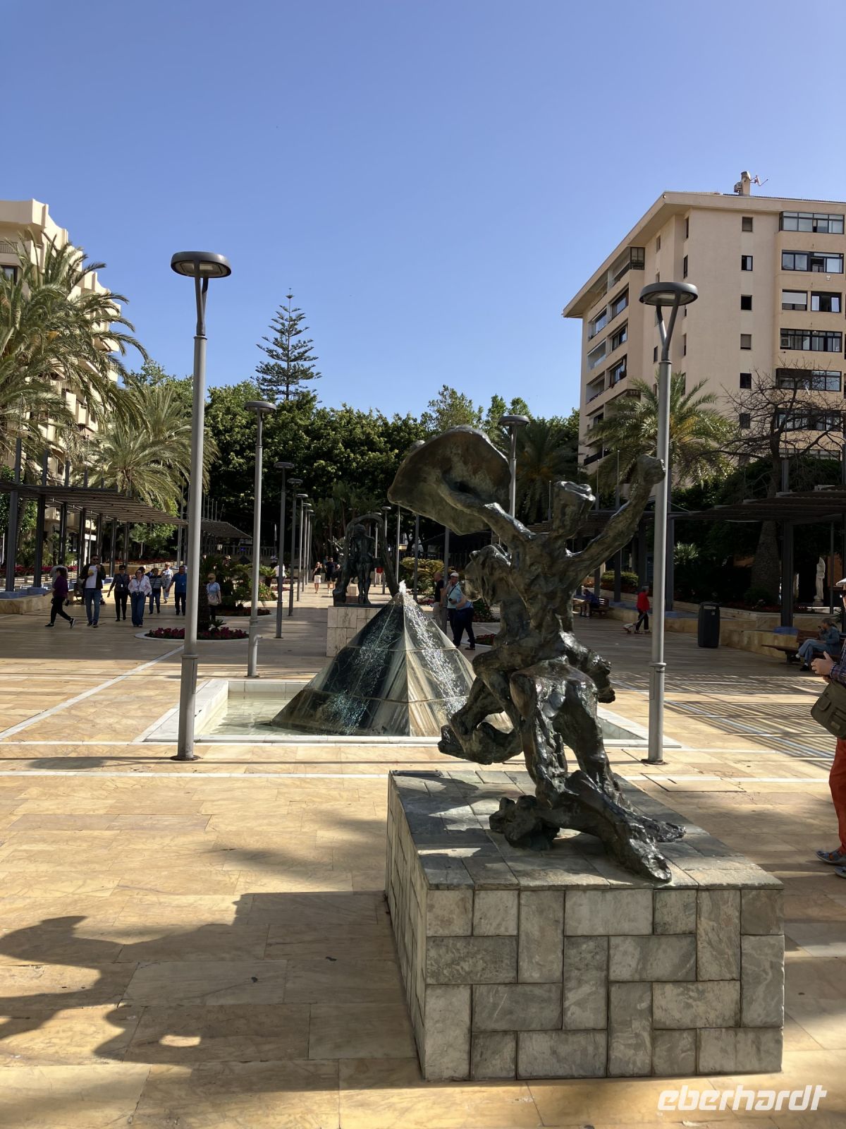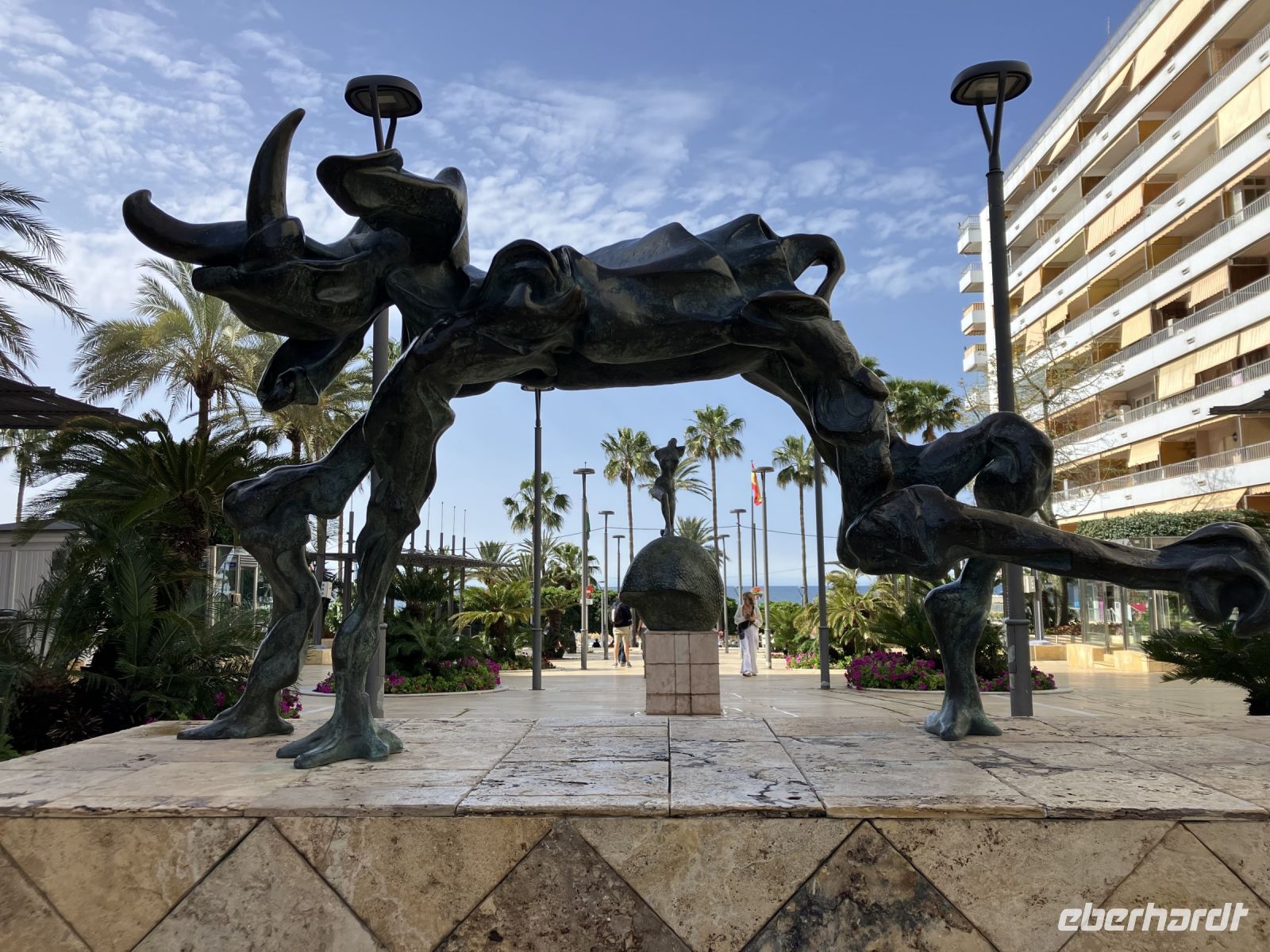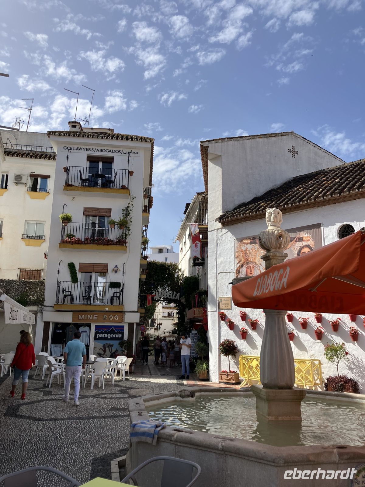 Von dort ging es weiter zum Paseo Dalí, einer kleinen Allee, die mit Skulpturen des exzentrischen Künstlers gespickt ist. Naja, vielleicht sind sie von Dalí. Genau weiß man das ja nicht. Trotzdem konnten wir nicht widerstehen, ein paar skurrile Fotos mit den surrealen Kunstwerken zu machen. Weiter bummelten wir durch die engen, blumengeschmückten Gassen der Altstadt zum Plaza de los Naranjos, mitten im Herzen von Marbella. Der traumhafte Platz ist umgeben von duftenden Orangenbäumen und lebhaften Cafés. Die Luft war erfüllt vom Aroma frisch gebrühten Kaffees, und wir wunderten uns, wie lebendig es auf dem Platz schon zuging. Hier nahmen wir uns etwas Zeit. Die meisten von uns ließen sich in einem der gemütlichen Cafés nieder, nippten an einem cremigen Café con leche und beobachteten das bunte Treiben. Einige stöberten in den kleinen Läden nach Souvenirs, während andere einfach die Sonne und die entspannte Atmosphäre genossen. Schmunzelnd stellten wir fest, dass die Frauen es bedauerten, dass wir nicht mehr Freizeit hatten, aber einige Männer eher froh darüber waren.