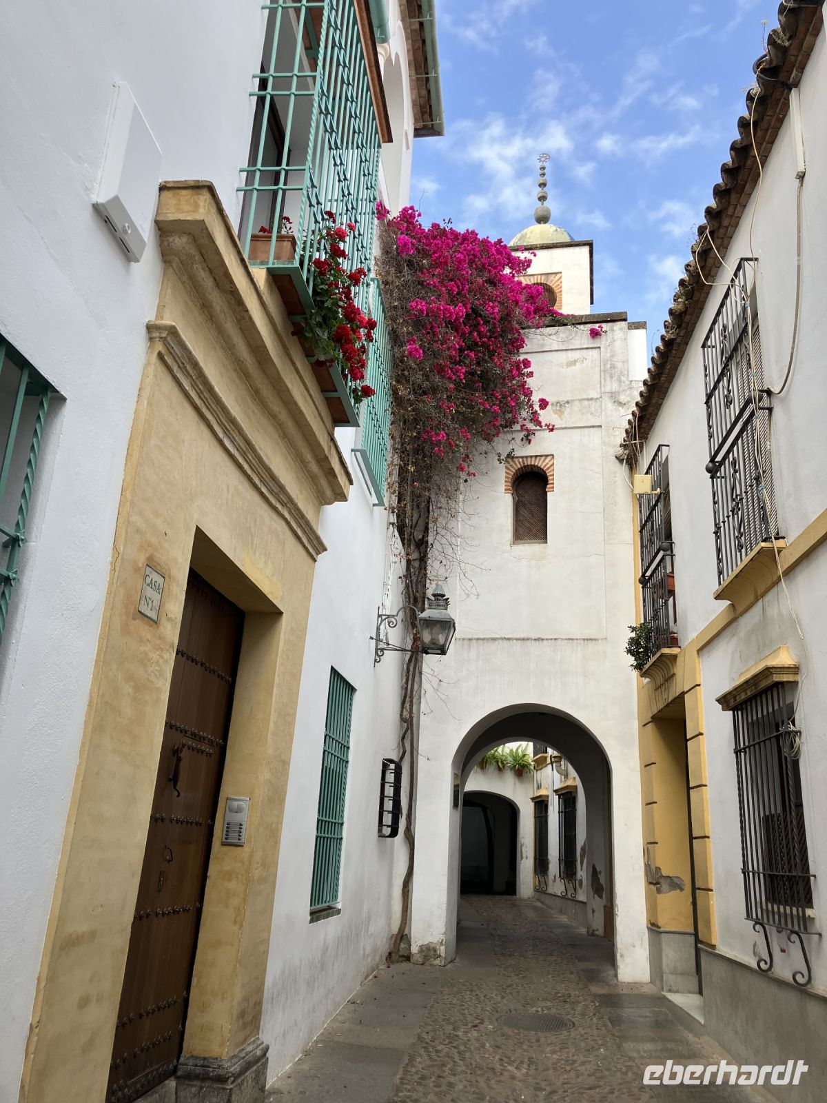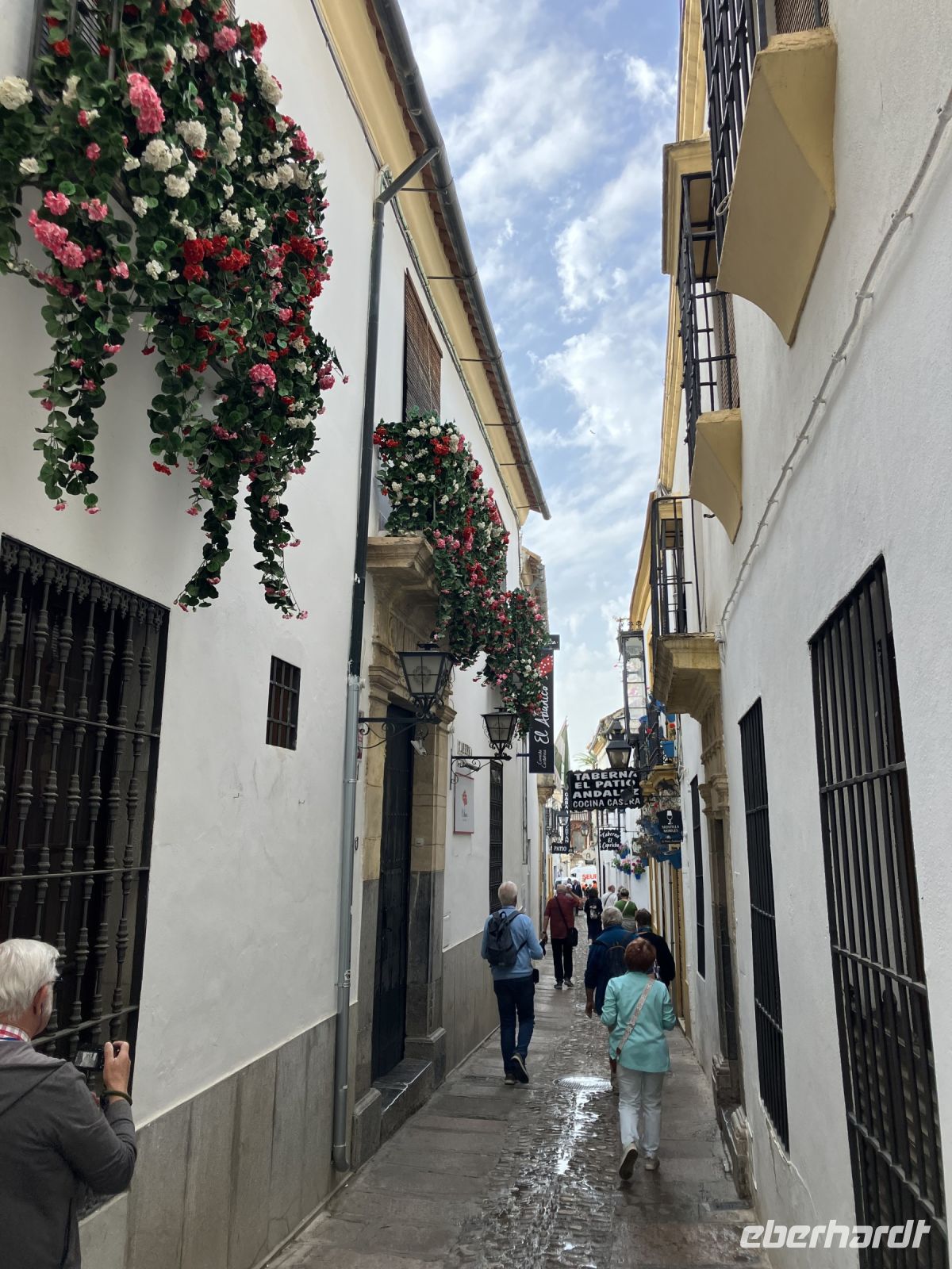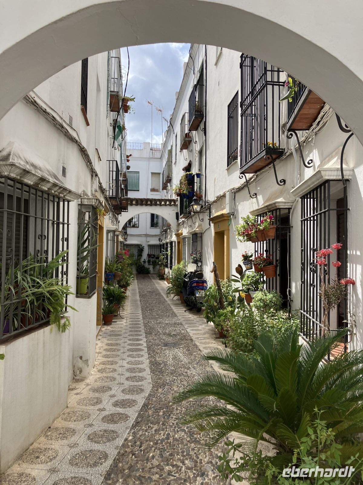 Direkt nach dem Frühstück trafen wir unsere Reiseführerin Inés vor unserem Hotel in der Altstadt, dem Herzen des einstigen Al-Andalus. Sie führte uns ins Judería, das jüdische Viertel, dessen enge Gassen seit dem 10. Jahrhundert von sephardischen Juden belebt wurden. Unser erster Stopp war die Synagoge, erbaut 1315, eine der wenigen erhaltenen in Spanien. Ihre filigranen Stuckarbeiten und hebräischen Inschriften erzählten von einer Zeit, in der Juden, Muslime und Christen in Córdoba koexistierten. Wir schlenderten weiter, warfen Blicke in blumengeschmückte Patios – typisch für Córdoba, wo die Innenhöfe seit maurischer Zeit das Leben prägen – und erreichten die berühmte Blumengasse, die Calleja de las Flores. Mit der Mezquita im Hintergrund war es, als posiere die Stadt extra für ein Postkartenfoto für uns. Und das Beste war, wir hatten diese kleine Gasse um diese Uhrzeit fast für uns allein.