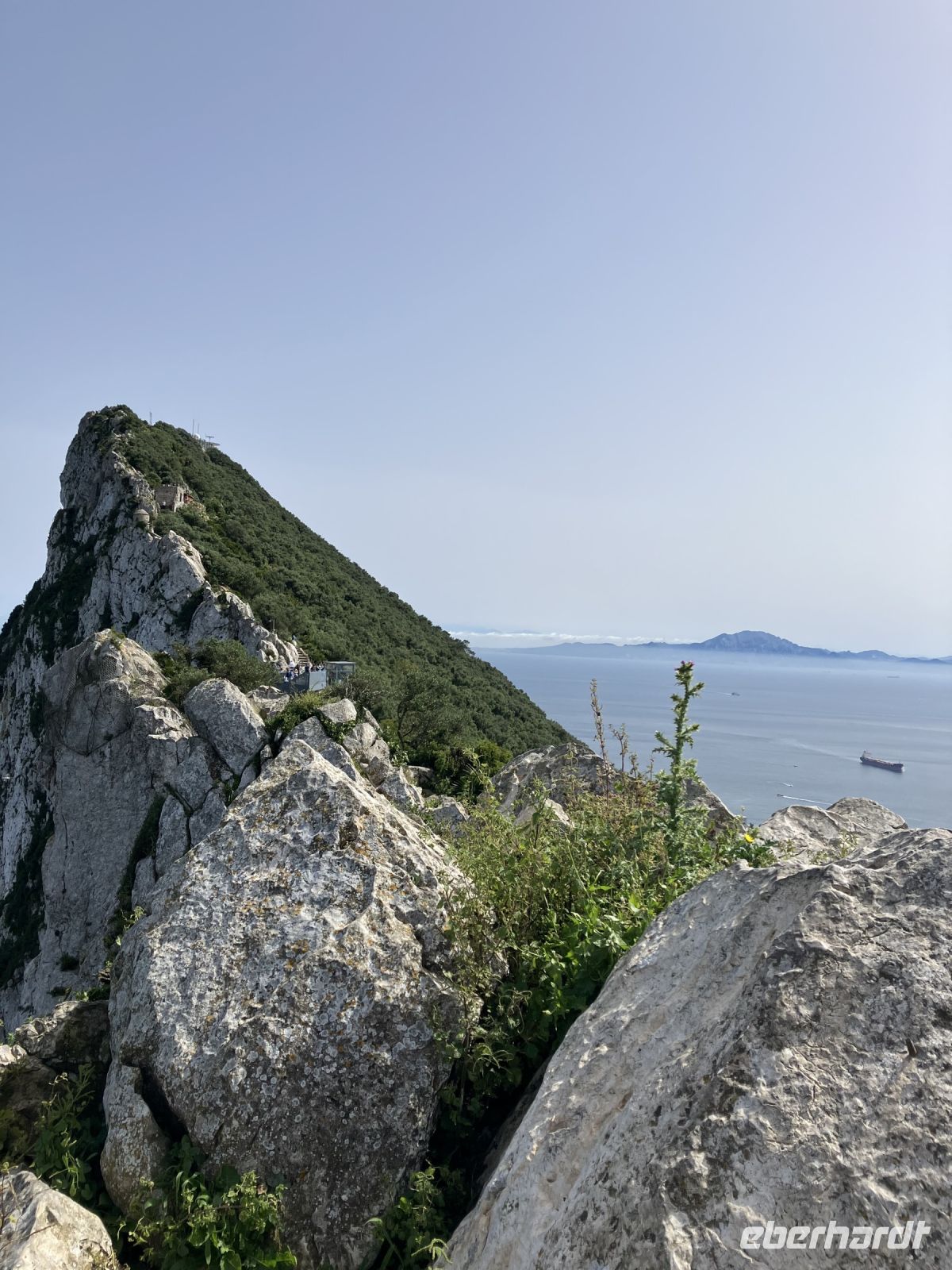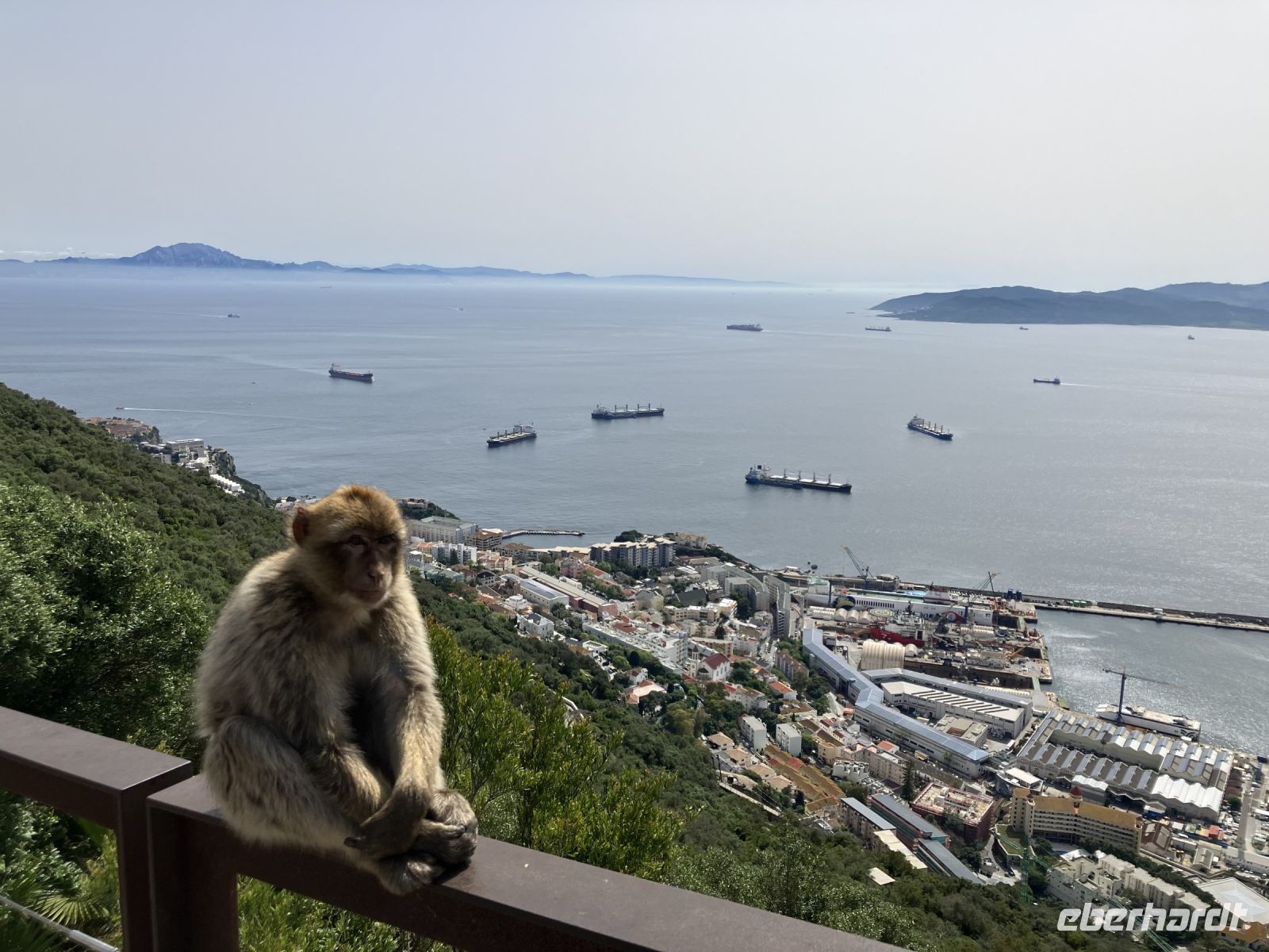 Am frühen Nachmittag machten wir uns auf nach Gibraltar, wo uns das britische Flair mitten in Andalusien erwartete. Schnell war die Grenze überquert, wo sich die Gruppe aufteilte. Einige entschieden sich für eine Rundfahrt mit einem Kleinbus durch “England”, vorbei an historischen Stätten wie dem Europa Point mit seinem Leuchtturm und der beeindruckenden Ibrahim-al-Ibrahim-Moschee. Andere, darunter ich, wollten den berühmten Felsen von Gibraltar mit der Seilbahn erklimmen. Leider mussten wir an der Talstation über eine halbe Stunde warten, da die Seilbahn gut besucht war. Die Vorfreude stieg mit jeder Minute, auch wenn uns die Wartezeit ein paar kostbare Minuten raubte. Doch als wir endlich in der Gondel nach oben schwebten, war jede Sekunde vergessen! Der Blick über die Meerenge von Gibraltar, mit Afrika am Horizont, war atemberaubend. Oben angekommen, begrüßten uns die frechen Berberaffen, die neugierig an uns vorbeiflitzen. Einige versuchten sogar, unsere Taschen zu inspizieren – was für ein Spaß! Die Aussicht von der Spitze des Felsens war überwältigend: das türkisfarbene Meer, die Küste Spaniens und die Silhouette Marokkos in der Ferne. Wir fühlten uns, als stünden wir auf dem Dach der Welt. Jetzt hiess es aber flott zurück zum Treffpunkt laufen.