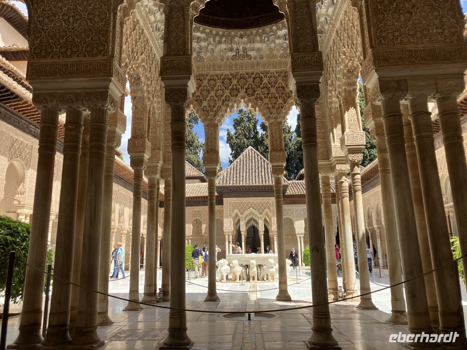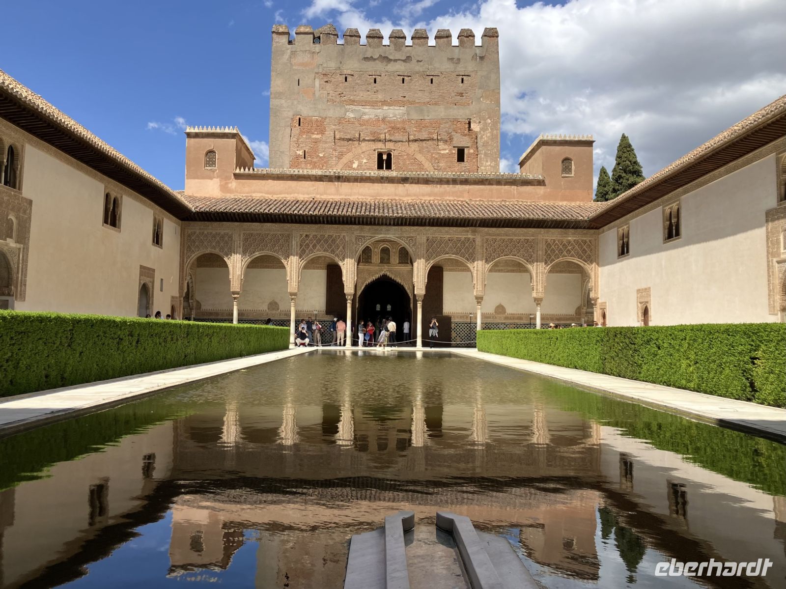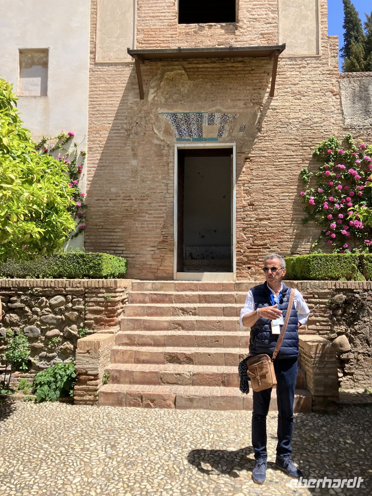 Trotz der frühen Morgenstunde schloss sich mir die gesamte Gruppe für einen Spaziergang an, der uns zum Mirador San Nicolás führte. Der Aufstieg durch die verwinkelten Gassen des Albaicín, dessen Ursprünge auf die Ziriden-Dynastie des 11. Jahrhunderts zurückgehen, lohnte sich: Wo sonst Hunderte die Alhambra bestaunen, waren wir ganz allein. Die Morgenluft war klar, die Sierra Nevada im Hintergrund schimmerte, und die Alhambra, seit dem 13. Jahrhundert ein Meisterwerk der Nasriden, erstrahlte im ersten Licht des Tages. Unsere Foto-Session hier war legendär: erst die Männer vor der Alhambra, dann die Frauen, Sabine mit den Männern, die Paare einzeln – wir konnten nicht genug bekommen. Weiter ging’s bergauf durch die Gassen des Albaicín, einst das muslimische Herz Granadas, bis zum kürzlich wiedereröffneten Höhlenmuseum im Sacromonte. Hier tauchten wir in das Leben der “Gitanos” ein, deren Höhlenwohnungen seit dem 16. Jahrhundert die Heimat von Flamenco und Gemeinschaft waren. Die Ausstellung zeigte, wie sie trotz Widrigkeiten ihre Kultur bewahrten. Mit dem öffentlichen Bus fuhren wir zurück zum Hotel, um Kräfte für den Nachmittag zu “sparen”, denn es erwartete uns ja noch die Alhambra, die „Rote Burg“, deren Name vom arabischen „Al-Qal’a al-Hamra“ stammt. Unser charmanter Guide Pedro nannte uns seine „Familia“ und führte uns durch die Festung, die im 13. Jahrhundert unter den Nasriden ihre heutige Pracht erhielt. Mit seinen Erläuterungen war es, als blickten wir „in die Werkstatt der damaligen Zeit“: die filigranen Stuckarbeiten, die Hufeisenbögen und die reflektierenden Wasserbecken erzählten von maurischer Ingeniosität. Die Gärten des Generalife, ein Sommerpalast seit dem 14. Jahrhundert, verzauberten uns mit Rosen und plätschernden Brunnen. „Hier könnte man ewig verweilen“, seufzte der ein oder andere, während wir durch die Nasridenpaläste schlenderten. Nach der Führung konnten die Unermüdlichen bleiben, während andere mit unserem Busfahrer Tulio zurückfuhren. Ich führte unsere kleine Gruppe zu Fuß durch die Parkanlagen zurück zum Hotel, die Wege gesäumt von duftenden Bitterorangenblüten.