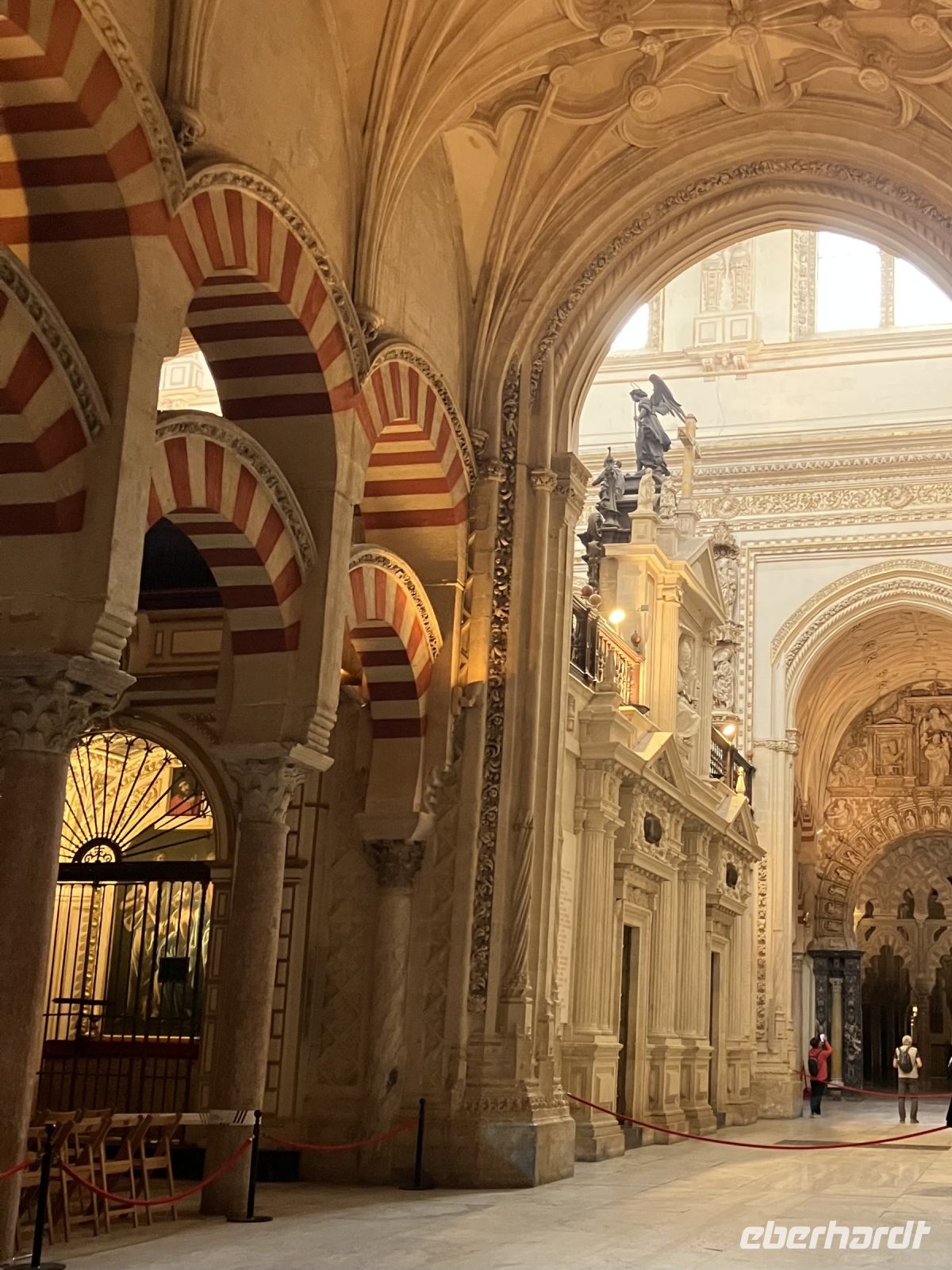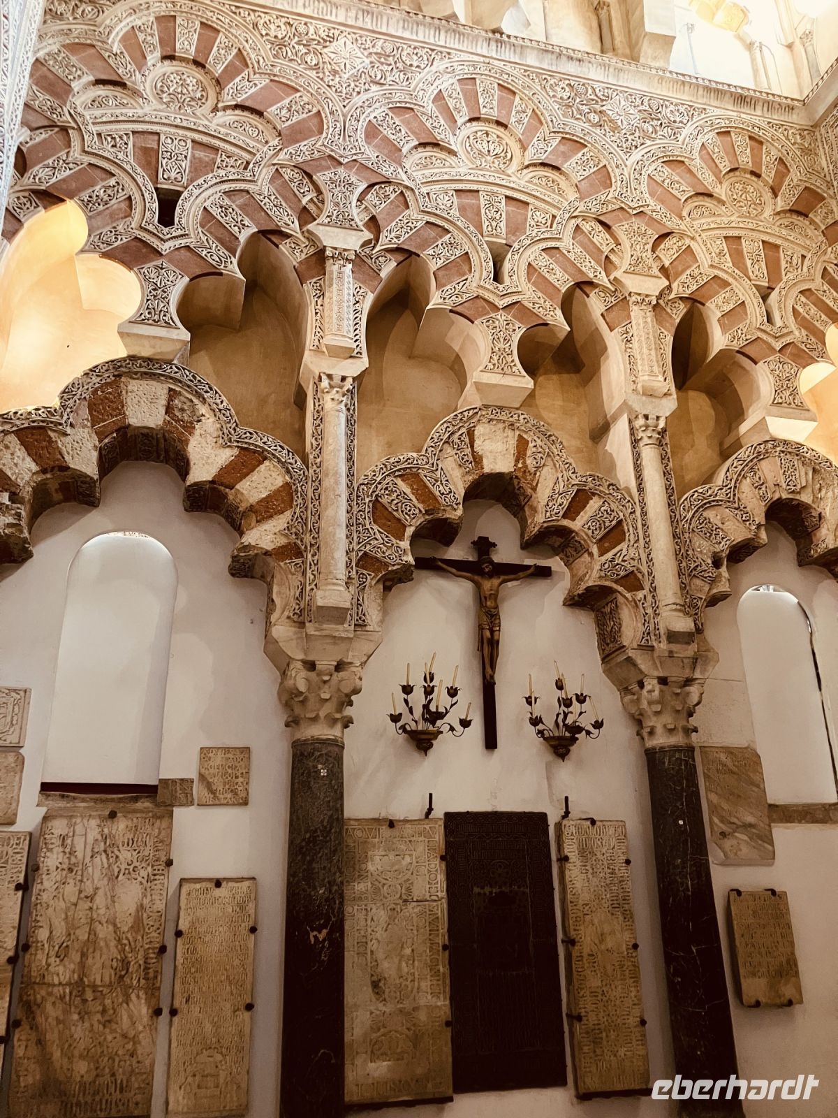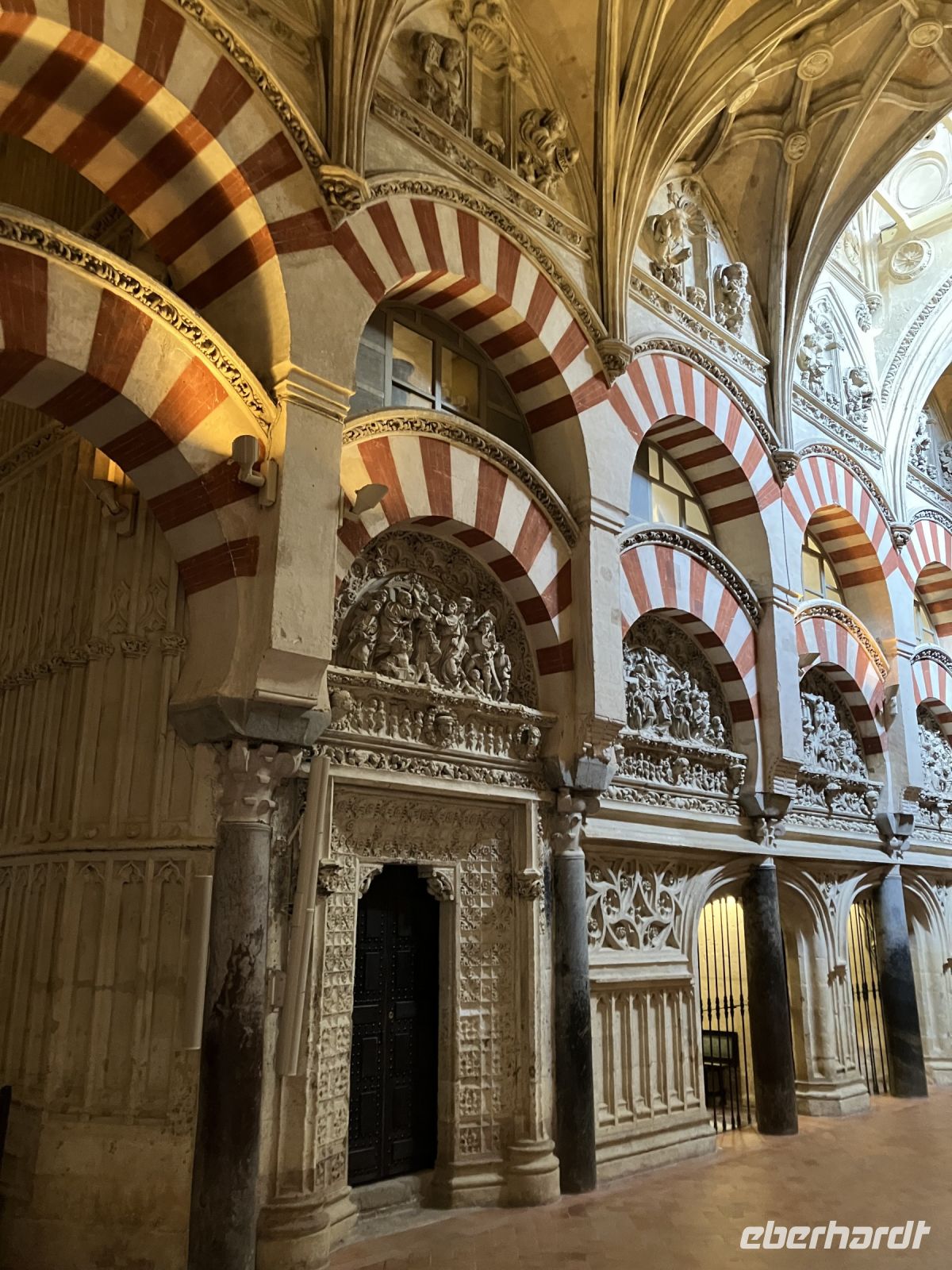 Dann erfüllte sich für viele aus der Gruppe der lang ersehnte Wunsch: die Mezquita-Catedral sehen. Die Kathedralen-Moschee, deren Bau 785 unter den Umayyaden begann, zog uns genauso an wie Menschen aus der ganzen Welt. Vor dem Eingang wartete bereits Schlange, doch es dauerte nicht lange, bis wir im Säulenwald aus 856 Bögen standen. Die rot-weißen Hufeisenbögen, inspiriert von römischen Aquädukten, schufen eine fast hypnotische Atmosphäre. Hier stehend, verstanden wir, was Karl V. meinte, der die gotische Kathedrale inmitten der Moschee erbauen ließ und gesagt haben soll: „Ihr habt zerstört, was einzigartig war, um etwas zu bauen, das man überall sehen kann.“ Nach der Führung verabschiedete sich Inés, und wir erkundeten die Mezquita auf eigene Faust – jeder fand andere wunderbare Details zwischen den Säulen.