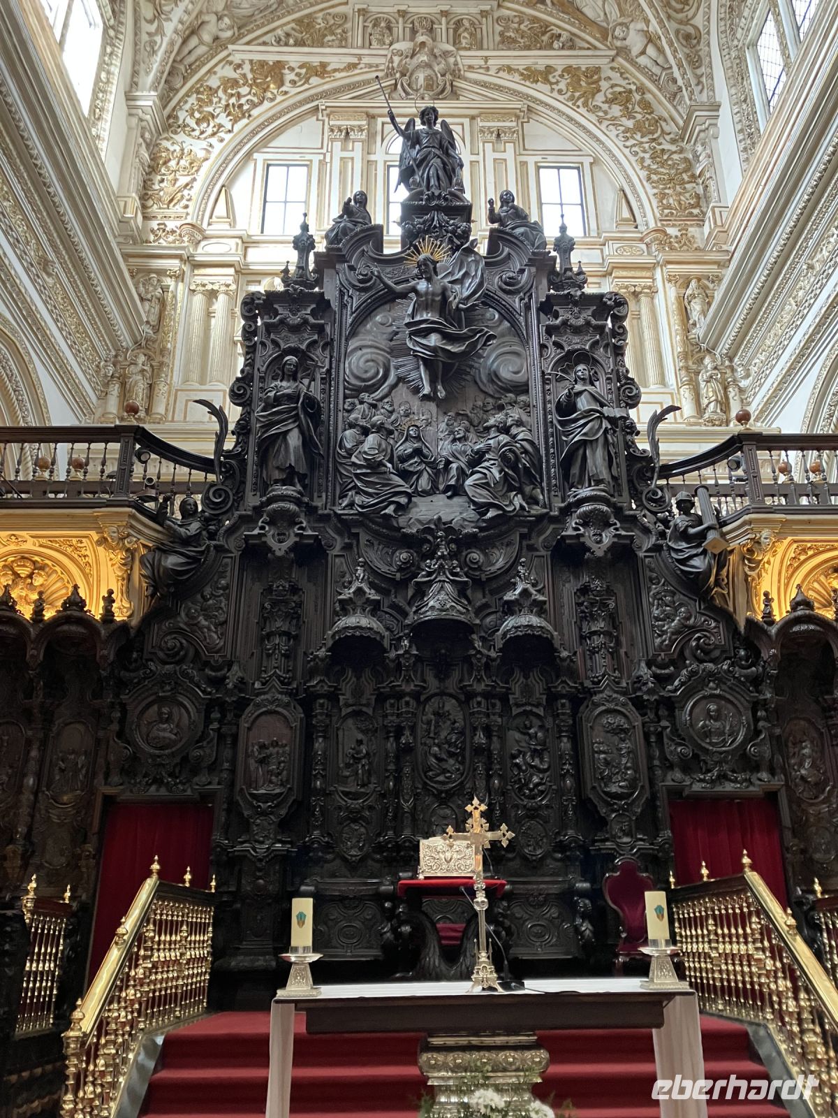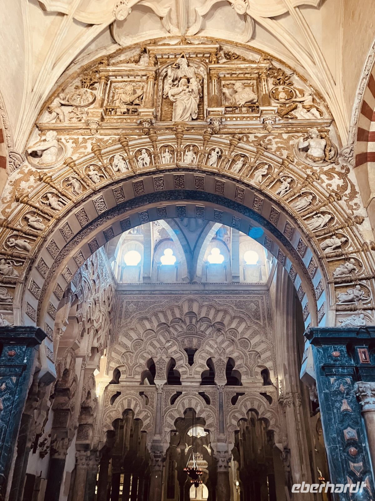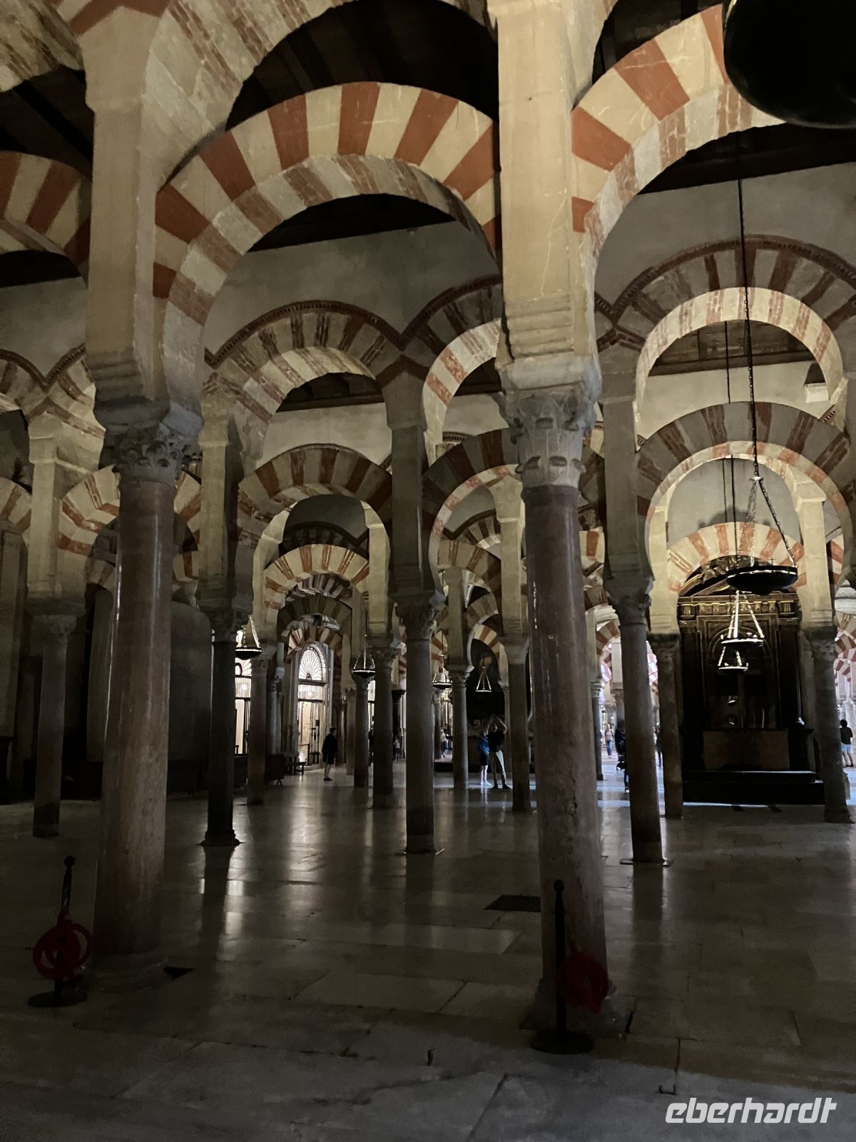 Dann erfüllte sich für viele aus der Gruppe der lang ersehnte Wunsch: die Mezquita-Catedral sehen. Die Kathedralen-Moschee, deren Bau 785 unter den Umayyaden begann, zog uns genauso an wie Menschen aus der ganzen Welt. Vor dem Eingang wartete bereits Schlange, doch es dauerte nicht lange, bis wir im Säulenwald aus 856 Bögen standen. Die rot-weißen Hufeisenbögen, inspiriert von römischen Aquädukten, schufen eine fast hypnotische Atmosphäre. Hier stehend, verstanden wir, was Karl V. meinte, der die gotische Kathedrale inmitten der Moschee erbauen ließ und gesagt haben soll: „Ihr habt zerstört, was einzigartig war, um etwas zu bauen, das man überall sehen kann.“ Nach der Führung verabschiedete sich Inés, und wir erkundeten die Mezquita auf eigene Faust – jeder fand andere wunderbare Details zwischen den Säulen.