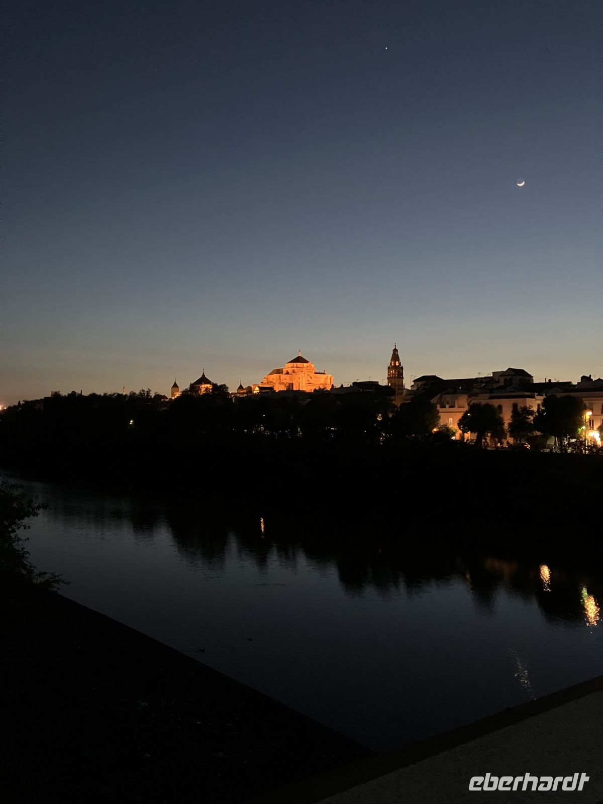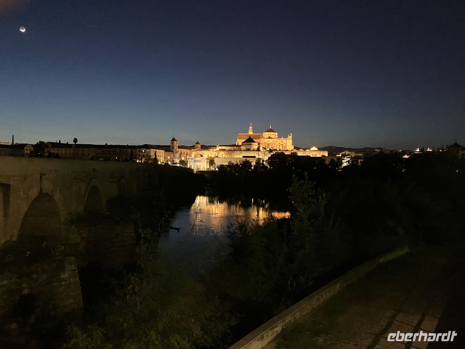 Am frühen Abend erreichten wir unser Hotel mitten in Córdobas Altstadt, einst das Herz des maurischen Al-Andalus. Nach einem köstlichen Abendessen mit der Vorspeise Mazamora, einer kalten Mandelcremesuppe mit Wurzeln in der maurischen Küche, überredete ich die Gruppe noch zu einem Spaziergang auf die andere Seite des Guadalquivir. Das nächtliche Córdoba, mit seinen Lichtern und der erleuchteten Mezquita, war atemberaubend. „Die Nacht zeigt, was der Tag verbirgt“, wusste schon Paul Valéry, und wir alle genossen die Magie dieses Anblicks.