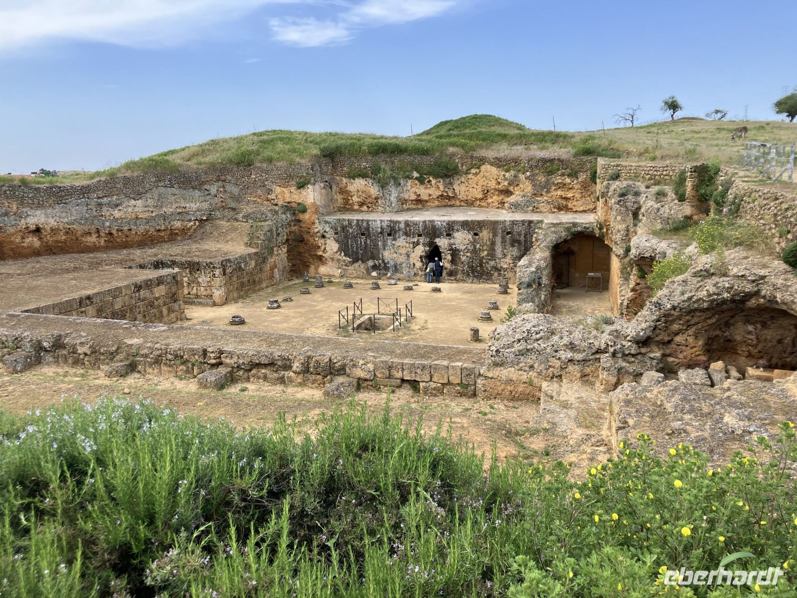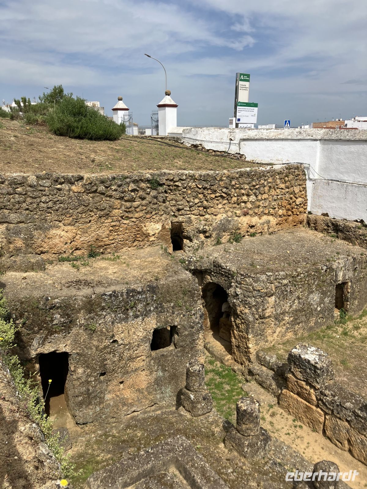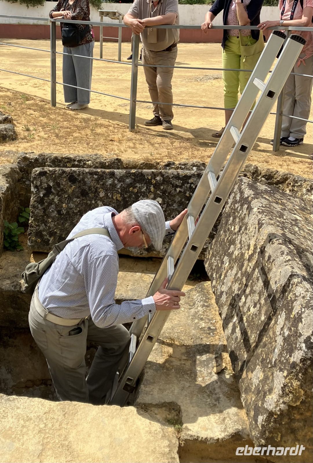 Weiter ging es nach Carmona, wo die römische Nekropolis aus dem 1. Jahrhundert v. Chr. uns in die Welt der Römer entführte. Die in den Felsen gehauenen Gräber, einst für wohlhabende Familien, zeugen von römischen Bestattungsritualen, bei denen man glaubte, die Toten bewachen die Lebenden. Einige Mutige unter uns kletterten die metallenen Treppen hinab und warfen einen Blick durch die kühlen Kammern. An der grössten Grabstätte stahlen zwei Esel die Aufmerksamkeit. Wir verabschiedeten uns und begaben uns auf eine Anhöhe, wo das Parador Hotel von Carmona über der weiten Ebene trohnt. Diese Landschaft war einst Teil der römischen Provinz Baetica, ein Korn- und Öllieferant des Imperiums.