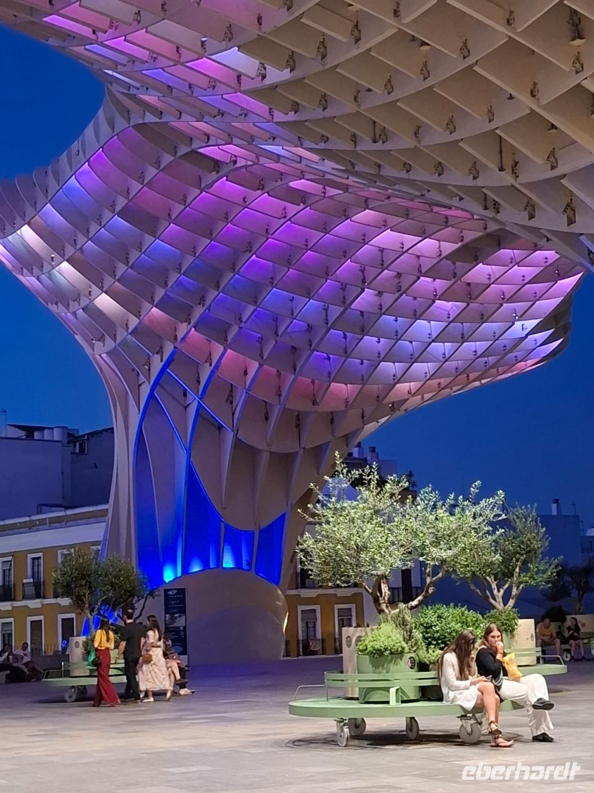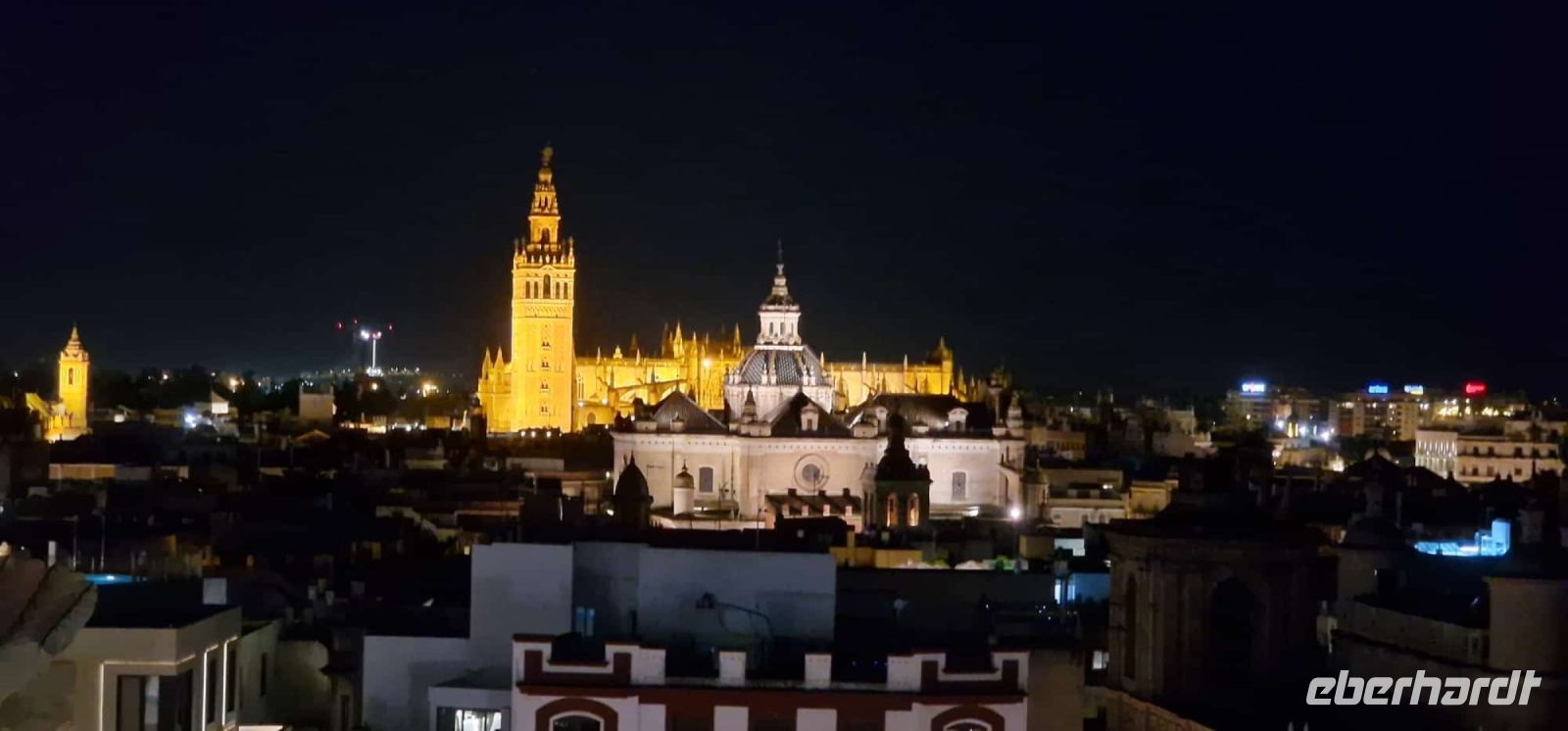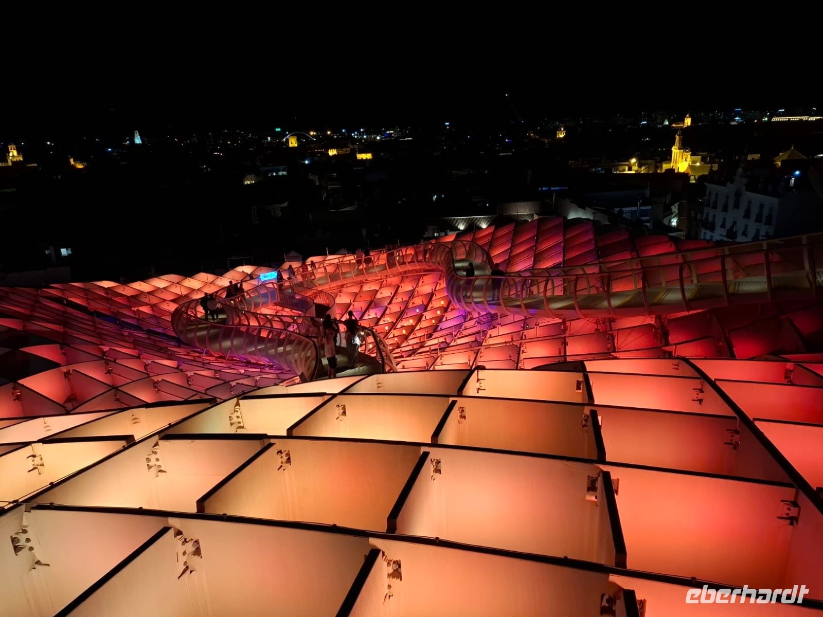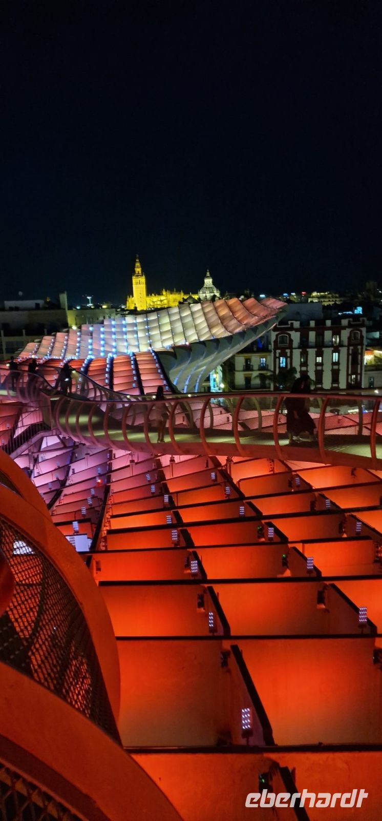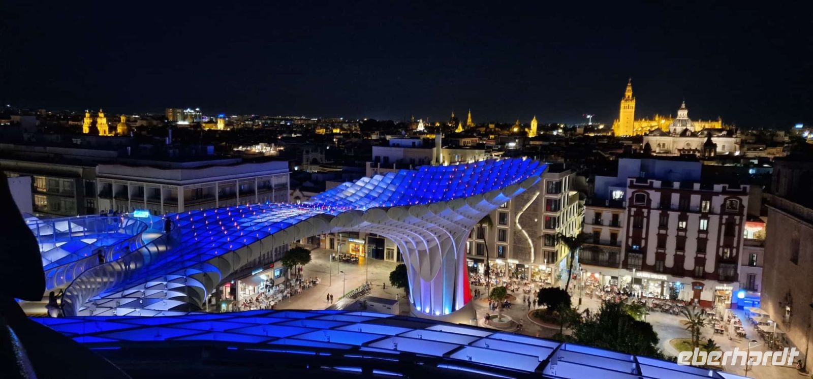 Und was für ein Erlebnis das war! Als die Sonne unterging, erstrahlte Sevilla in einem Meer aus Lichtern. Die Setas waren bunt angestrahlt, und der Ausblick über die nächtliche Stadt war einfach fantastisch. Die beleuchtete Kathedrale, der Alcázar und die funkelnden Dächer der Altstadt lagen unterhalb.