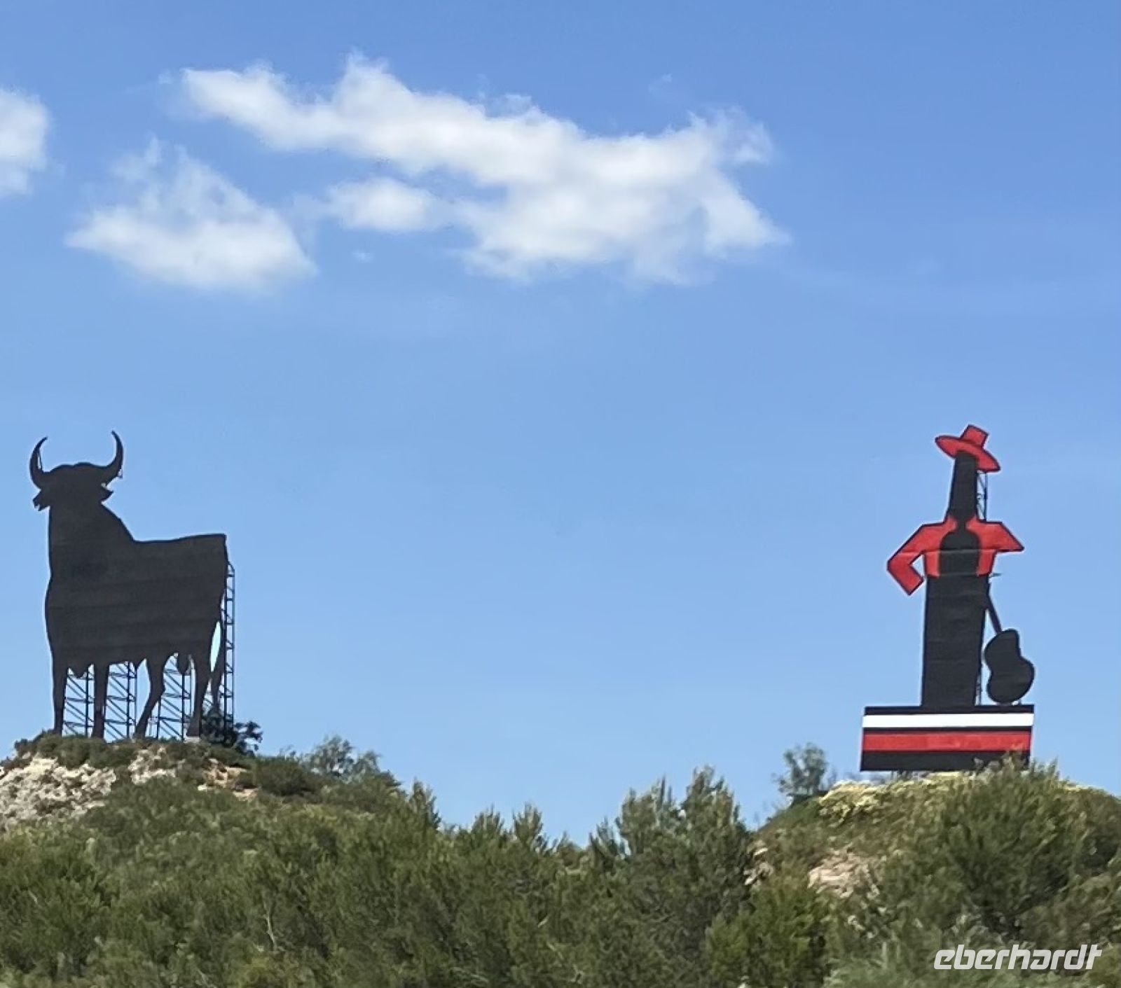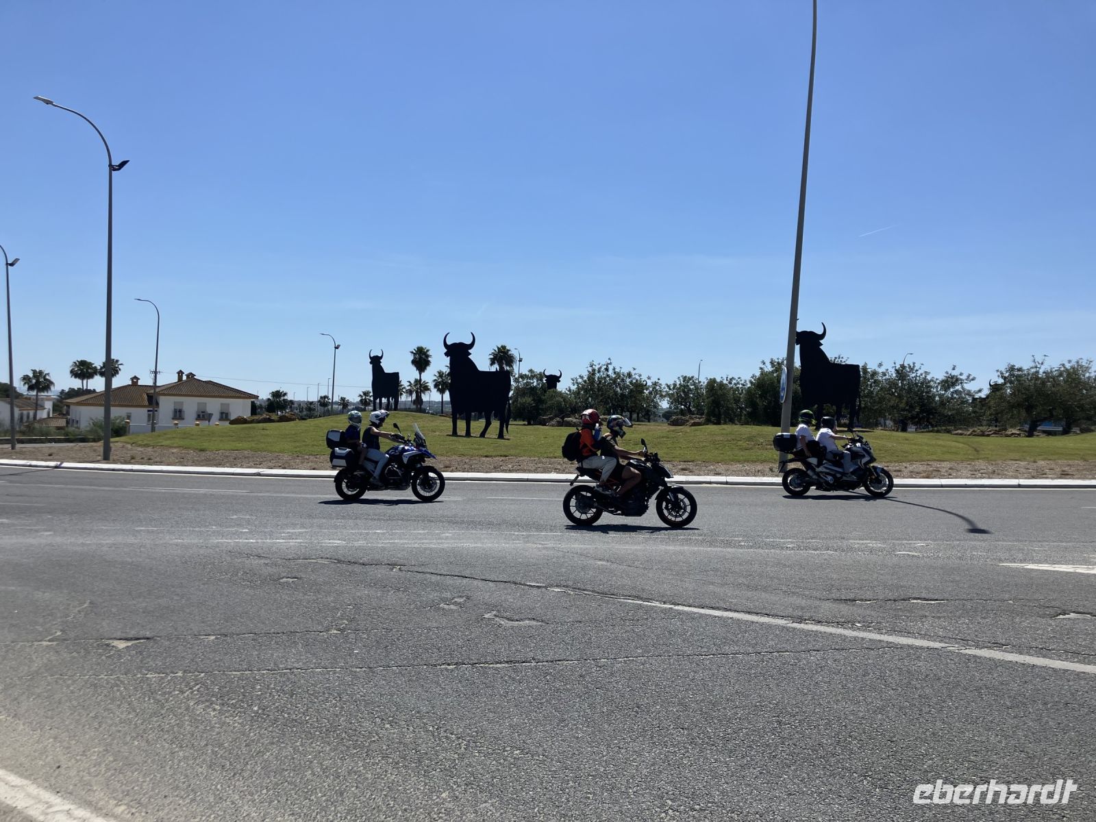 Den bestiegen wir also am Nachmittag, um durch die glitzernde Bucht von Cádiz nach El Puerto de Santa María zu fahren. Langsam entschwand die Küste von Cádiz am Horizont. In El Puerto angekommen, wartete Tulio bereits auf uns. Wir fuhren an den berühmten Bodegas von Osborne vorbei, wo der Duft von Sherry in der Luft lag. Unser Fahrer Tulio machte einen besonderen Halt am Kreisverkehr, wo die ikonischen Osborne-Stiere – die schwarzen Silhouetten, die Spaniens Landschaften zieren – in voller Pracht standen. Wir sprangen aus dem Bus für einen schnellen Fotostopp, immer Acht gebend, dass wir die immer noch überall präsenten Motorradfahrer nicht mit auf unser Foto bekamen.