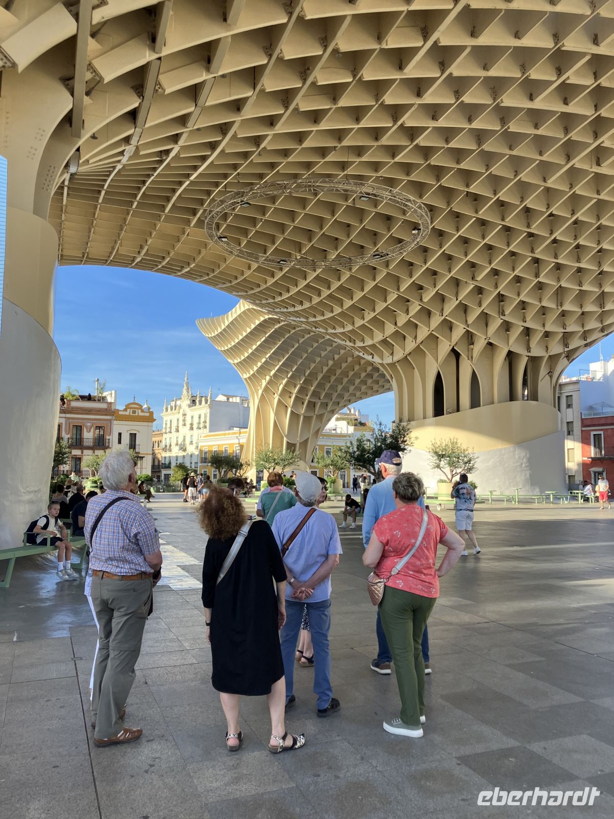 Ohne grösseren Stau erreichten wir die Hauptstadt Andalusiens, Sevilla, wo uns die pulsierende Energie der Stadt sofort in ihren Bann zog. Nach einer kleinen Erfrischungspause machten wir uns alle gemeinsam auf zu den berühmten Setas, dem Metropol Parasol. Diese futuristische Holzstruktur, die wie riesige Pilze über der Plaza de la Encarnación thront, ist ein faszinierender Kontrast zur historischen Kulisse Sevillas, die morgen auf uns wartete. Einige von uns konnten der Versuchung nicht widerstehen und kauften sofort Tickets, um am Abend die Plattform des Metropol Parasol zu erklimmen.