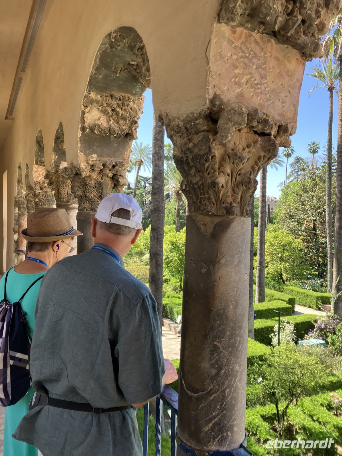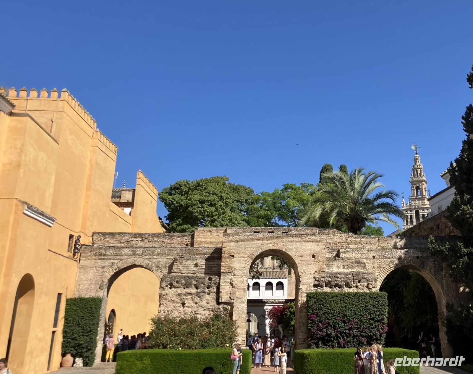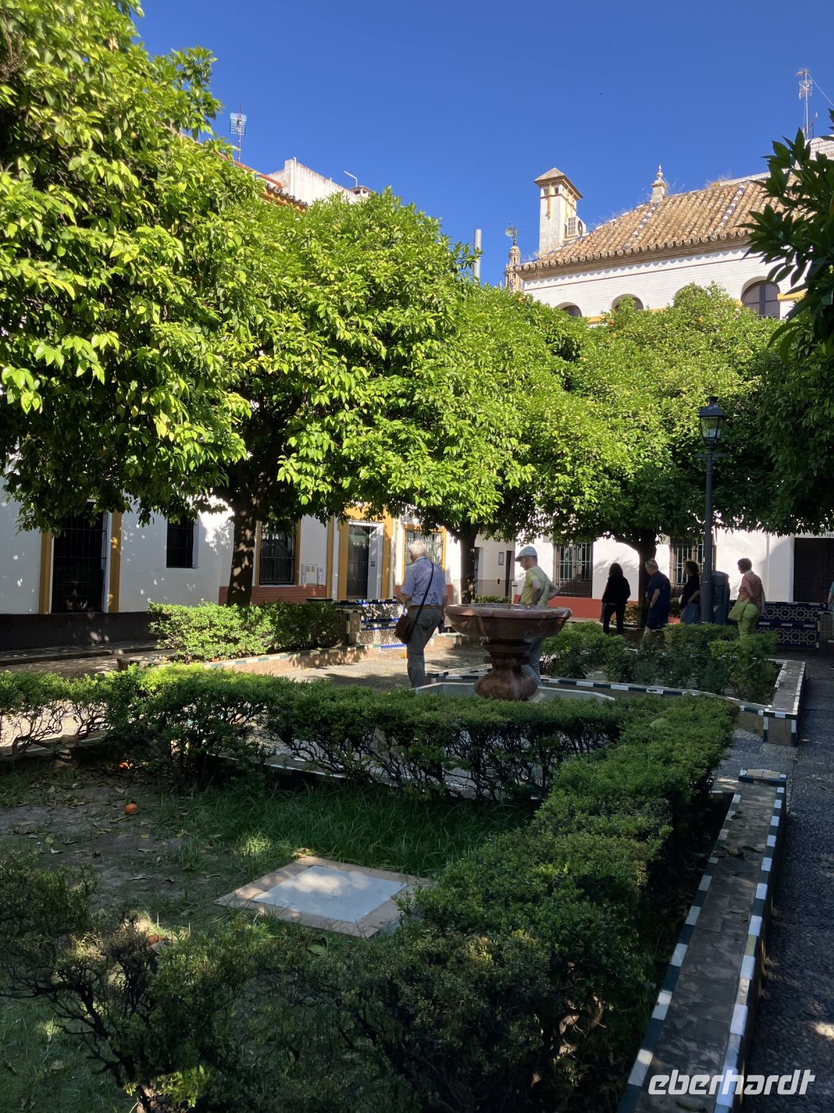 Von dort ging es weiter zum Alcázar von Sevilla, dem maurischen Palast, der uns mit seiner Pracht sprachlos machte. Die filigranen Bögen, farbenfrohen Fliesen und kunstvollen Stuckarbeiten versetzten uns in die Welt der maurischen Könige. Wir schlenderten durch die Säle, wo die Geschichte von christlichen und muslimischen Herrschern in jedem Detail spürbar war. Der Höhepunkt waren die Palastgärten, ein Paradies aus duftenden Orangenbäumen, plätschernden Brunnen und schattigen Pfauen, die stolz ihre Räder schlugen. Wir machten unzählige Fotos und genossen die Ruhe der Gärten, während Kate uns mit Anekdoten über die königlichen Bewohner unterhielt.