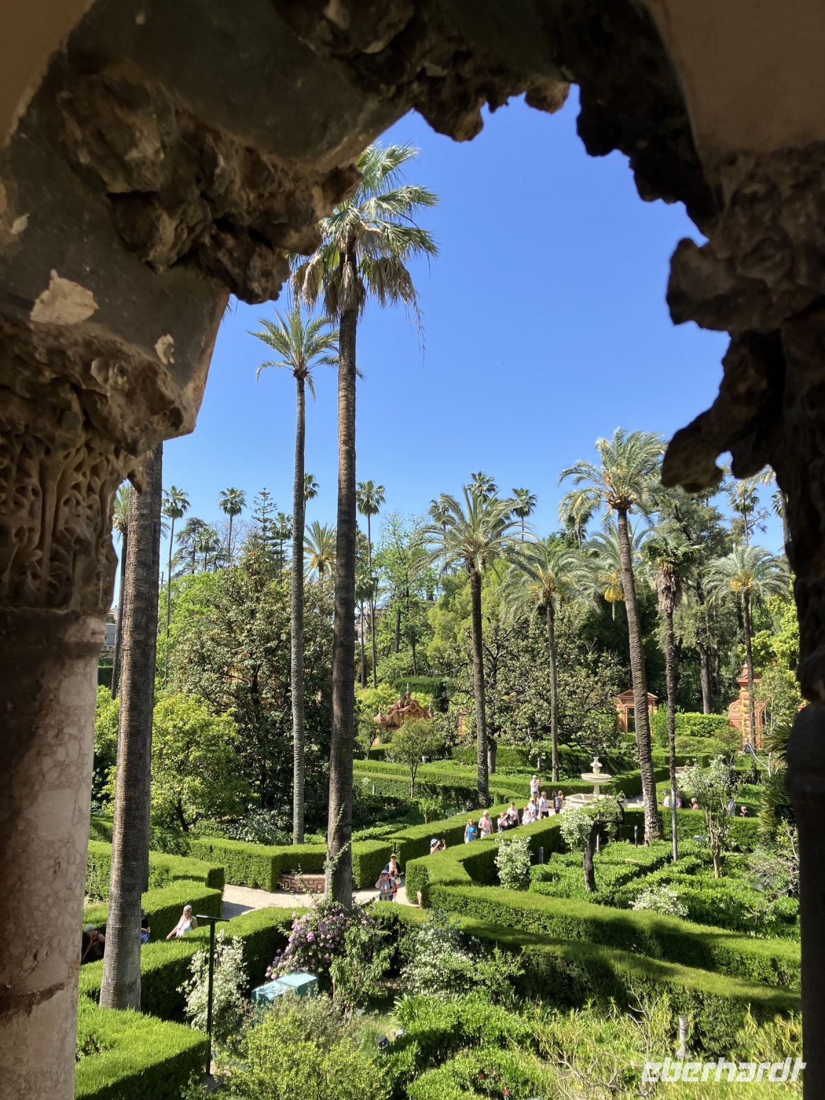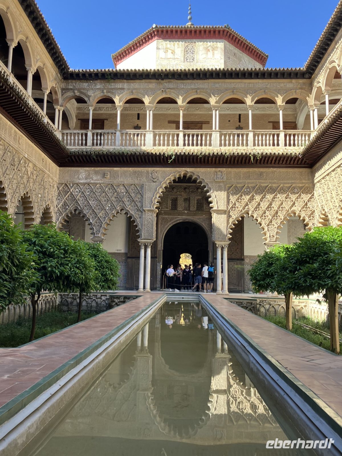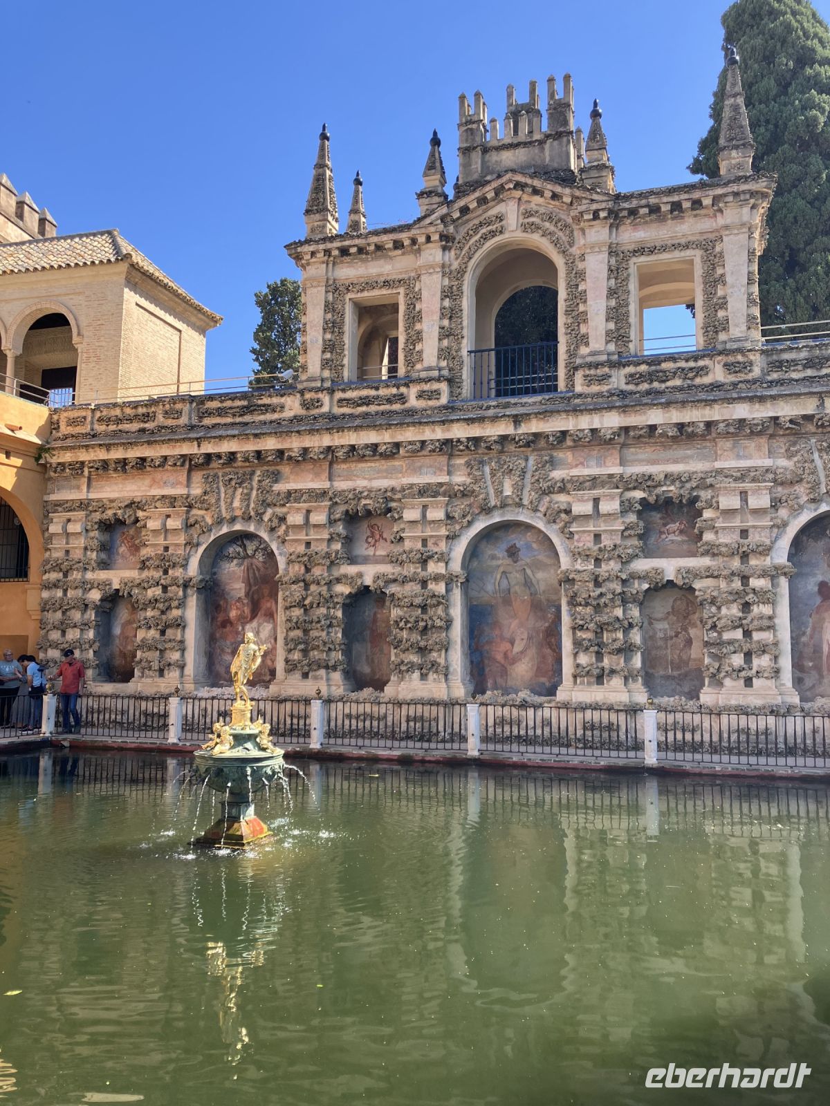 Von dort ging es weiter zum Alcázar von Sevilla, dem maurischen Palast, der uns mit seiner Pracht sprachlos machte. Die filigranen Bögen, farbenfrohen Fliesen und kunstvollen Stuckarbeiten versetzten uns in die Welt der maurischen Könige. Wir schlenderten durch die Säle, wo die Geschichte von christlichen und muslimischen Herrschern in jedem Detail spürbar war. Der Höhepunkt waren die Palastgärten, ein Paradies aus duftenden Orangenbäumen, plätschernden Brunnen und schattigen Pfauen, die stolz ihre Räder schlugen. Wir machten unzählige Fotos und genossen die Ruhe der Gärten, während Kate uns mit Anekdoten über die königlichen Bewohner unterhielt.