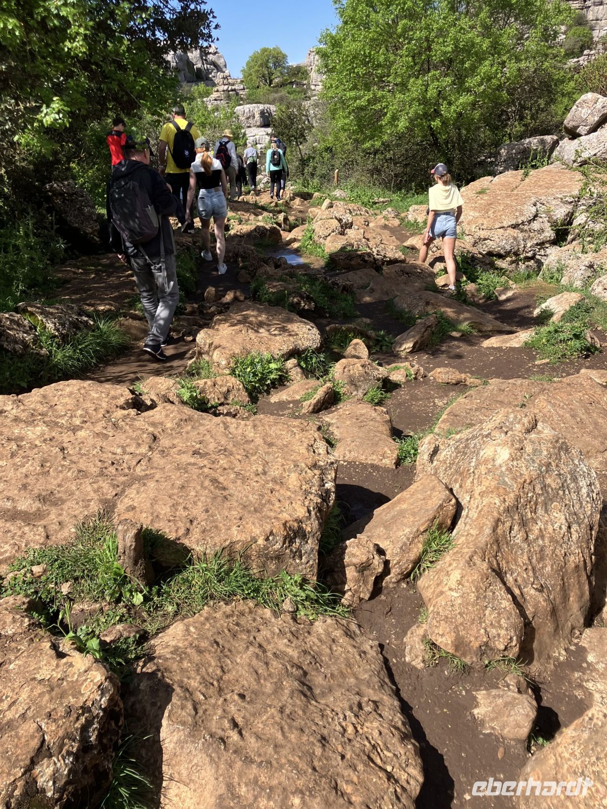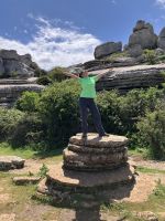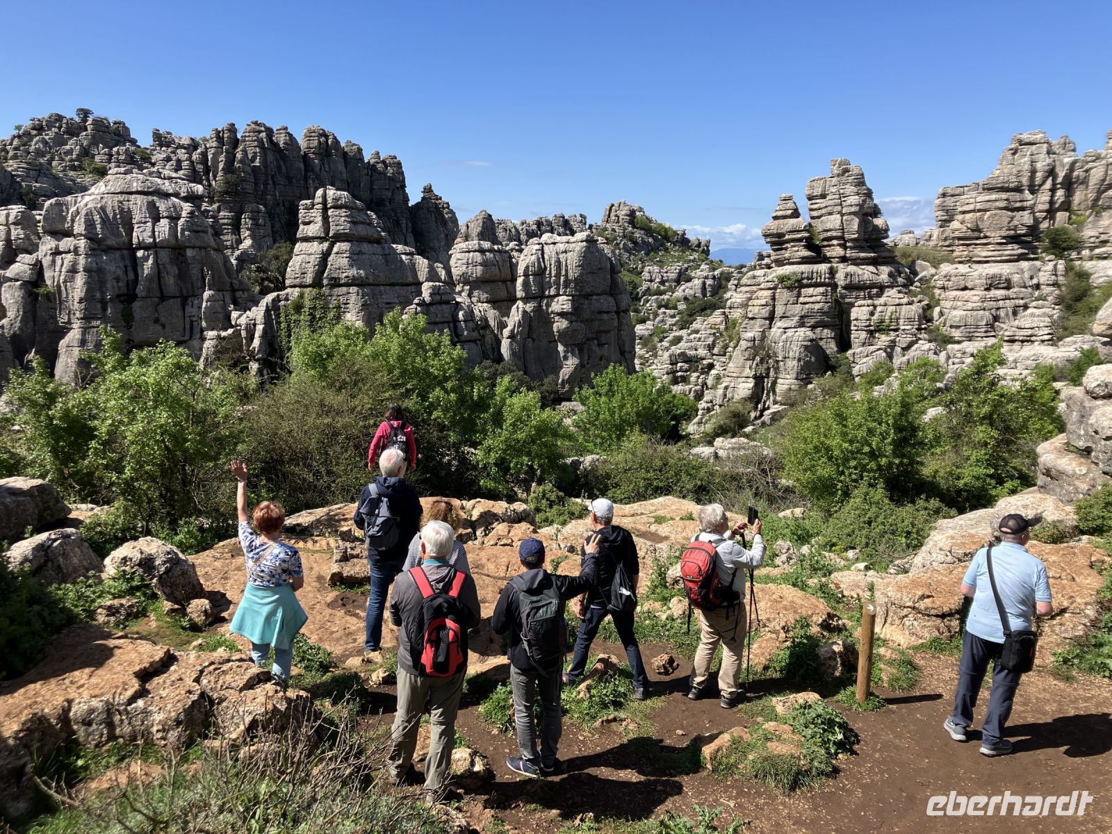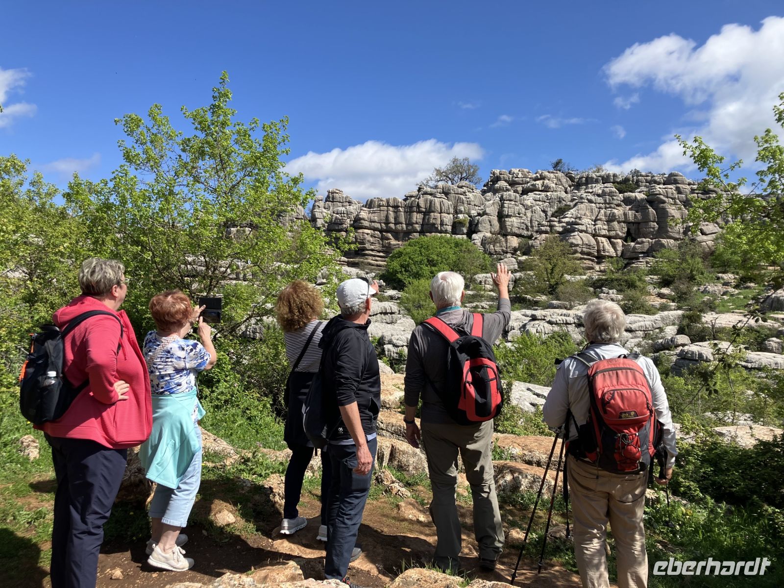 Nach dem Frühstück verließen wir Granada und fuhren in den Nationalpark El Torcal de Antequera, ein geologisches Wunder, das vor Millionen Jahren ein Meeresboden war. Als wir ankamen, wussten wir: Nur die Natur konnte die Alhambra toppen. Wir wanderten etwa eine Stunde auf der grünen Route, buchstäblich über Stock und Stein, durch ein Labyrinth aus bizarren Karstformationen, die vor 150 Millionen Jahren unter dem Tethys-Meer entstanden. Die „Pfannkuchenberge“, wie wir die gestapelten Felsen lachend nannten, trugen Namen wie „Der Drachenkopf“ oder „Die schlafende Schildkröte“. Und wir erfanden in einem Anfall von Kreativität immer neue Namen. Und immer wieder reichten wir uns die Hände helfend, um die unebenen Pfade zu meistern. „Das ist, als würde man durch das Oybintal wandern“, sagten unsere Zitauer Gäste, “… nur viel grösser”. Im Besucherzentrum legten wir eine Pause ein, genossen eine Kleinigkeit im Restaurant und warteten auf unsere beiden Wanderer, die auf der gelben Route unterwegs waren. Danach führte uns ein kurzer Weg zum Aussichtspunkt El Tornillo, benannt nach einer spiralförmigen Felsformation. Plötzlich, hinter einem Felsen, entdeckten wir eine zwei Gämsen, die sich geschickt an die Steine schmiegten. Ein paar junge Mädchen, die vorbeiliefen, wunderten sich über unsere gebannten Blicke. „Was gibt’s da zu sehen?“ fragte eine von ihnen und dachte, wir würden Vögel beobachten.