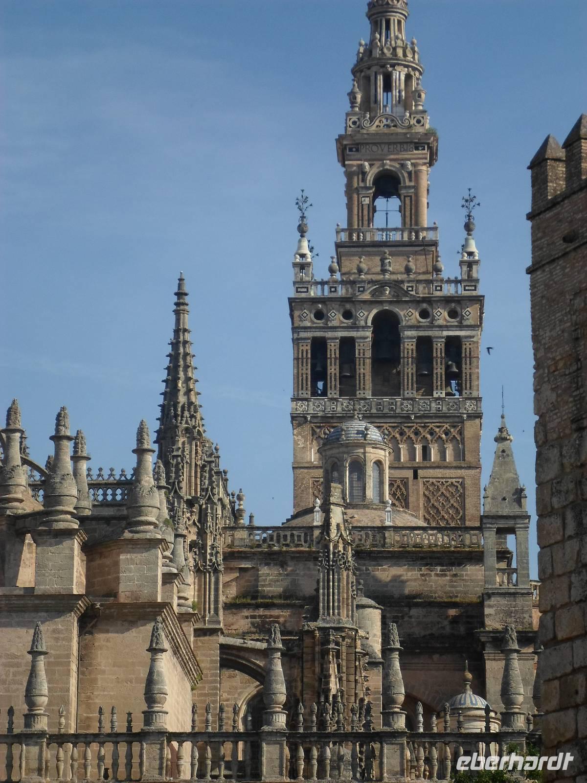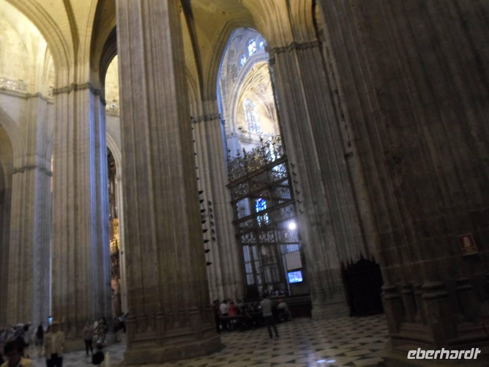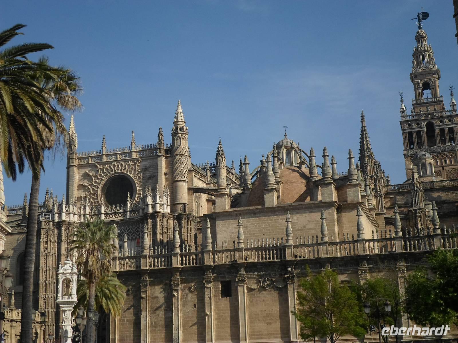 Wir freuen uns darauf, heute die Stadt näher kennenzulernen. Unsere Reiseleiterin Pilar, eine feurige Spanierin, führt uns durch viele kleine Gassen der historischen Altstadt, Barrio Santa Cruz, besuchen die mächtige Kathedrale, die zur drittgrößten der Welt gezählt wird. Uns beeindruckt dieser mächtige Bau, der auch das Grab von Kolumbus beherbergt. Lange bestanden Zweifel über die Echtheit der Gebeine. Diese wurde dann durch im Jahr 2006 nachgewiesen. Höhepunkt in der Kathedrale ist der reichverzierte Hochaltar, der in 100 Jahren Bautätigkeit geschaffen wurde. Früher stand hier eine Moschee, errichtet von den Mauren. Übrig geblieben sind nur noch der Orangenhof und das Minarett - Girolda, im 16. Jahrhundert zum Glockenturm umgebaut. Die