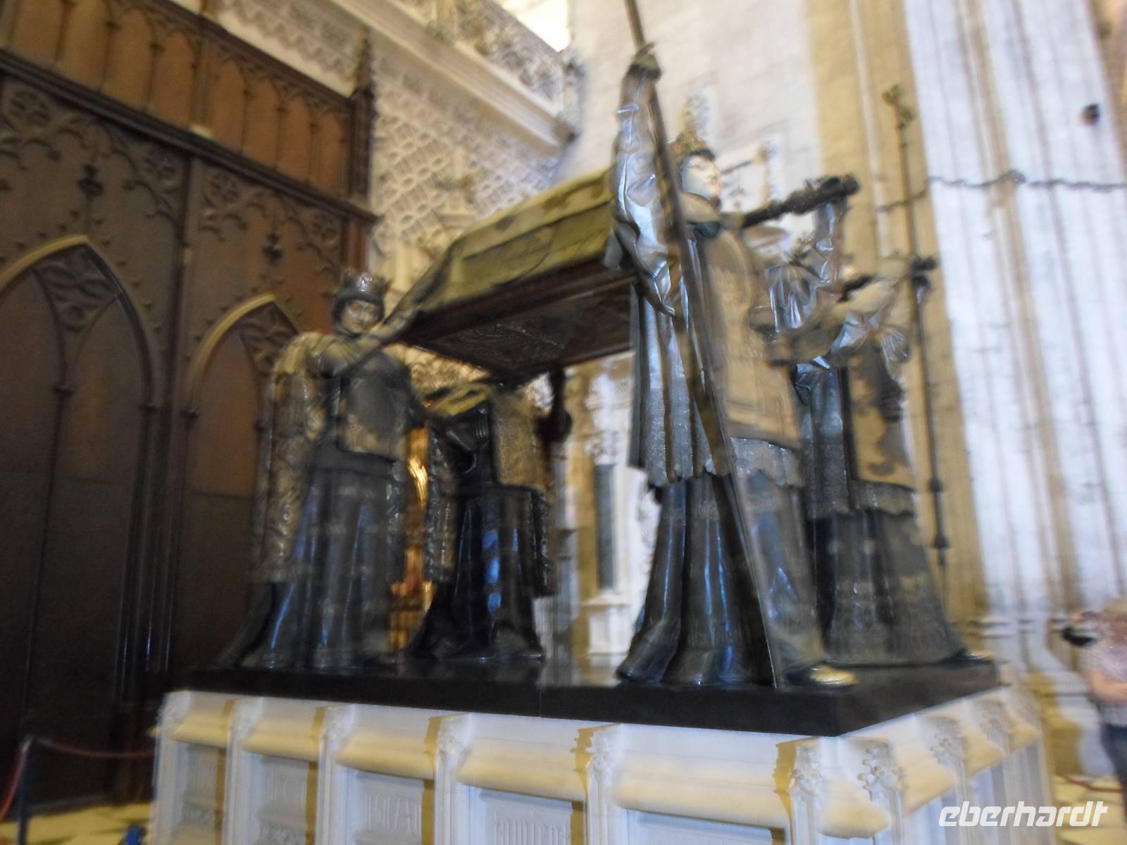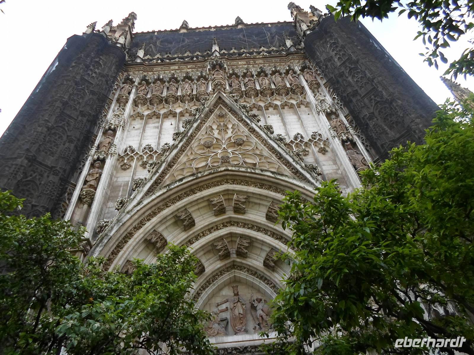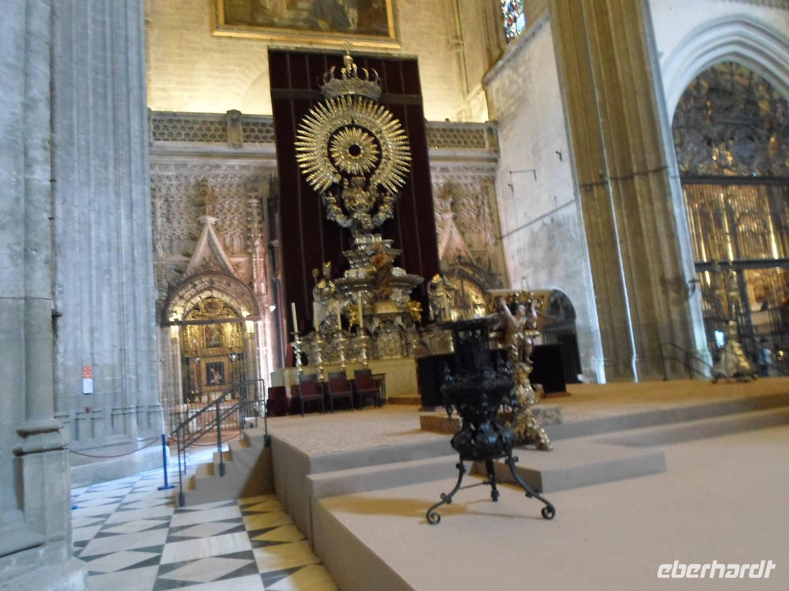 Wir freuen uns darauf, heute die Stadt näher kennenzulernen. Unsere Reiseleiterin Pilar, eine feurige Spanierin, führt uns durch viele kleine Gassen der historischen Altstadt, Barrio Santa Cruz, besuchen die mächtige Kathedrale, die zur drittgrößten der Welt gezählt wird. Uns beeindruckt dieser mächtige Bau, der auch das Grab von Kolumbus beherbergt. Lange bestanden Zweifel über die Echtheit der Gebeine. Diese wurde dann durch im Jahr 2006 nachgewiesen. Höhepunkt in der Kathedrale ist der reichverzierte Hochaltar, der in 100 Jahren Bautätigkeit geschaffen wurde. Früher stand hier eine Moschee, errichtet von den Mauren. Übrig geblieben sind nur noch der Orangenhof und das Minarett - Girolda, im 16. Jahrhundert zum Glockenturm umgebaut. Die