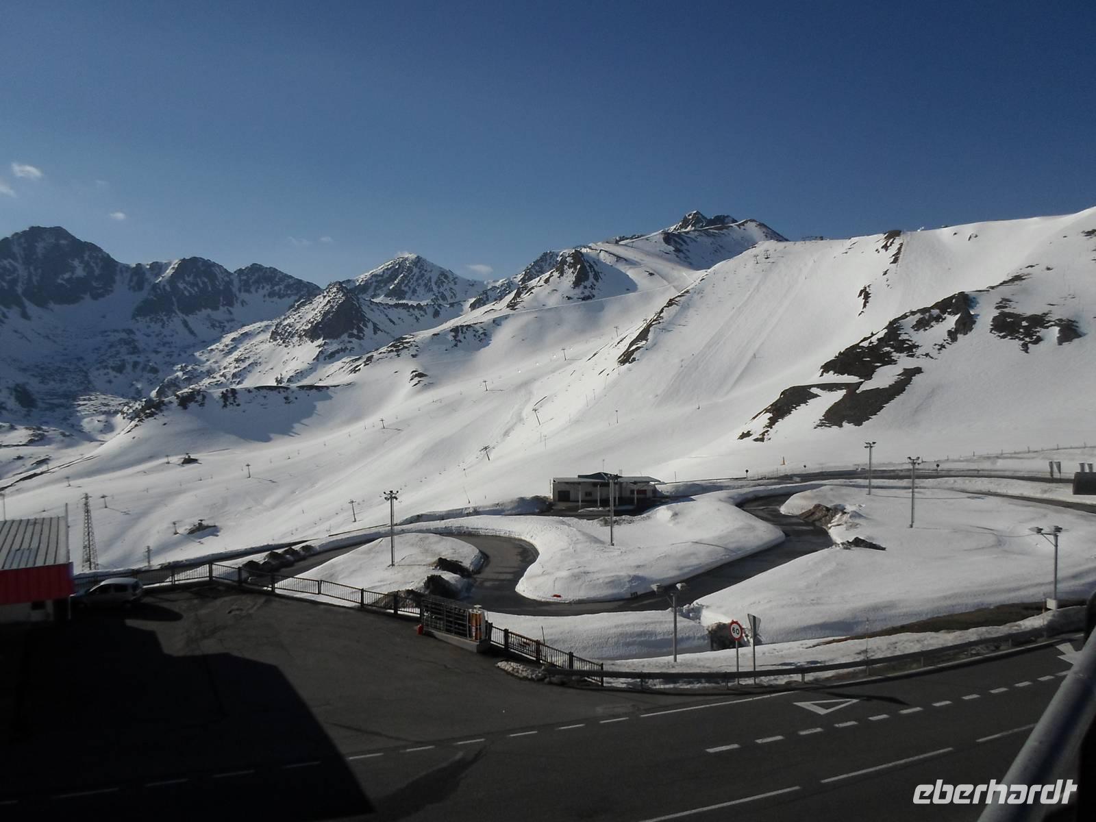 uns Jan, unser guter und sicherer Buschauffeur noch über den Pass von 2408 m bringen. Viele Gäste freuen sich darüber. Die Abendsonne taucht die verschneiten 2000der Gipfel der bizarren Bergwelt in ein wunderbares Panoraram. Spät erreichen wir das schöne „Sport Hotel Village" in Soldea im Zwergstaat Andorra.