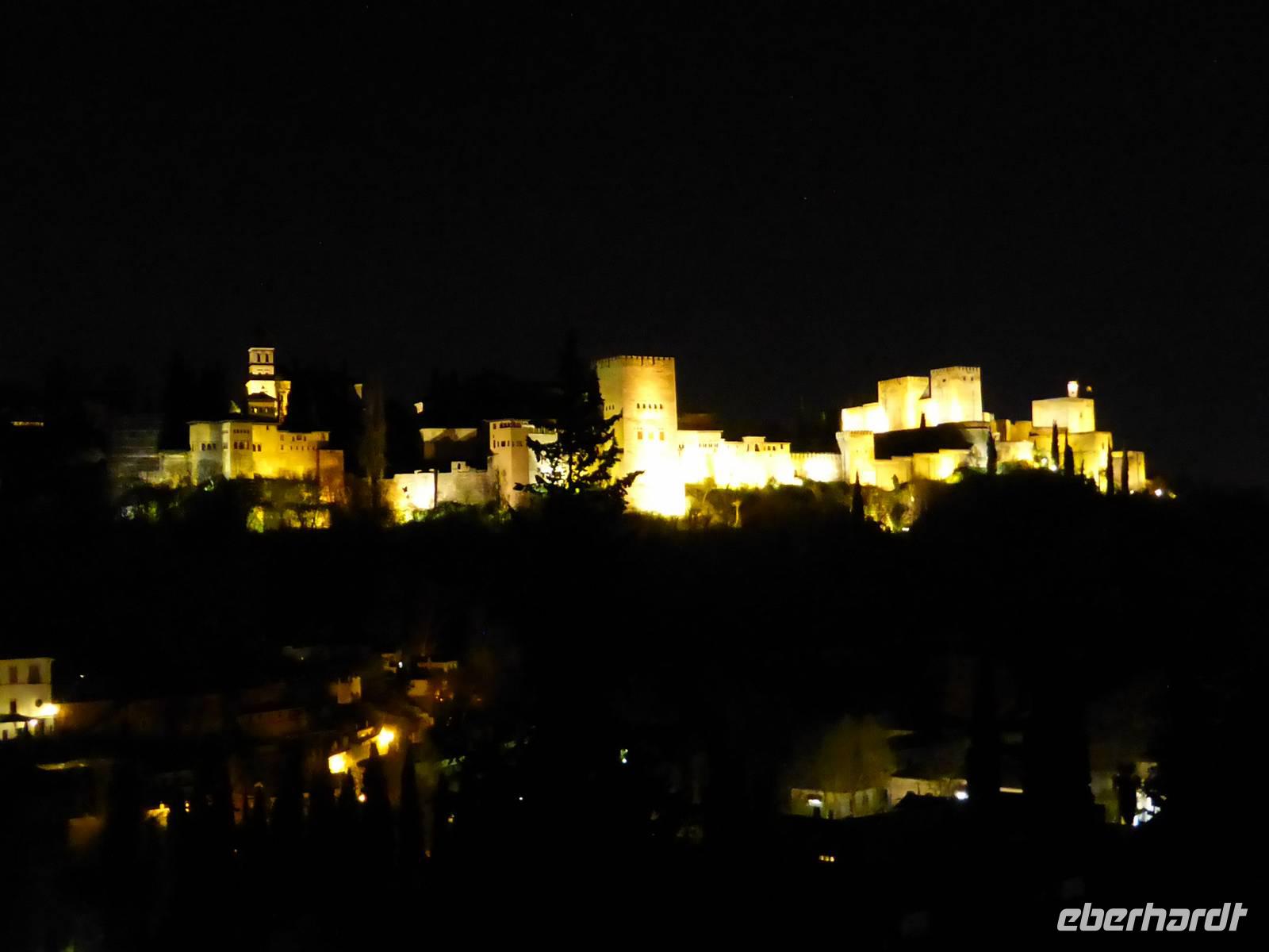Ein Großteil unserer Reisegruppe nutzte anschließend die Gelegenheit zum Besuch einer Flamenco-Veranstaltung im Stadtteil Sacromonte. Pünktlich wurden wir vom Hotel abgeholt und zu den „Cuevas los Tarantos" gefahren. Dort mussten wir allerdings auf das Eintreffen einer zweiten und dritten Reisegruppe warten, ehe die Vorstellung beginnen konnte. Die Flamenco-Show war sehr temperamentvoll und abwechslungsreich. Durch die begrenzte Räumlichkeit der „Höhle" waren wir auch mitten im Geschehen. Nach der Show spazierten wir zu einem Aussichtspunkt mit fantastischem Blick auf die beleuchtete Alhambra. Das war ein schöner Abschluss unseres langen Tages.