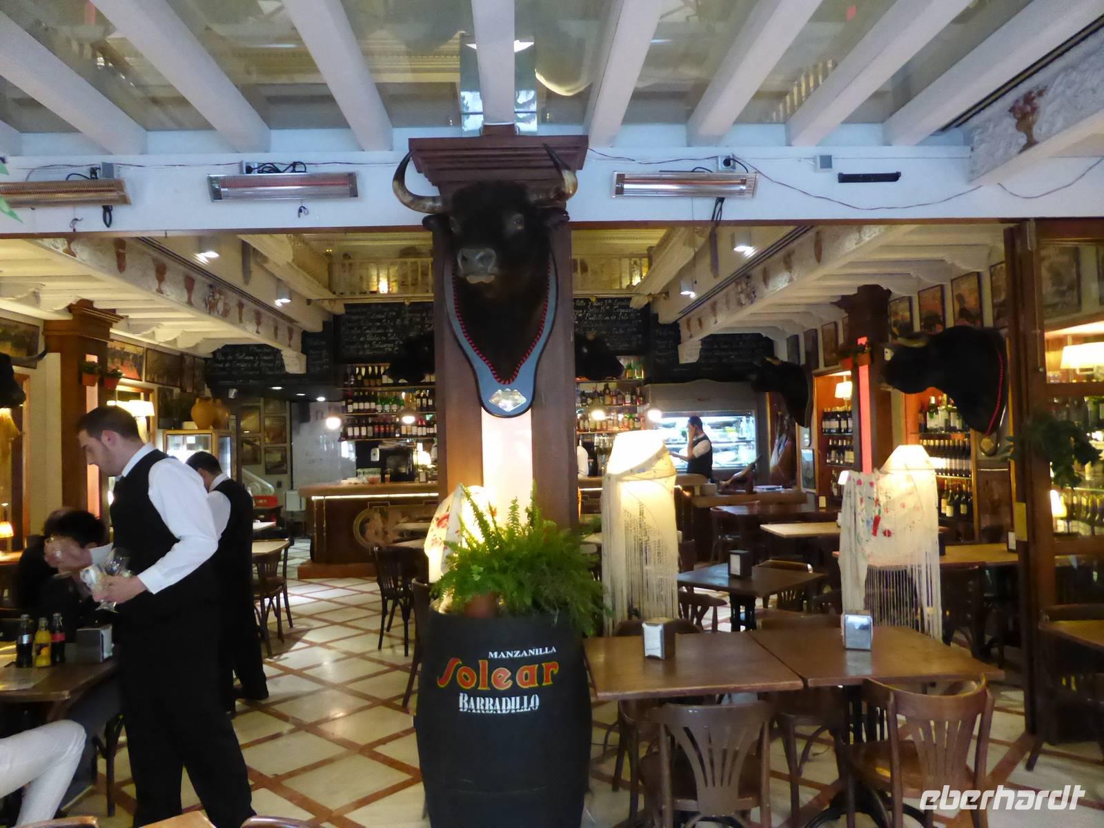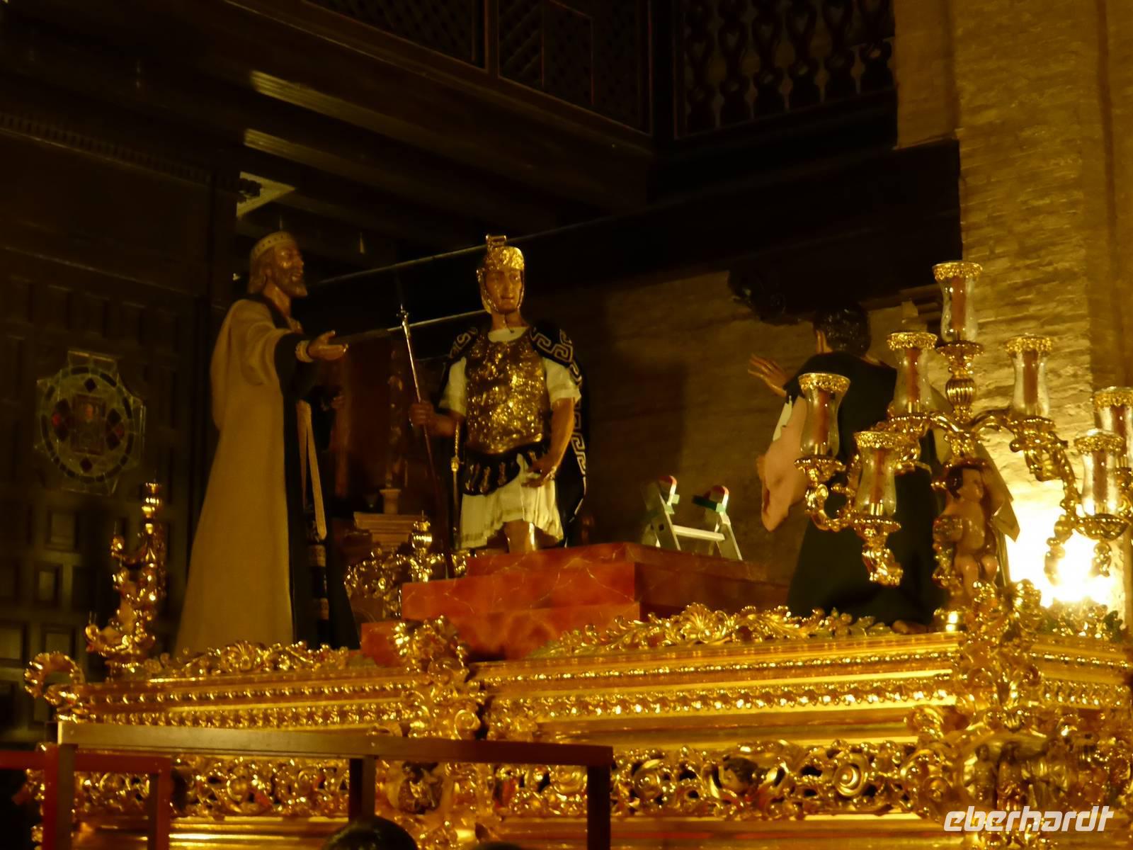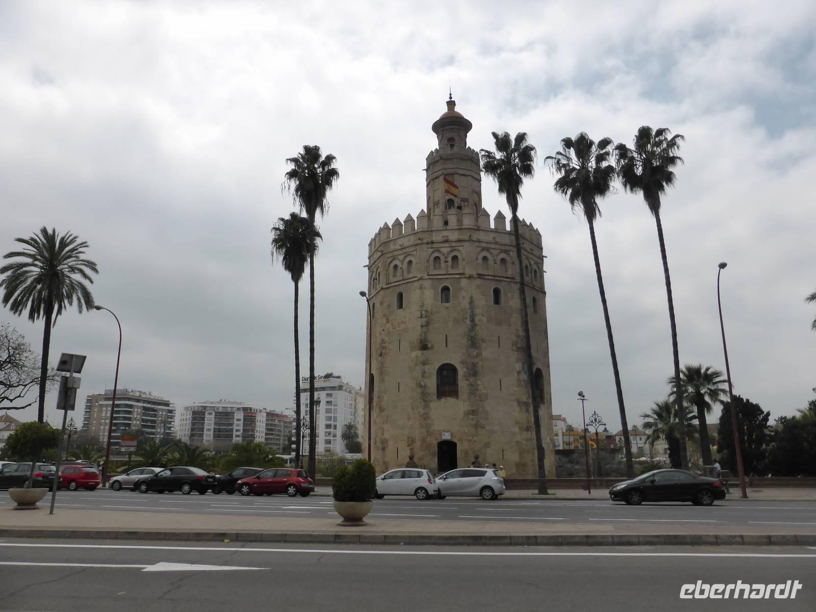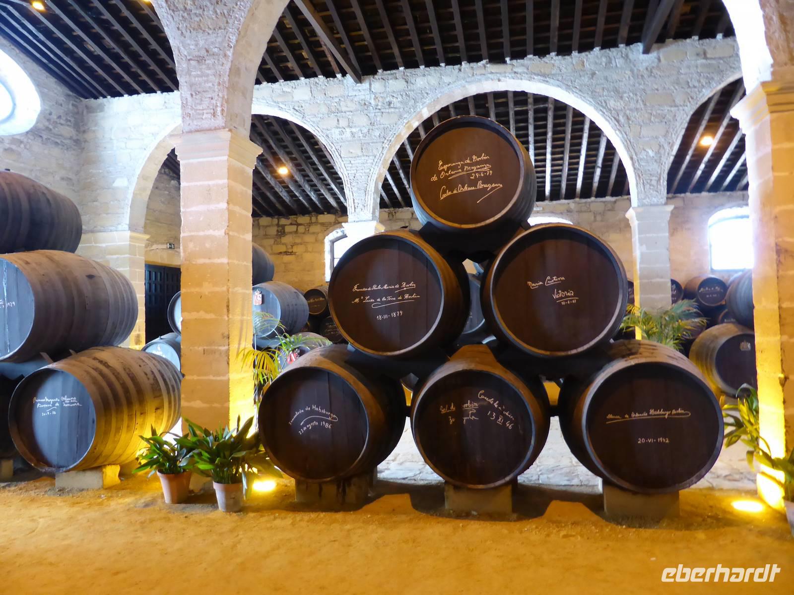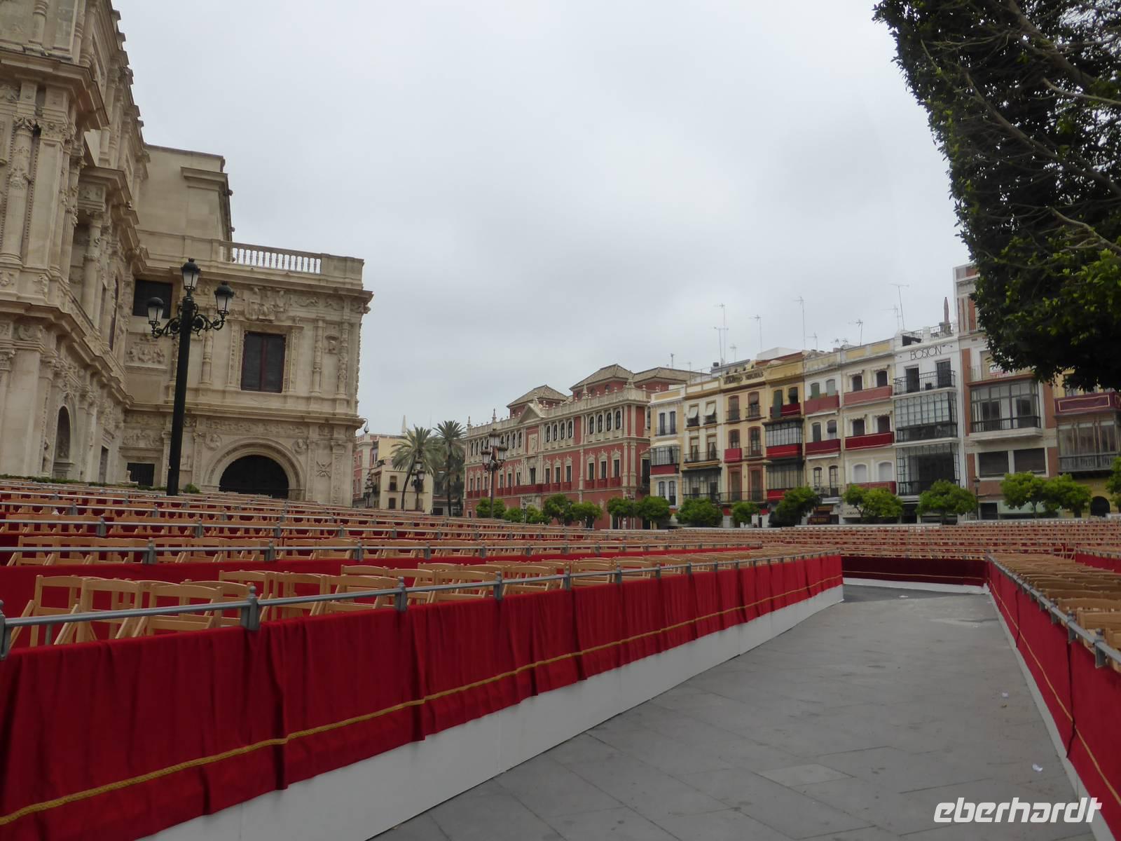Vor den Toren der Altstadt begrüßte uns unsere örtliche Stadtführerin Marianne. Wir fuhren um die gesamte Altstadt herum und genossen die Ausblicke auf das Meer, die Festungsanlagen, die Strände und den Botanischen Garten. In der Nähe des Rathausplatzes stiegen wir aus. Die weitere Besichtigung erfolgte zu Fuß. Vor der Kathedrale wurden bereits die Bänke und Absperrungen für die Osterprozessionen aufgestellt. Wir besuchten den Blumenplatz (Plaza de las Flores) und die Markthalle, in der es frischen Fisch und Meeresfrüchte an dutzenden Ständen gab. Obwohl es nur Fischstände in der Halle gab, roch es nirgendwo danach. Durch die engen Geschäftsstraßen von Cadiz spazierten wir zum Rathausplatz zurück. Bis zur Weiterfahrt hatten wir noch ein wenig Zeit für den Souvenirkauf oder für eine leckere Portion Eis. Von Cadiz fuhren wir anschließend nach Jerez de la Frontera zur Besichtigung der Bodega Gonzales Byass. Sie ist die größte Sherry-Bodega in Jerez. Zuerst wurde uns ein Film über die Firmengeschichte gezeigt und danach besichtigten wir die Weinlage mit ihren alten dunkelbraunen Eichenfässern. Viele Berühmtheiten haben die Bodega besucht und dies auch mit einem weißem Schriftzug und ihrer Unterschrift auf den Fassböden der Nachwelt hinterlassen. Nach der Besichtigung folgte die lang ersehnte Sherry-Wein-Verkostung. Zwei Weinproben wurden gereicht und dazu kleine Naschereien in Form von Schinken und Käse zum Neutralisieren. Der Weg zum Bus führte durch den obligatorischen Souvenirladen. Eine gute Gelegenheit an die Daheimgebliebenen zu denken oder sich beim Nachbarn mit einem Mitbringsel fürs Blumengießen zu bedanken. Von Jerez de la Frontera fuhren wir anschließend zu unserem Hotel „Catalunia" in Sevilla. Auch hier hatten wir Schwierigkeiten das Hotel anzufahren und mussten uns mit dem Gepäckausladen beeilen. Die Zeit nach dem Abendessen nutzten viele Gäste für einen Spaziergang durch die benachbarten Straßen und Gassen.