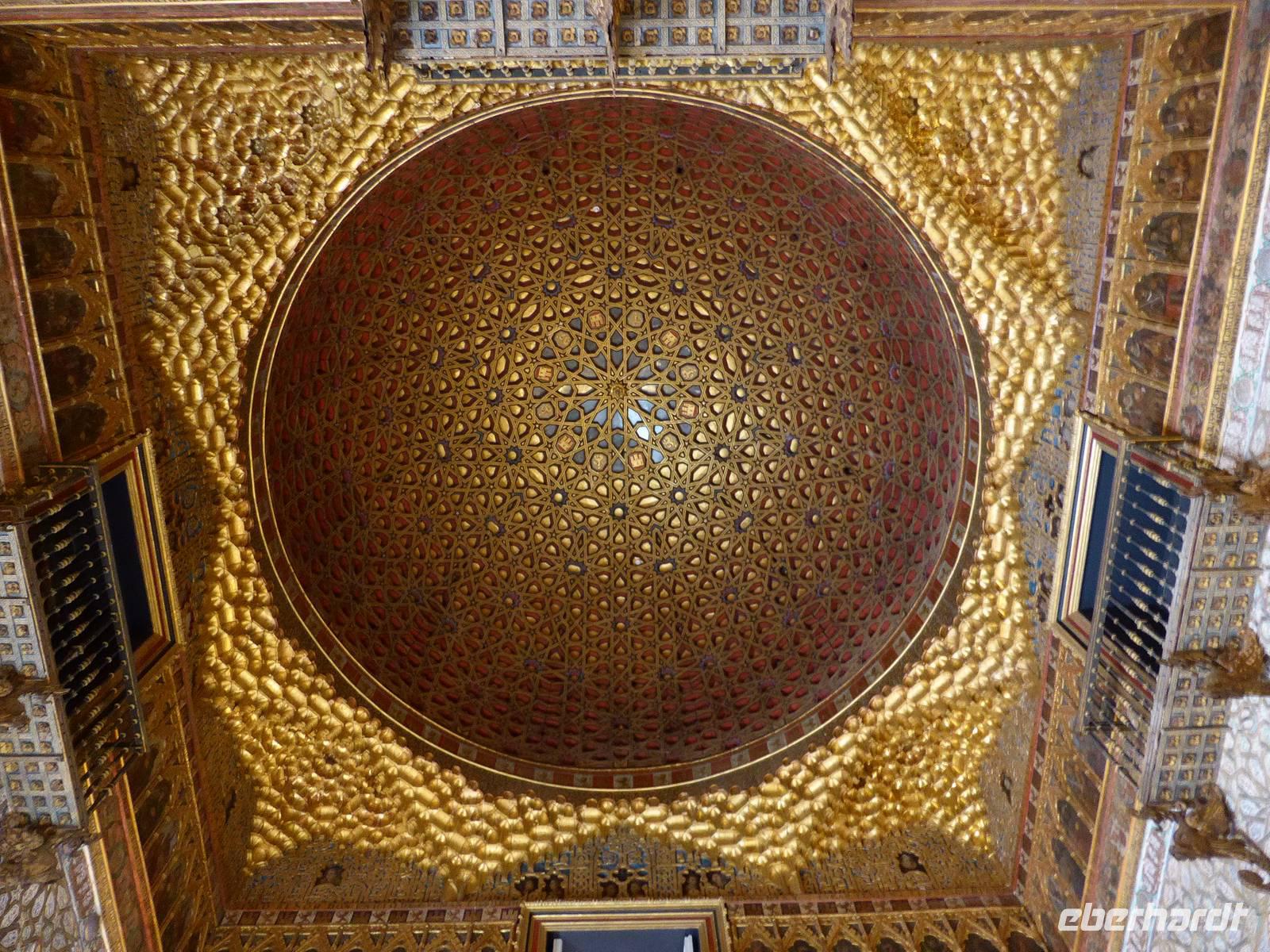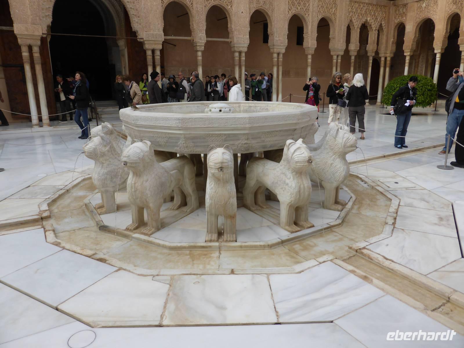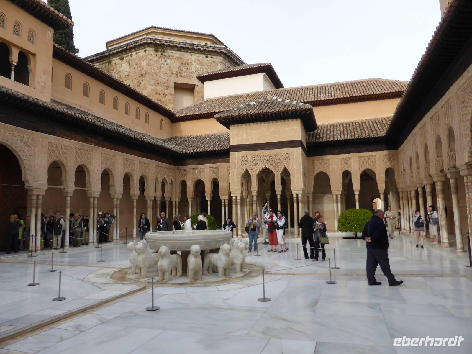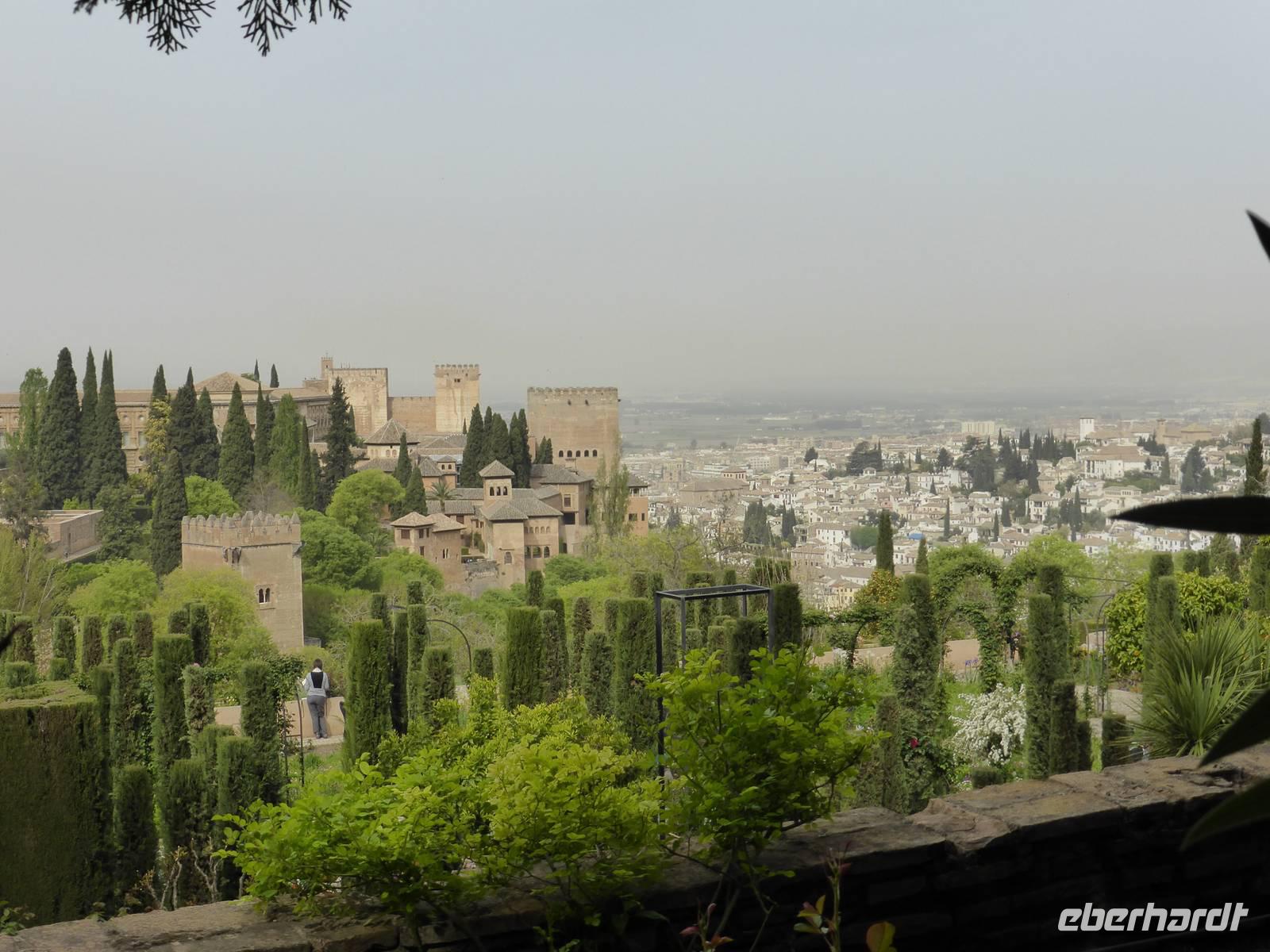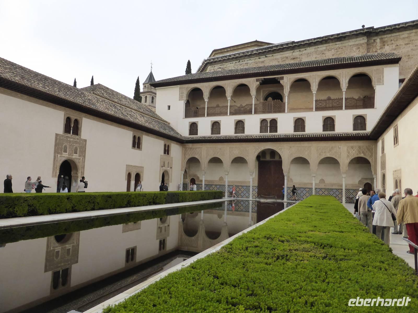 Am Morgen wurden wir von Pepe (1) und Pepe (2), unseren beiden Führern durch die Alhambra, abgeholt. Die Alhambra ist neben dem Prado-Museum in Madrid die am meisten besuchte Sehenswürdigkeit in Spanien. Am Besuchereingang teilten unsere Führer die Audiogeräte aus und begannen die Führung mit dem Palast Karls des V. sowie den Palästen der Nasriden. Im Empfangssaal der maurischen Herrscher fühlt man sich in die Vergangenheit zurück versetzt. Man sieht vor dem geistigen Auge unter der prächtigen Zedernholzkuppel den Sultan auf weichen Polsterkissen in seiner Nische sitzen. Von drei Seiten fiel das Licht auf die eintretenden Gesandten ein, so dass sie derart geblendet den Sultan nur in groben Umrissen im Schatten erkennen konnten. Das war beabsichtigt und flößte Respekt ein.