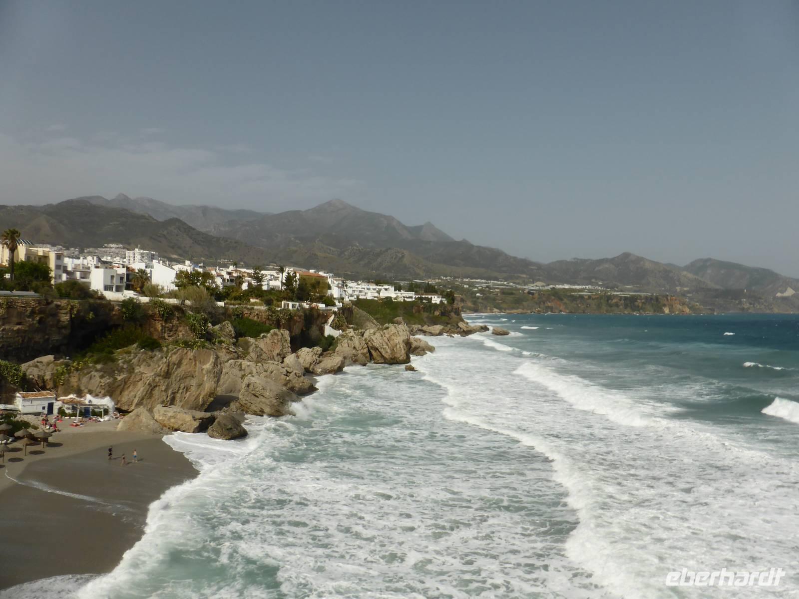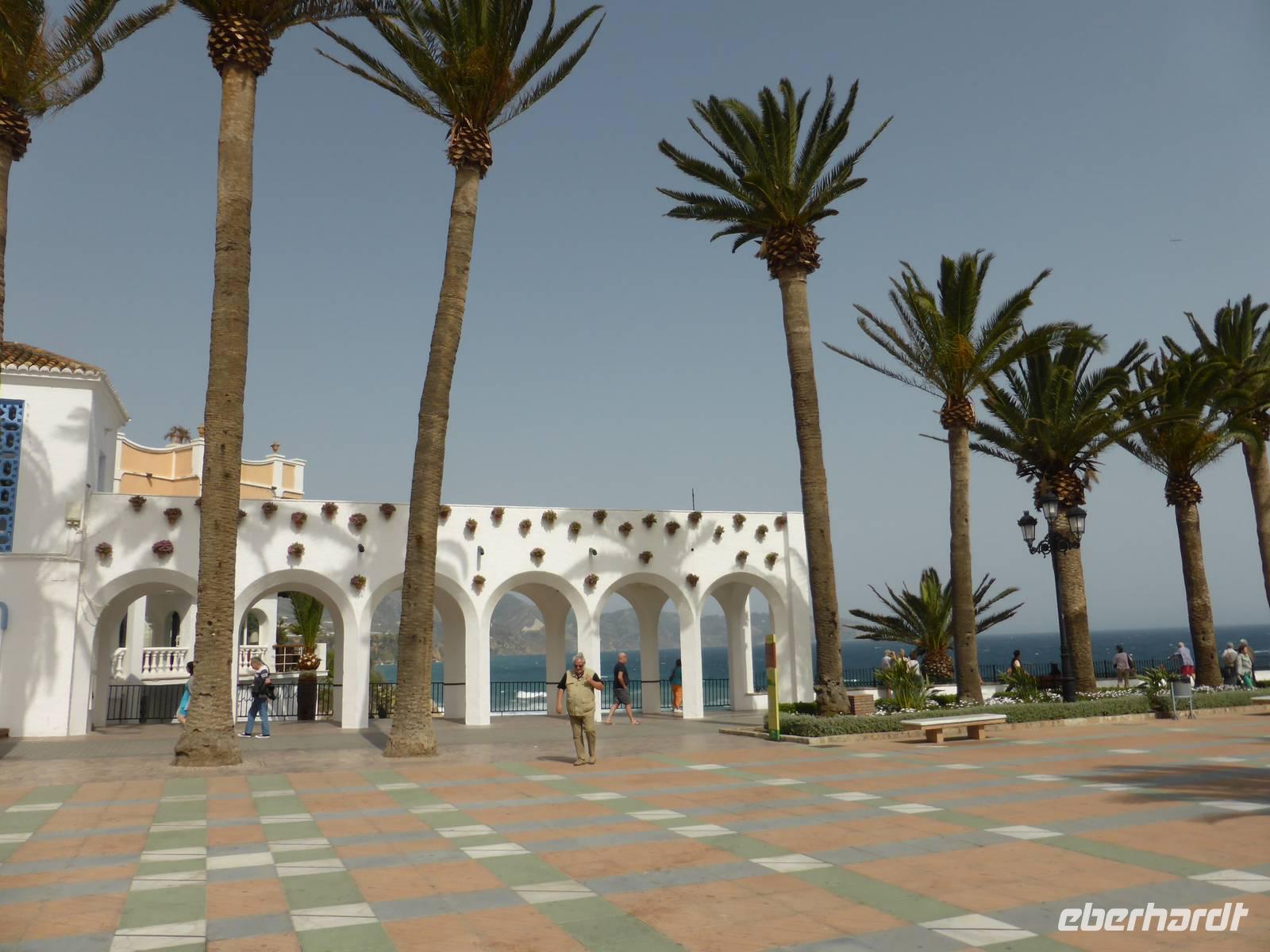 Anschließend spazierten wir durch die Gärten des Generalife. Die Anlagen, gegliedert durch hohe Thuja-Hecken mit vielen Wasserspielen und kleinen Kanälen, machen den ehemaligen Sommersitz der maurischen Könige zu einem wahren Paradies. Danach verabschiedeten wir uns von unseren beiden Führern und liefen hinunter ins Stadtzentrum. Dort sahen wir bei einem gemeinsamen Rundgang den „Plaza Nueva" (den Neuen Platz), die ehemalige Karawanserei und das Rathaus, den Platz „Biz Rambla" mit vielen Restaurants und Cafes sowie die Capilla Real und die gewaltige Kathedrale. Anschließend war Freizeit für deren Besichtigung oder für einen Besuch der königlichen Gräber in der Capilla Real. Am Nachmittag holte uns Alf wieder mit dem Bus vom Treffpunkt ab und wir fuhren weiter in Richtung Malaga. Für unsere Fahrstrecke hatten wir den Weg über Motril entlang der Küstenstraße gewählt. In Nerja, einer der schönsten Städte an der Costa del Sol, besuchten wir den „Balkon Europas", eine Promenade, welche die beiden Stadtstrände Nerjas voneinander trennt und sich weit ins Meer schiebt. König Alfons XII. soll den Begriff „Balkon Europas" geprägt haben. Nach diesem schönen Aufenthalt setzten wir unsere Fahrt nach Malaga fort. Dort angekommen hatten wir Probleme, unser in der Innenstadt gelegenes Hotel „Zenit" anzufahren. Letztendlich hielten wir am Rand eines Kreisverkehrs und rollten unsere Koffer zum Hotel.