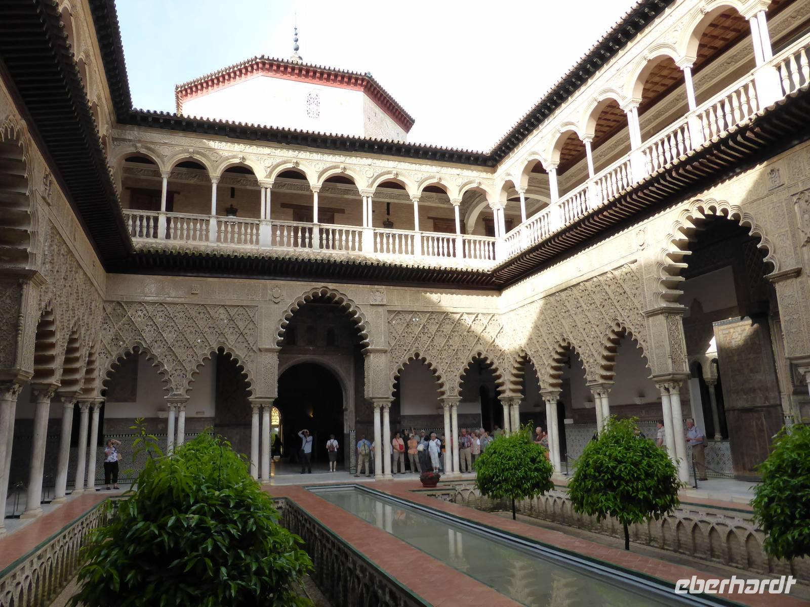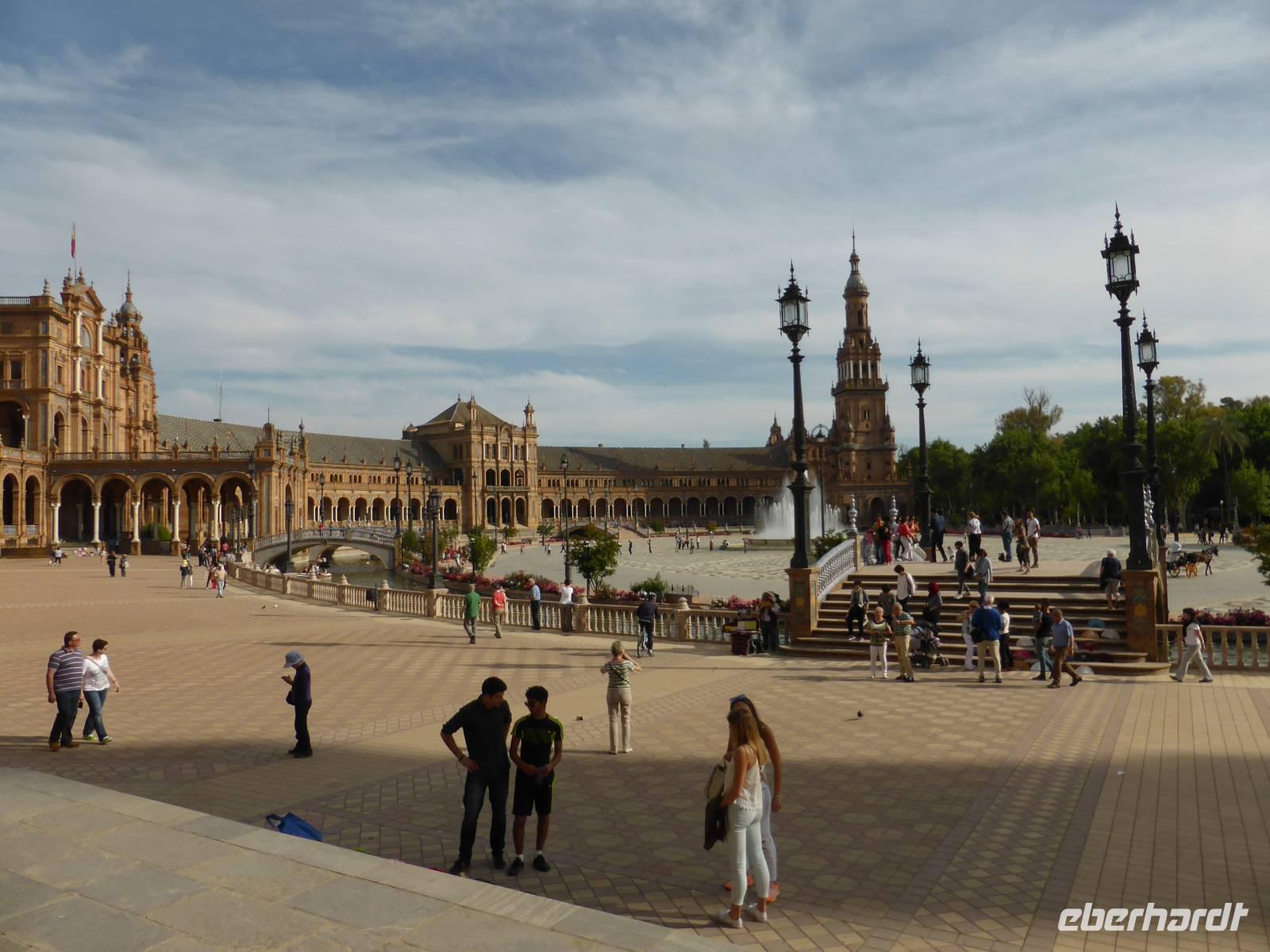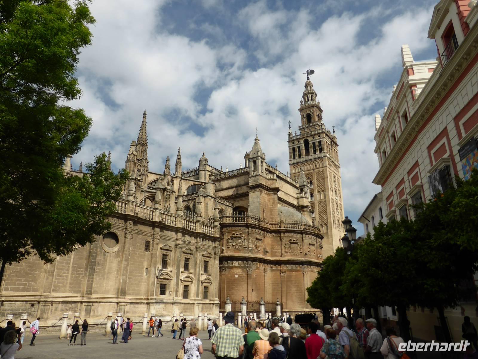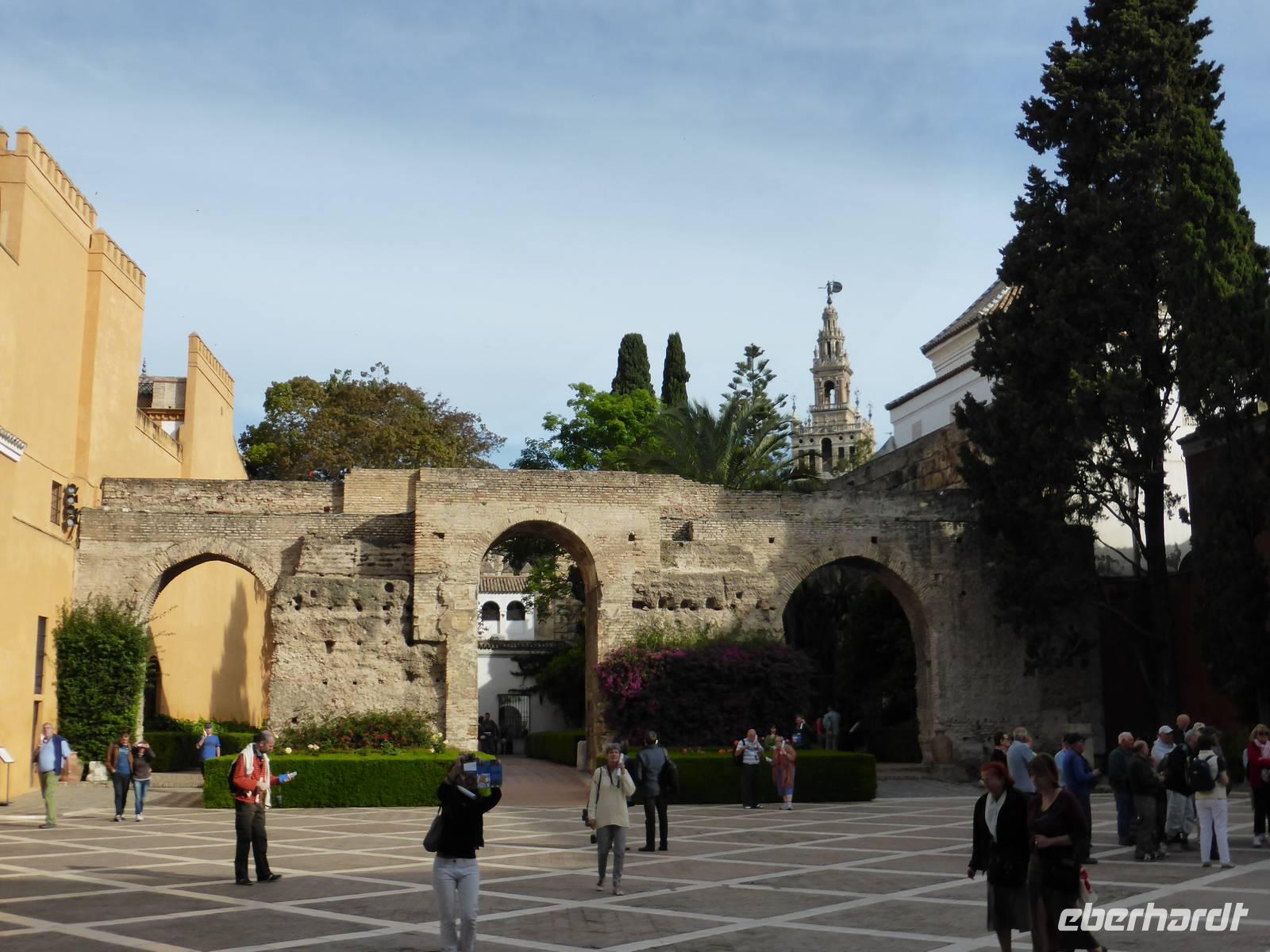 Wir wurden am Morgen von unserer örtlichen Stadtführerin Pillar Tobarcia vom Hotel abgeholt und fuhren mit dem Bus ins Zentrum. Zuerst besuchten wir den Königlichen Palast (Real Alcazar), dessen Grundmauern teilweise noch auf römischen Ursprung zurückgehen. Die beeindruckendsten Gebäude stammen allerdings aus dem 14. Jahrhundert, der Regentschaft von Pedro dem Grausamen. Er ließ mit Hilfe maurischer Baumeister einen Palast für seine Geliebte im Mudejarstil erbauen. Nach der Besichtigung des Alcazars spazierten wir durch die Juderia, das ehemalige Judenviertel Sevillas. Die Gassen sind alle verwinkelt und die Häuser zweistöckig, weiß gekalkt und mit einem kleinen Innenhof versehen (Patio). Den Abschluss unseres Stadtrundganges bildete der Besuch der Kathedrale von Sevilla, erbaut auf den Umrissen eines römischen Tempels und einer späteren Moschee. Von dieser sind noch der Orangenhof sowie das Minarett, der heutige Glockenturm (Giralda), erhalten. Neueste Messungen haben ergeben, dass die Kathedrale von Sevilla die größte auf spanischem Boden ist, was wir ohne zu zögern anerkannten. Mercedes erklärte uns Chor und Hochaltar sowie das beeindruckende Kolumbusgrab. Zumindest ein Teil der Gebeine stammt von Christoph Kolumbus, welches durch eine DNA-Analyse im Jahr 2006 belegt wurde. Nach der Besichtigung der Kathedrale verabschiedeten wir unsere Stadtführerin und hatten anschließend Zeit für die Mittagspause oder für eigene Unternehmungen. Die meisten von uns nutzten die Gelegenheit, auf den Glockenturm Giralda zu steigen, von welchem sich eine tolle Aussicht über die Dächer von Sevilla bot.