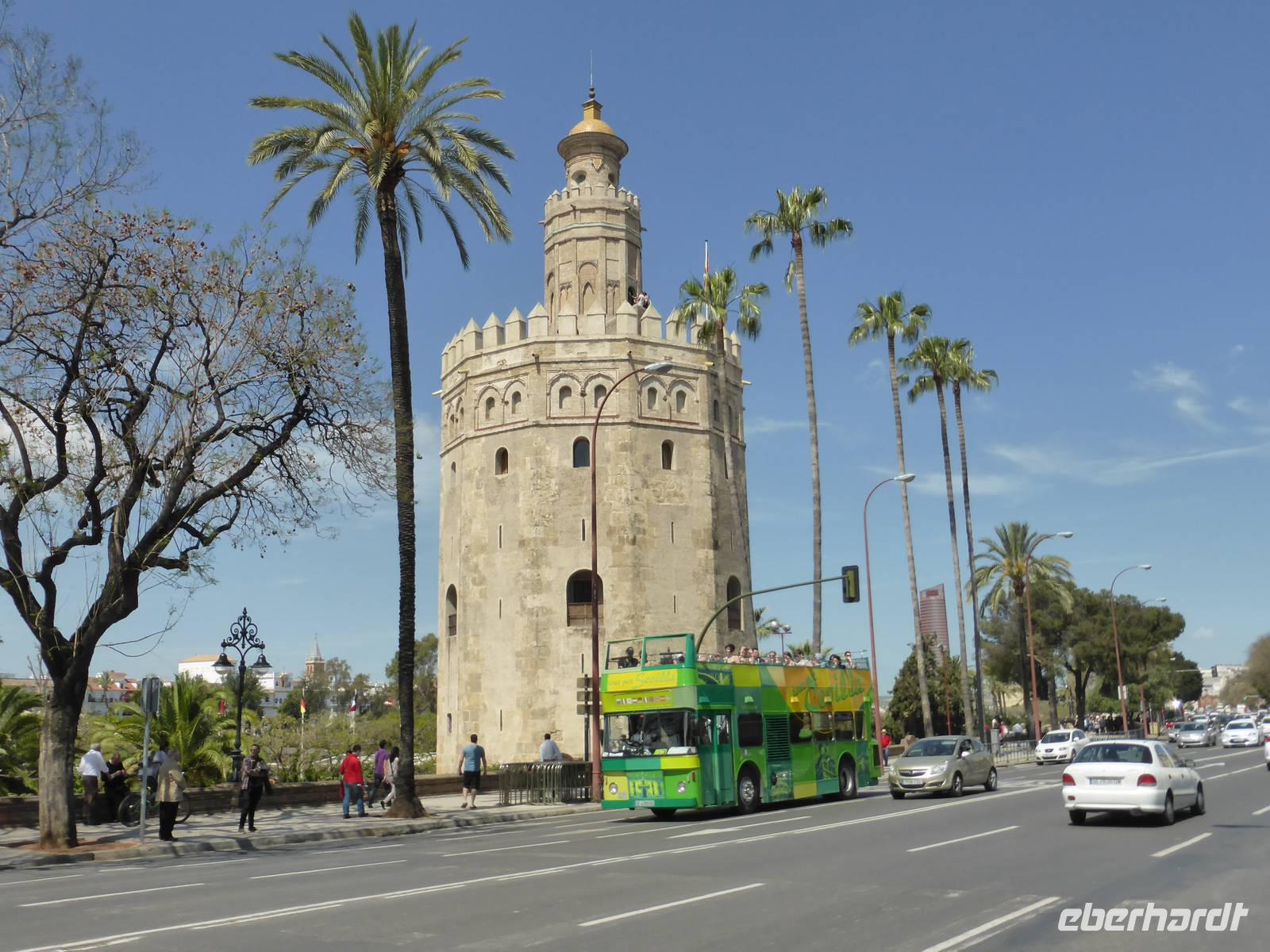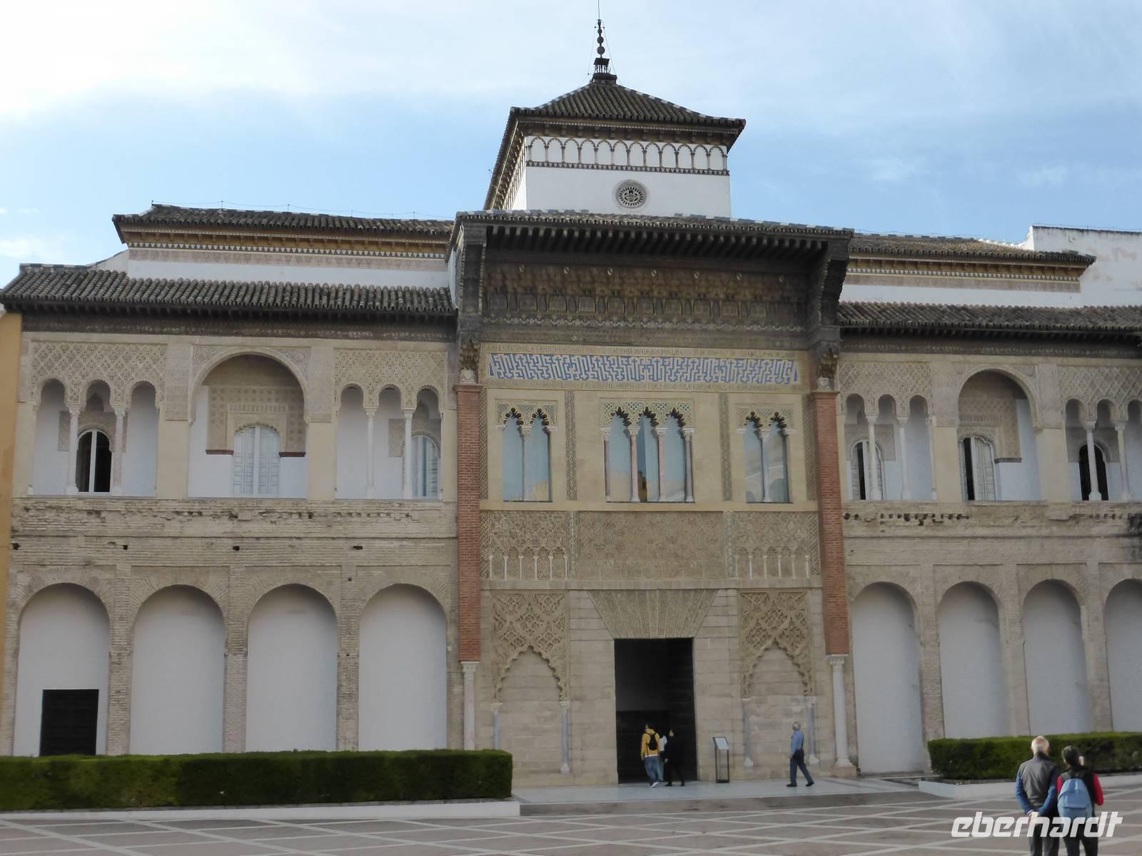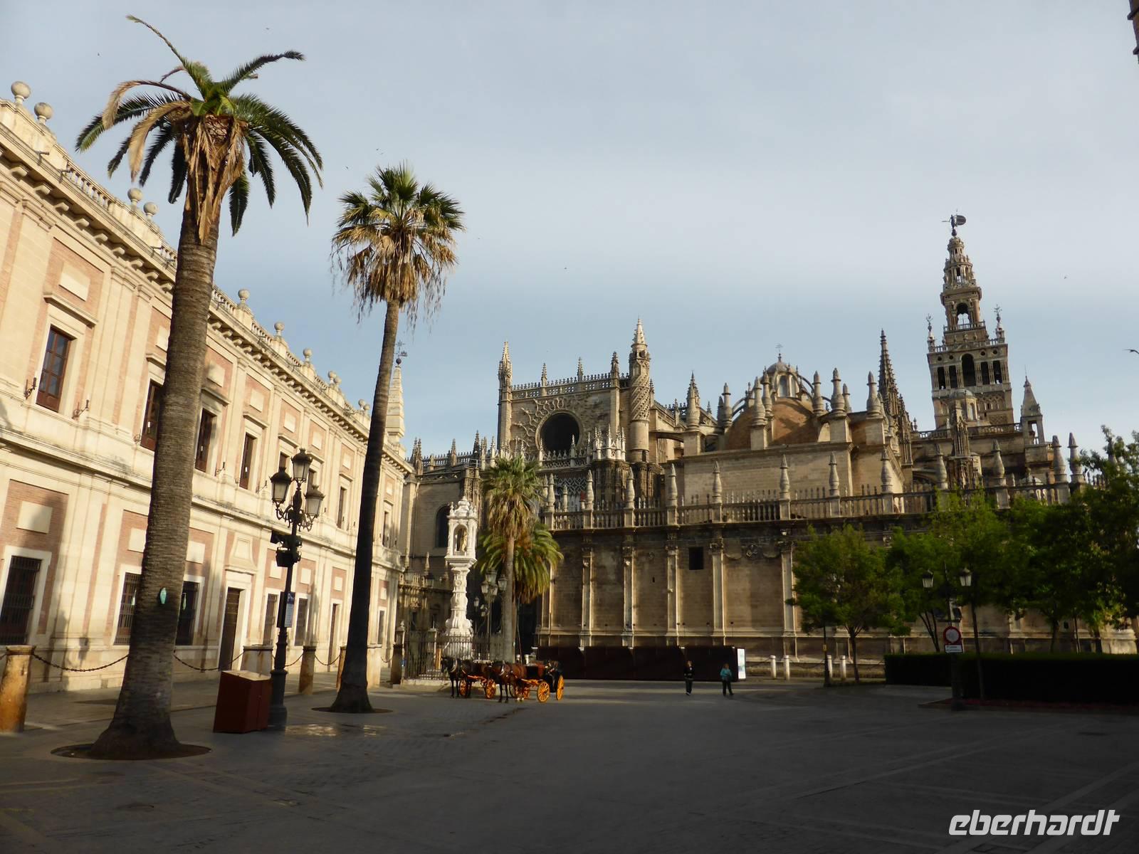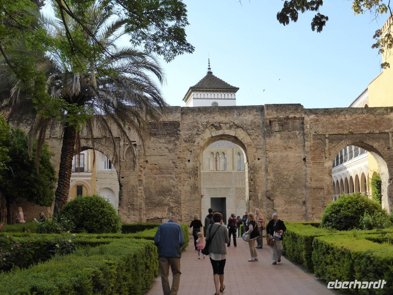 Wir wurden am Morgen von unserer örtlichen Stadtführerin Pillar Tobarcia vom Hotel abgeholt und fuhren mit dem Bus ins Zentrum. Zuerst besuchten wir den Königlichen Palast (Real Alcazar), dessen Grundmauern teilweise noch auf römischen Ursprung zurückgehen. Die beeindruckendsten Gebäude stammen allerdings aus dem 14. Jahrhundert, der Regentschaft von Pedro dem Grausamen. Er ließ mit Hilfe maurischer Baumeister einen Palast für seine Geliebte im Mudejarstil erbauen. Nach der Besichtigung des Alcazars spazierten wir durch die Juderia, das ehemalige Judenviertel Sevillas. Die Gassen sind alle verwinkelt und die Häuser zweistöckig, weiß gekalkt und mit einem kleinen Innenhof versehen (Patio). Den Abschluss unseres Stadtrundganges bildete der Besuch der Kathedrale von Sevilla, erbaut auf den Umrissen eines römischen Tempels und einer späteren Moschee. Von dieser sind noch der Orangenhof sowie das Minarett, der heutige Glockenturm (Giralda), erhalten. Neueste Messungen haben ergeben, dass die Kathedrale von Sevilla die größte auf spanischem Boden ist, was wir ohne zu zögern anerkannten. Mercedes erklärte uns Chor und Hochaltar sowie das beeindruckende Kolumbusgrab. Zumindest ein Teil der Gebeine stammt von Christoph Kolumbus, welches durch eine DNA-Analyse im Jahr 2006 belegt wurde. Nach der Besichtigung der Kathedrale verabschiedeten wir unsere Stadtführerin und hatten anschließend Zeit für die Mittagspause oder für eigene Unternehmungen. Die meisten von uns nutzten die Gelegenheit, auf den Glockenturm Giralda zu steigen, von welchem sich eine tolle Aussicht über die Dächer von Sevilla bot.