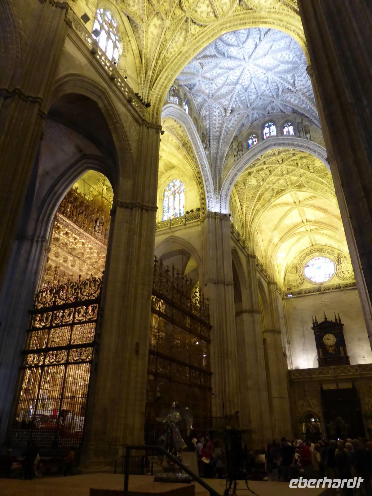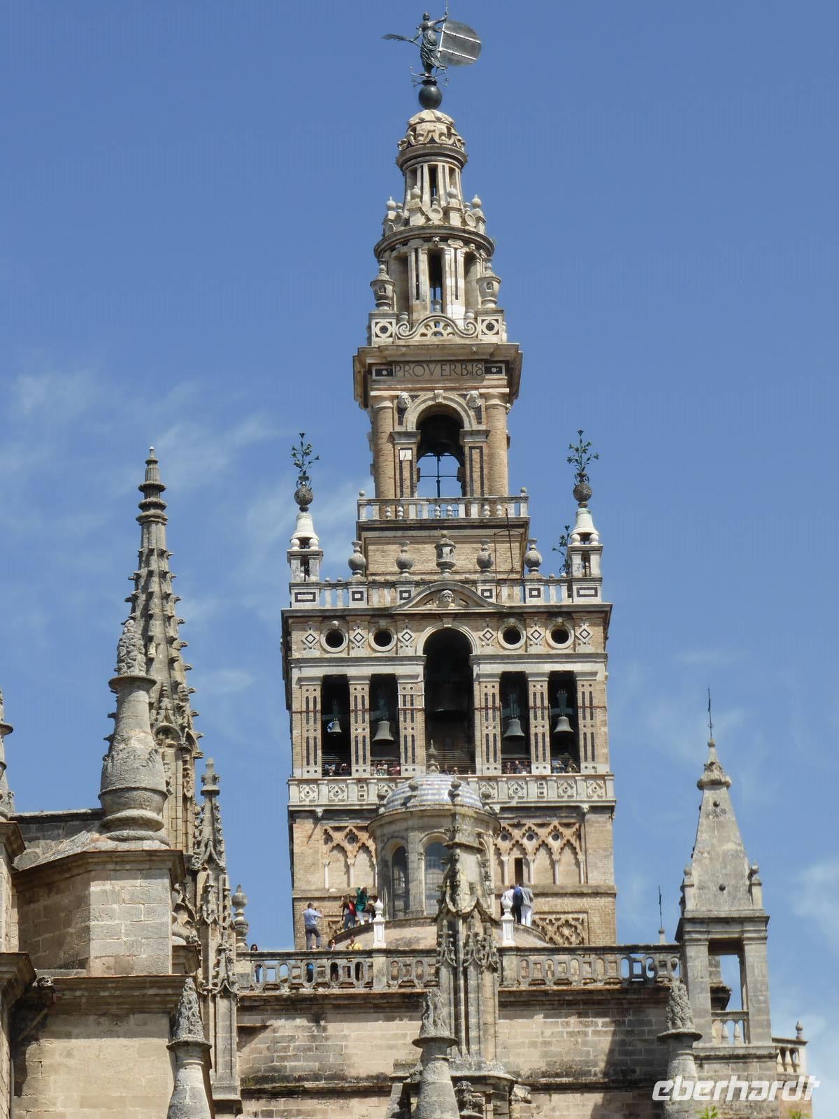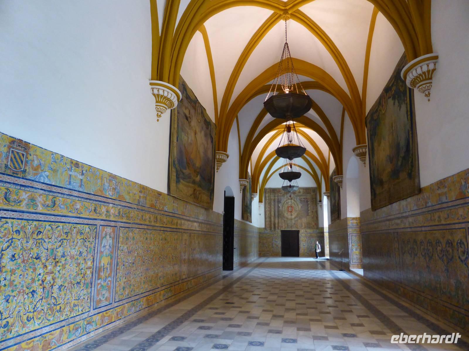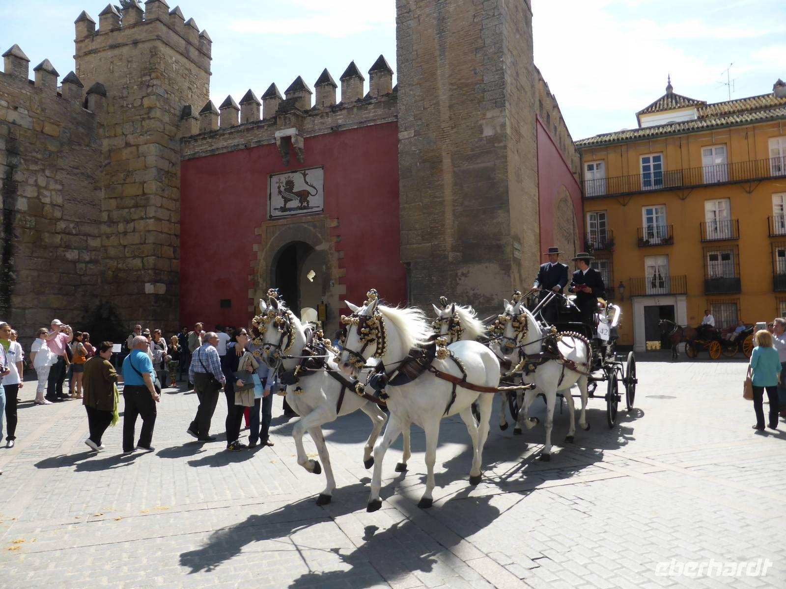 Wir wurden am Morgen von unserer örtlichen Stadtführerin Pillar Tobarcia vom Hotel abgeholt und fuhren mit dem Bus ins Zentrum. Zuerst besuchten wir den Königlichen Palast (Real Alcazar), dessen Grundmauern teilweise noch auf römischen Ursprung zurückgehen. Die beeindruckendsten Gebäude stammen allerdings aus dem 14. Jahrhundert, der Regentschaft von Pedro dem Grausamen. Er ließ mit Hilfe maurischer Baumeister einen Palast für seine Geliebte im Mudejarstil erbauen. Nach der Besichtigung des Alcazars spazierten wir durch die Juderia, das ehemalige Judenviertel Sevillas. Die Gassen sind alle verwinkelt und die Häuser zweistöckig, weiß gekalkt und mit einem kleinen Innenhof versehen (Patio). Den Abschluss unseres Stadtrundganges bildete der Besuch der Kathedrale von Sevilla, erbaut auf den Umrissen eines römischen Tempels und einer späteren Moschee. Von dieser sind noch der Orangenhof sowie das Minarett, der heutige Glockenturm (Giralda), erhalten. Neueste Messungen haben ergeben, dass die Kathedrale von Sevilla die größte auf spanischem Boden ist, was wir ohne zu zögern anerkannten. Mercedes erklärte uns Chor und Hochaltar sowie das beeindruckende Kolumbusgrab. Zumindest ein Teil der Gebeine stammt von Christoph Kolumbus, welches durch eine DNA-Analyse im Jahr 2006 belegt wurde. Nach der Besichtigung der Kathedrale verabschiedeten wir unsere Stadtführerin und hatten anschließend Zeit für die Mittagspause oder für eigene Unternehmungen. Die meisten von uns nutzten die Gelegenheit, auf den Glockenturm Giralda zu steigen, von welchem sich eine tolle Aussicht über die Dächer von Sevilla bot.