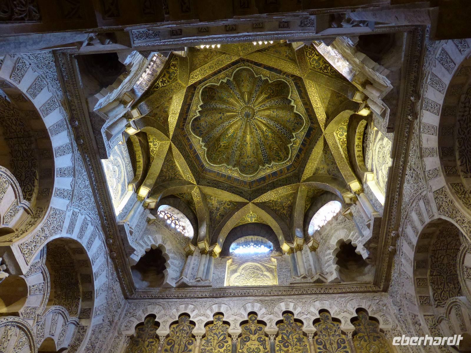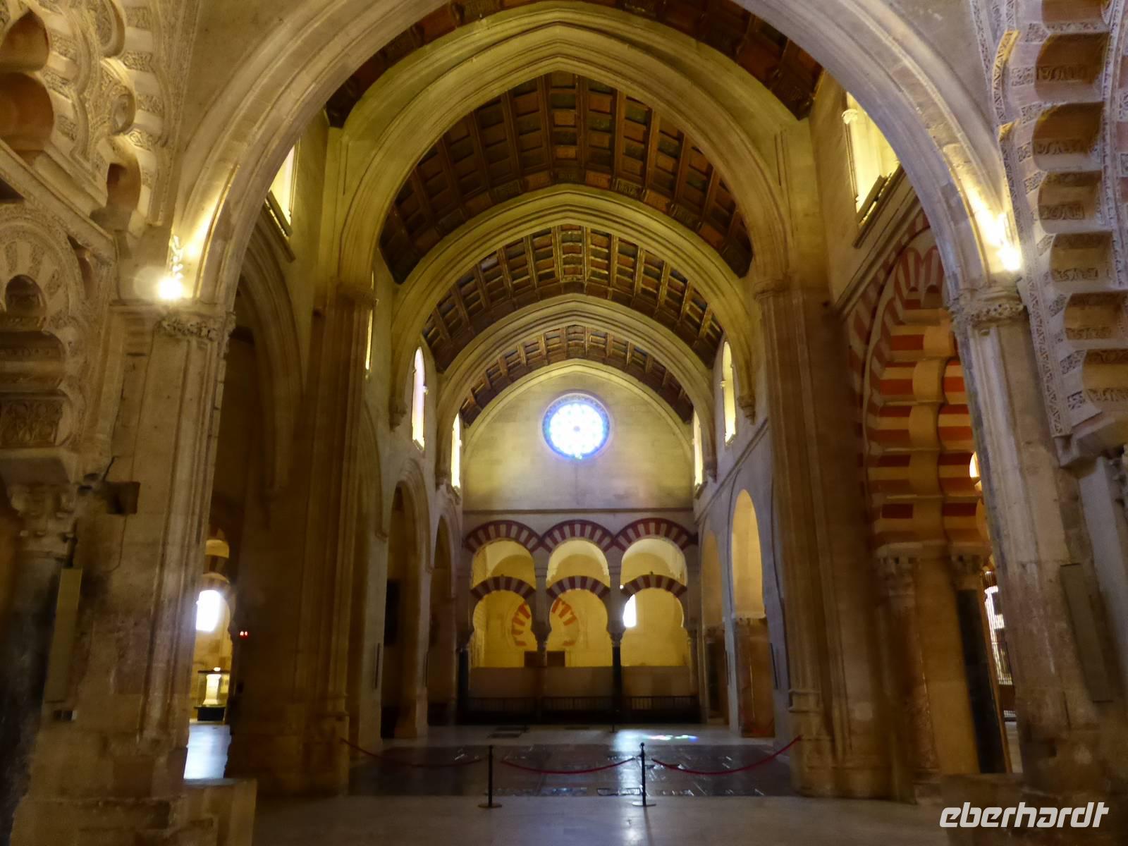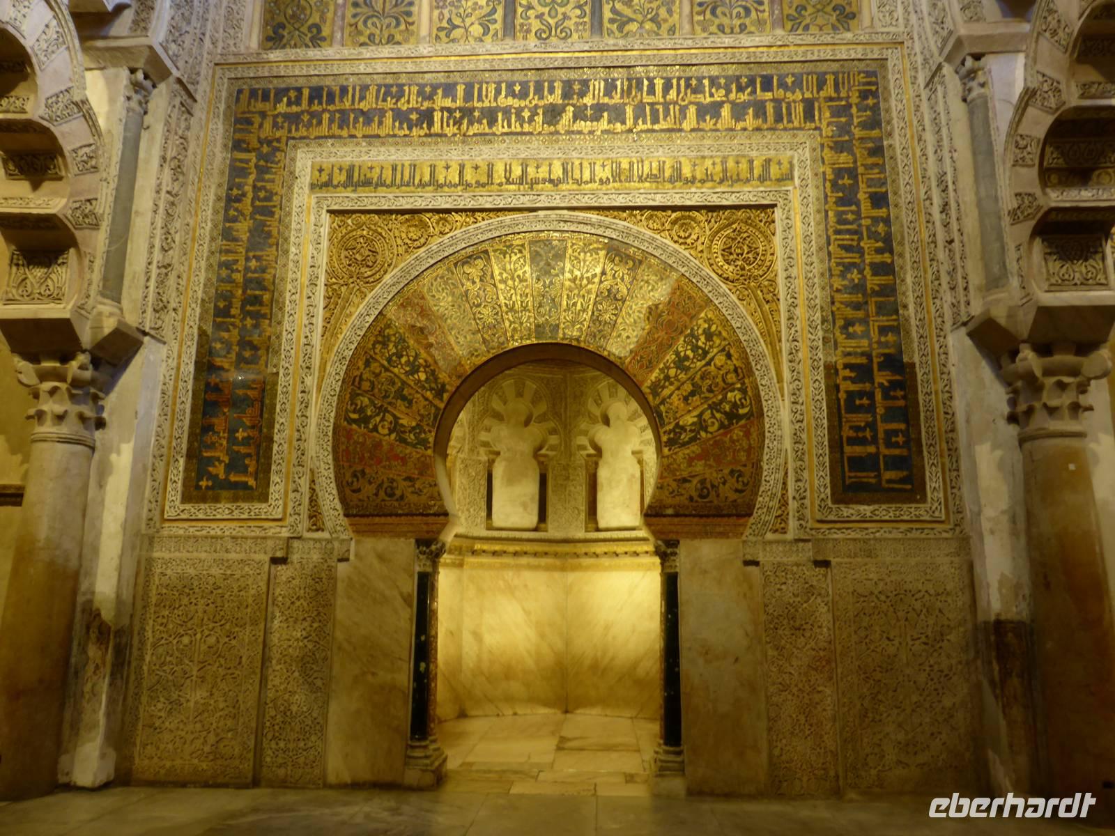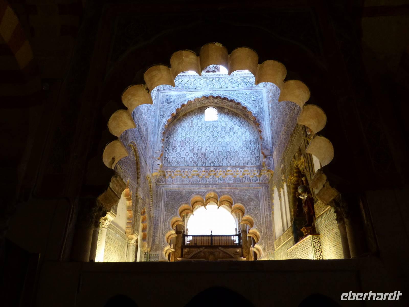 Die Mezquita von Cordoba war die Hauptmoschee des westlichen Kalifats und wurde über die Jahrhunderte von den islamischen Baumeistern immer wieder erweitert und umgebaut. Im Inneren versanken wir im endlosen Wald aus über 1000 Säulen und Hufeisenbögen. Besonders kunstvoll ist die Mihrab (Gebetsnische) gestaltet worden, von der aus der Imam das Gebet vortrug. Im 16. Jahrhundert begann unter Karl dem V. die größte bauliche Veränderung. Im Inneren der Mezquita entstand eine katholische Kathedrale, für deren Bau 70 Säulen weichen mussten. Heute wird die Mezquita-Kathedrale ausschließlich als katholisches Gotteshaus genutzt. Der Brunnen im Orangengarten bzw. Innenhof der ehemaligen Moschee diente den rituellen Waschungen vor dem Gebet und genau wie in Sevilla ist das ehemalige Minarett der Moschee heute der Glockenturm der Kathedrale.