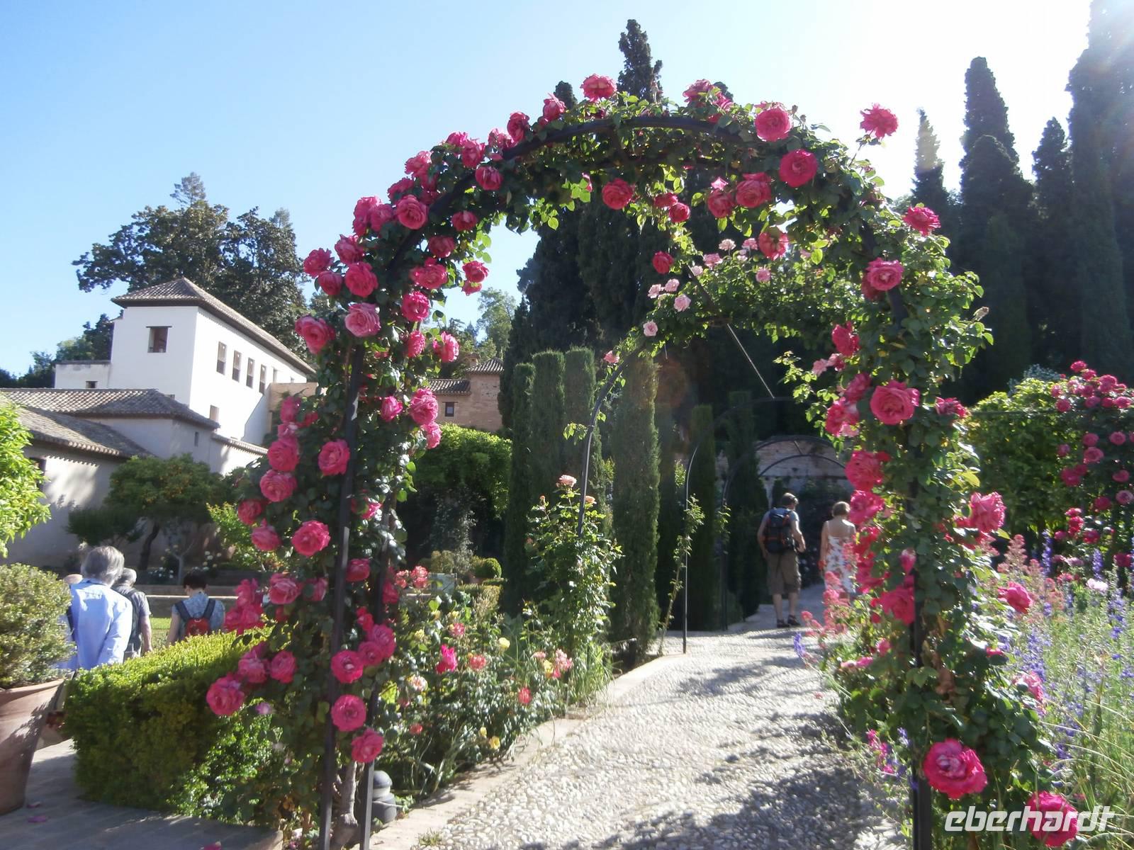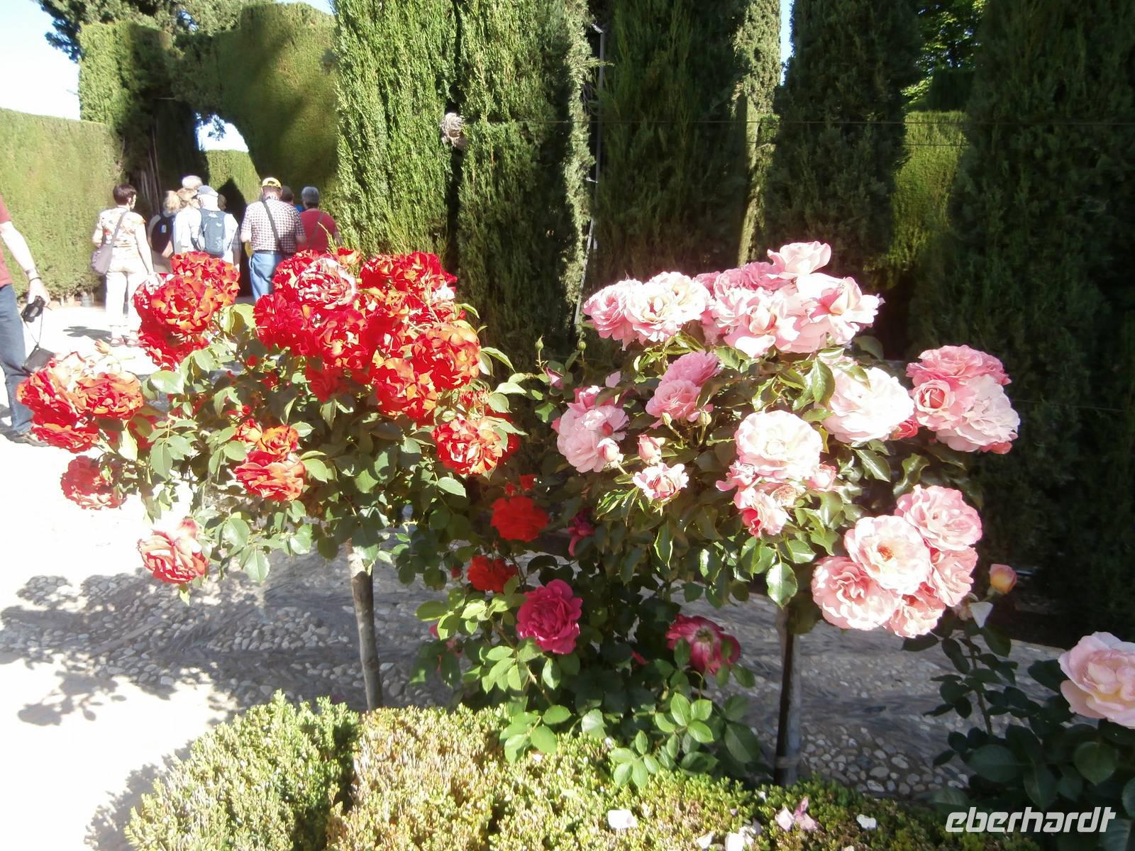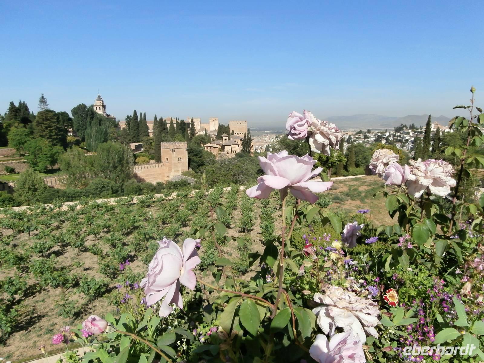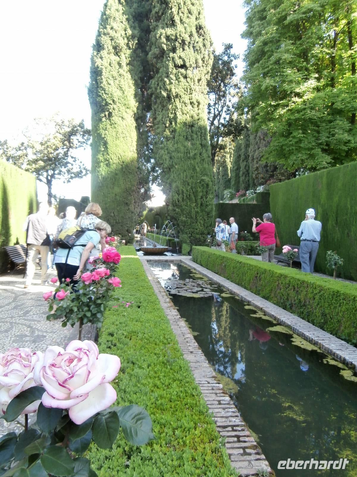 Eingestellt auf schönes Wetter und wieder mit hitzigen Temperaturen und viel Sonne, sind wir gespannt auf die Alhambra. Gemeinsam mit unserem Pepe, Reiseleiter mit Herz und Verstand und seiner Kollegin Fabiola starten wir im Hotel zur Besichtigung. Damit alle Gäste den Ausführungen entspannt lauschen können, werden zu Beginn Audioguids verteilt. Generalife-der weiträumige Garten des Architekten ist ein Refugium voller blühender Pflanzen, Orangen und Myrten mit Blick auf die Alhambra. Sehr schön auch die Wasserspiele im Fontänen Hof, sehenswert ist auch der Patio de los Cipreses und die berühmte Wassertreppe. Wir sind begeistert von den herrlichen Rosen, die in allen Farben blühen und ihren Duft versprühen. Ausblicke überall, Azur blau der Himmel über uns-einzigartig ist das Erlebnis in den Palastgärten.