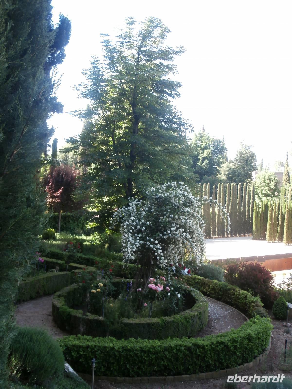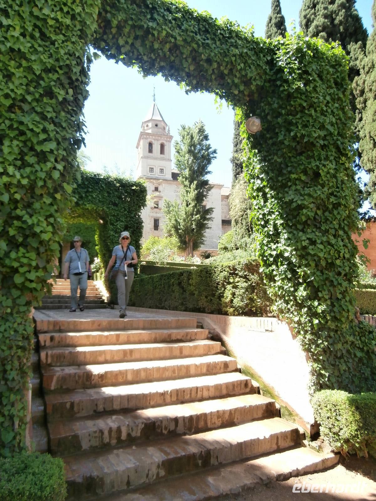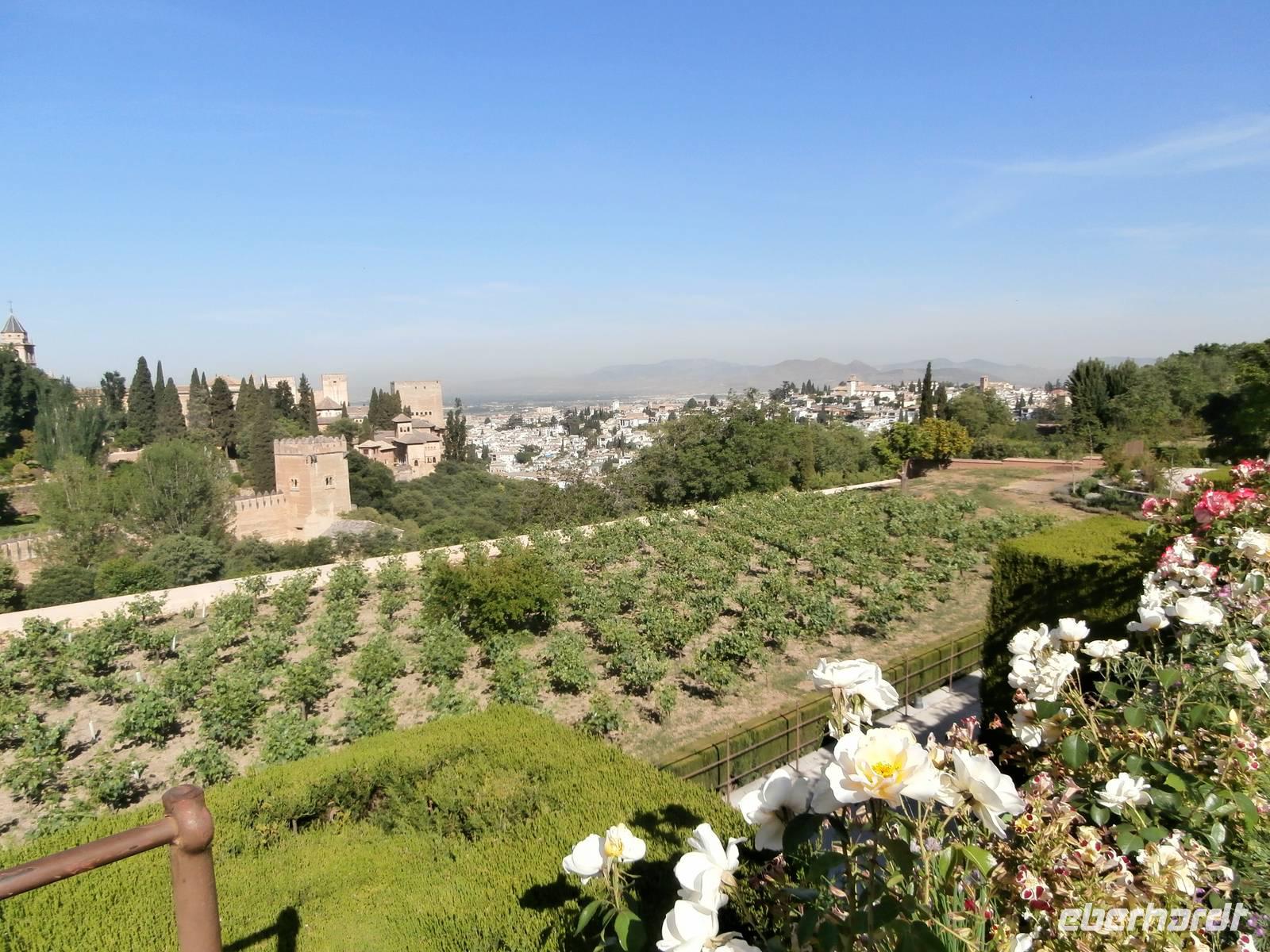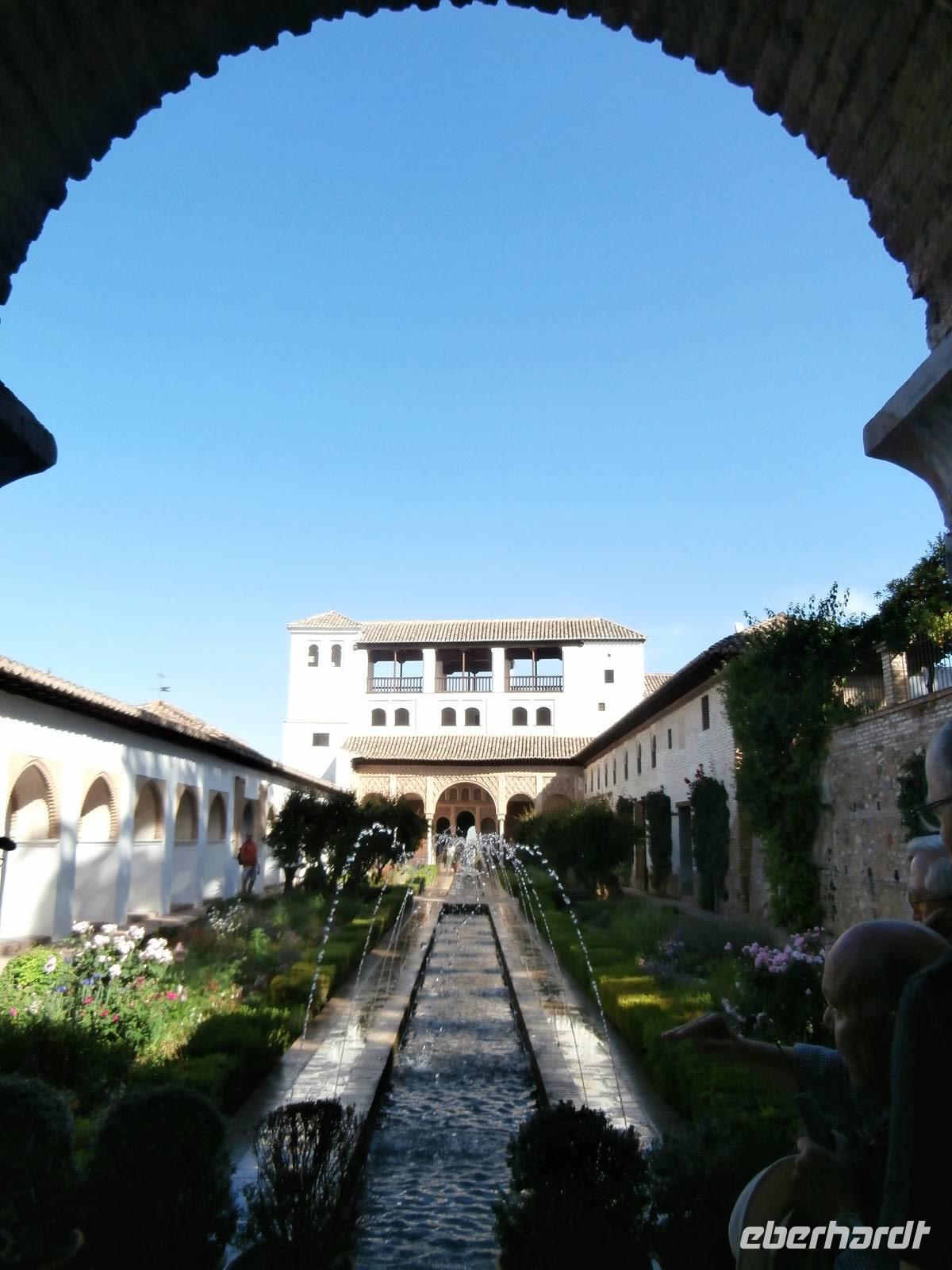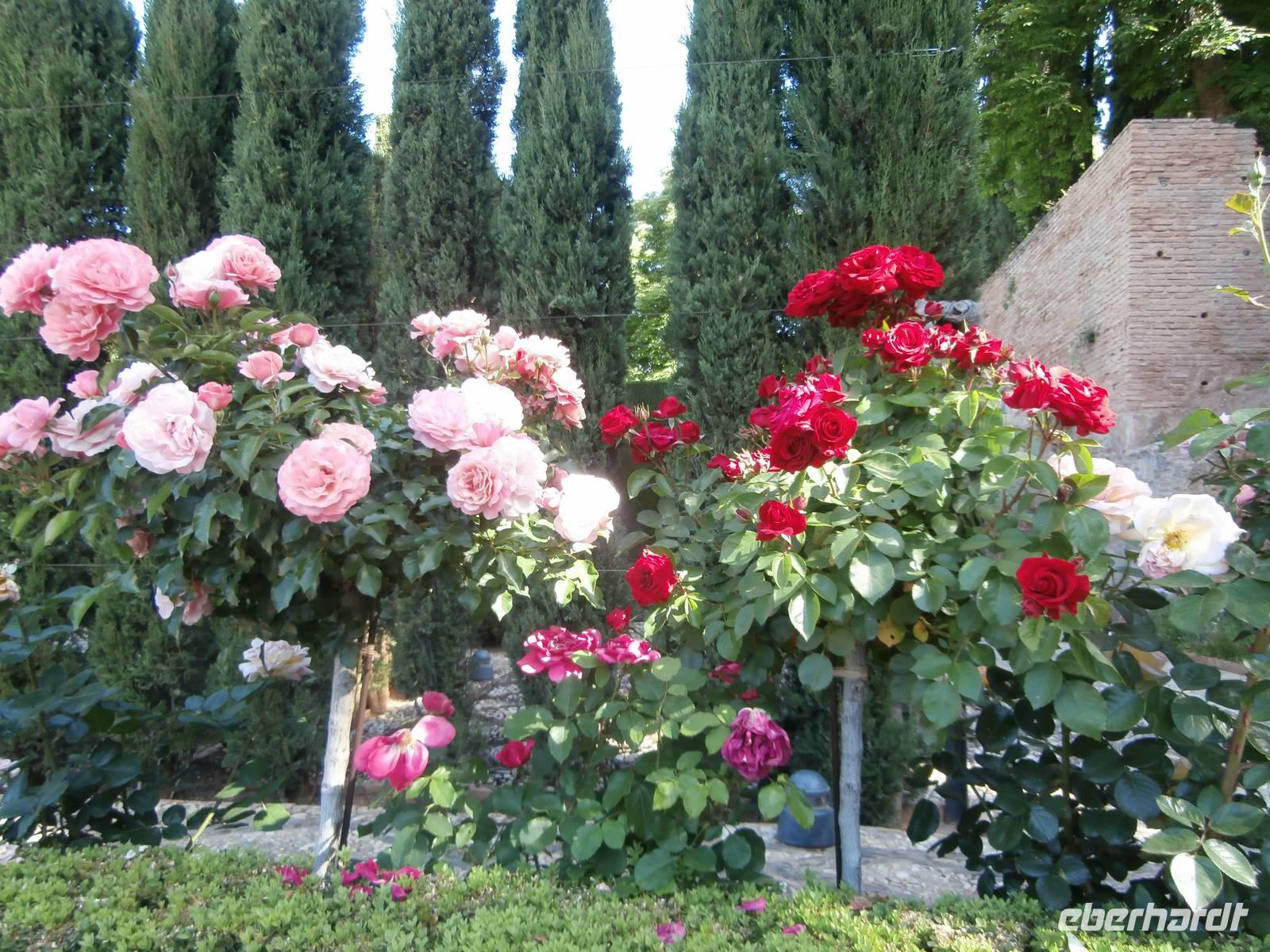 Eingestellt auf schönes Wetter und wieder mit hitzigen Temperaturen und viel Sonne, sind wir gespannt auf die Alhambra. Gemeinsam mit unserem Pepe, Reiseleiter mit Herz und Verstand und seiner Kollegin Fabiola starten wir im Hotel zur Besichtigung. Damit alle Gäste den Ausführungen entspannt lauschen können, werden zu Beginn Audioguids verteilt. Generalife-der weiträumige Garten des Architekten ist ein Refugium voller blühender Pflanzen, Orangen und Myrten mit Blick auf die Alhambra. Sehr schön auch die Wasserspiele im Fontänen Hof, sehenswert ist auch der Patio de los Cipreses und die berühmte Wassertreppe. Wir sind begeistert von den herrlichen Rosen, die in allen Farben blühen und ihren Duft versprühen. Ausblicke überall, Azur blau der Himmel über uns-einzigartig ist das Erlebnis in den Palastgärten.