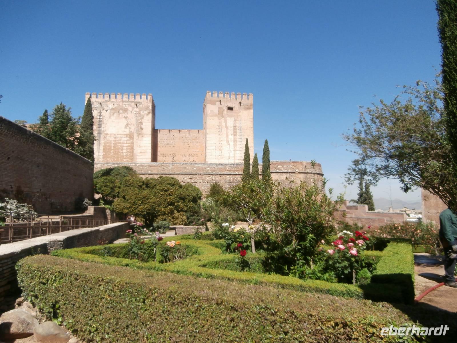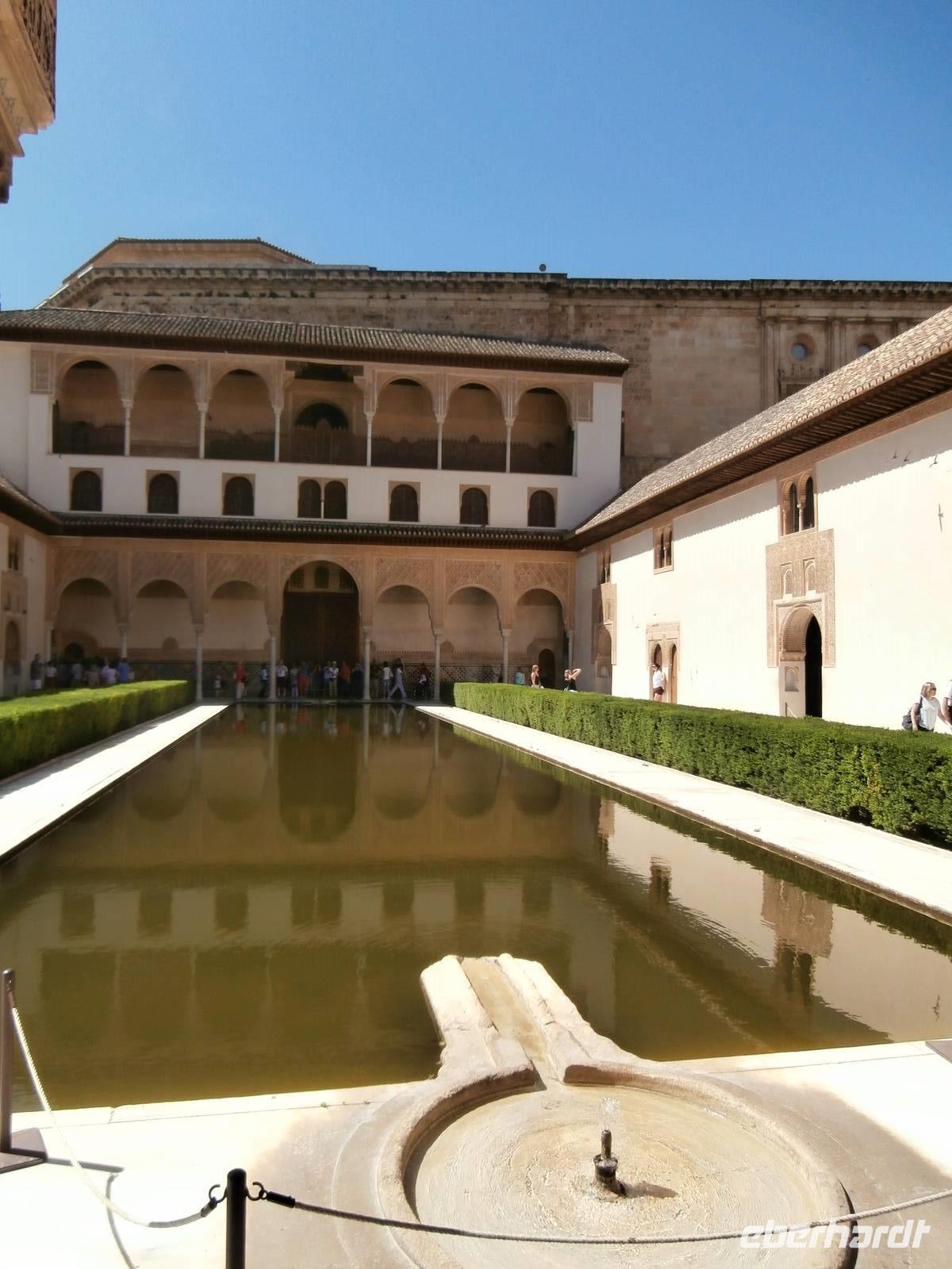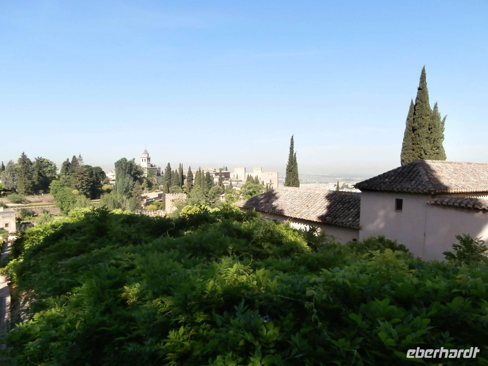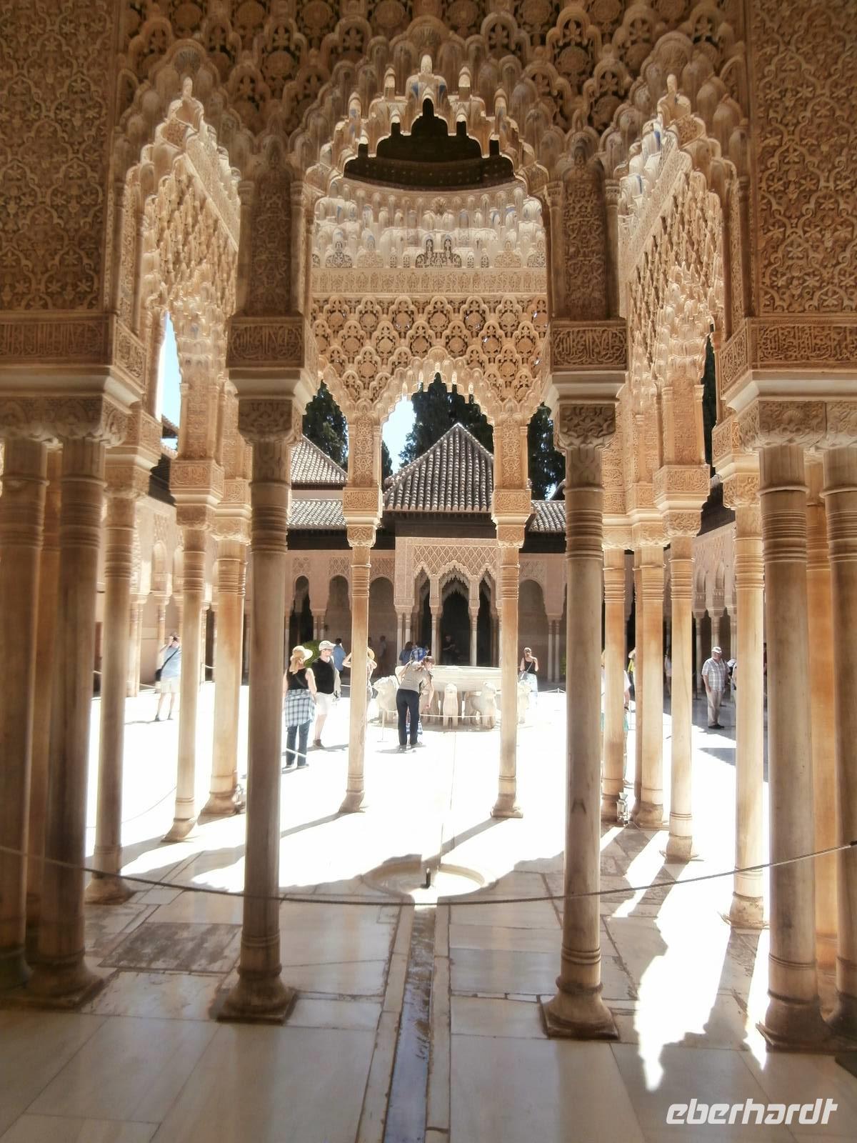 Wir tauchen ein in eine andere Welt, auf Mauern tanzen Blumen, Blätter, Sterne und dazwischen Allahs Name, tausendfach in weißen Marmor gemeißelt. Der älteste Teil der Anlage ist die Festung Alcazaba aus dem 9. JH. Künstlerisches Herzstück der Anlage ist der Löwenhof-ursprünglich ein blühender Garten, durch den das Wasser aus den 4 Himmelsrichtungen zur Mitte fließt. Wuchtig präsentiert sich der Renaissance Palast Karls V.