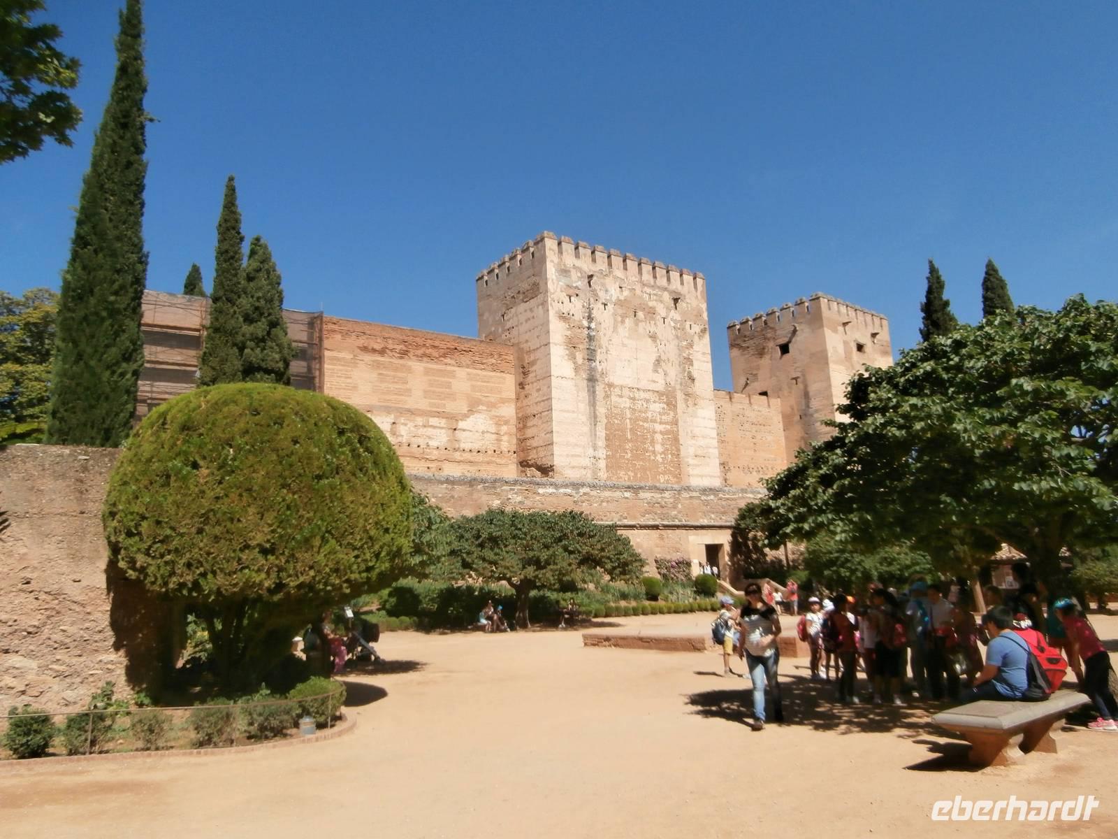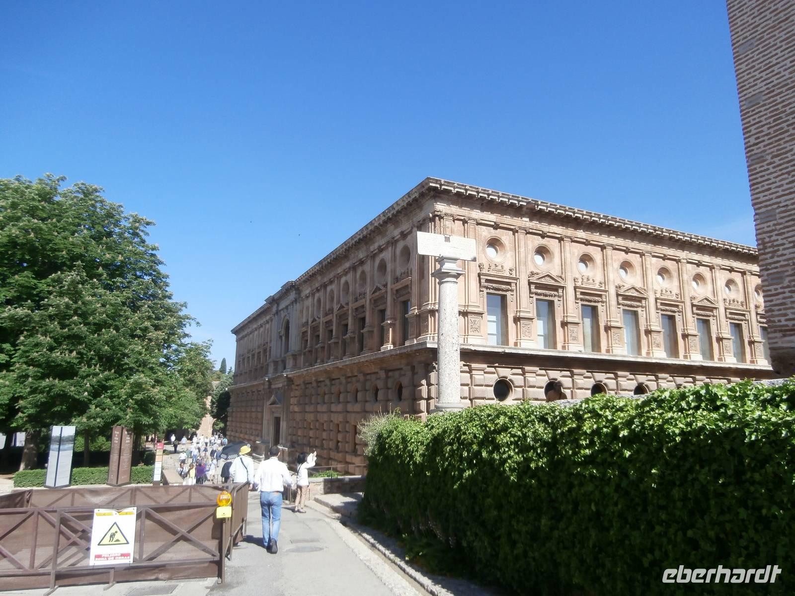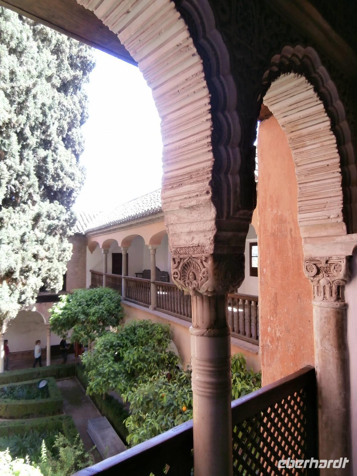Wir tauchen ein in eine andere Welt, auf Mauern tanzen Blumen, Blätter, Sterne und dazwischen Allahs Name, tausendfach in weißen Marmor gemeißelt. Der älteste Teil der Anlage ist die Festung Alcazaba aus dem 9. JH. Künstlerisches Herzstück der Anlage ist der Löwenhof-ursprünglich ein blühender Garten, durch den das Wasser aus den 4 Himmelsrichtungen zur Mitte fließt. Wuchtig präsentiert sich der Renaissance Palast Karls V.