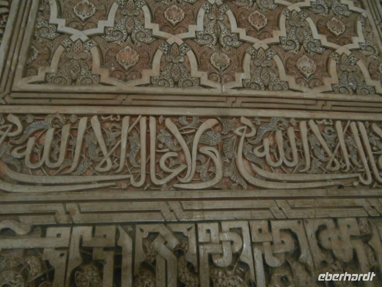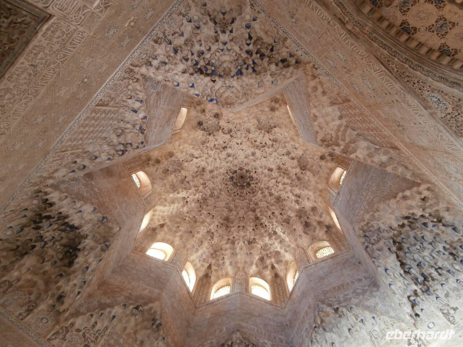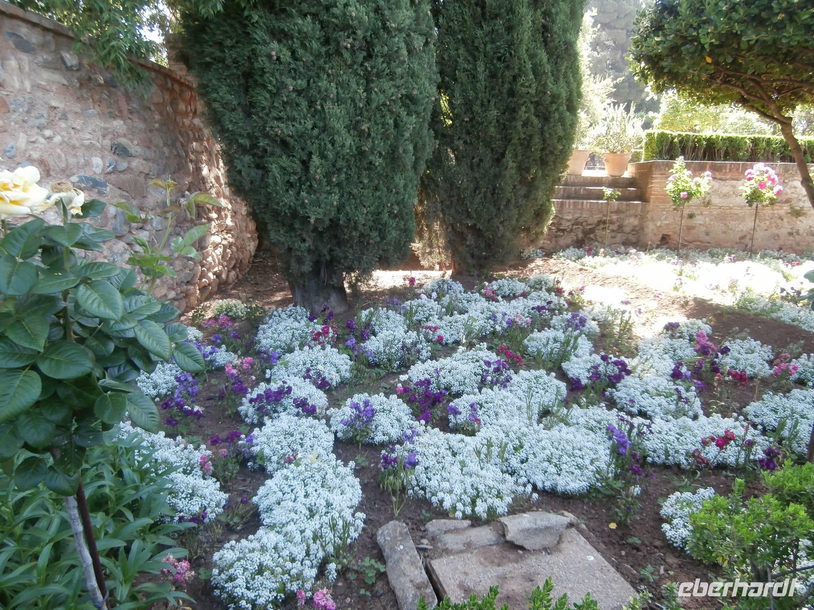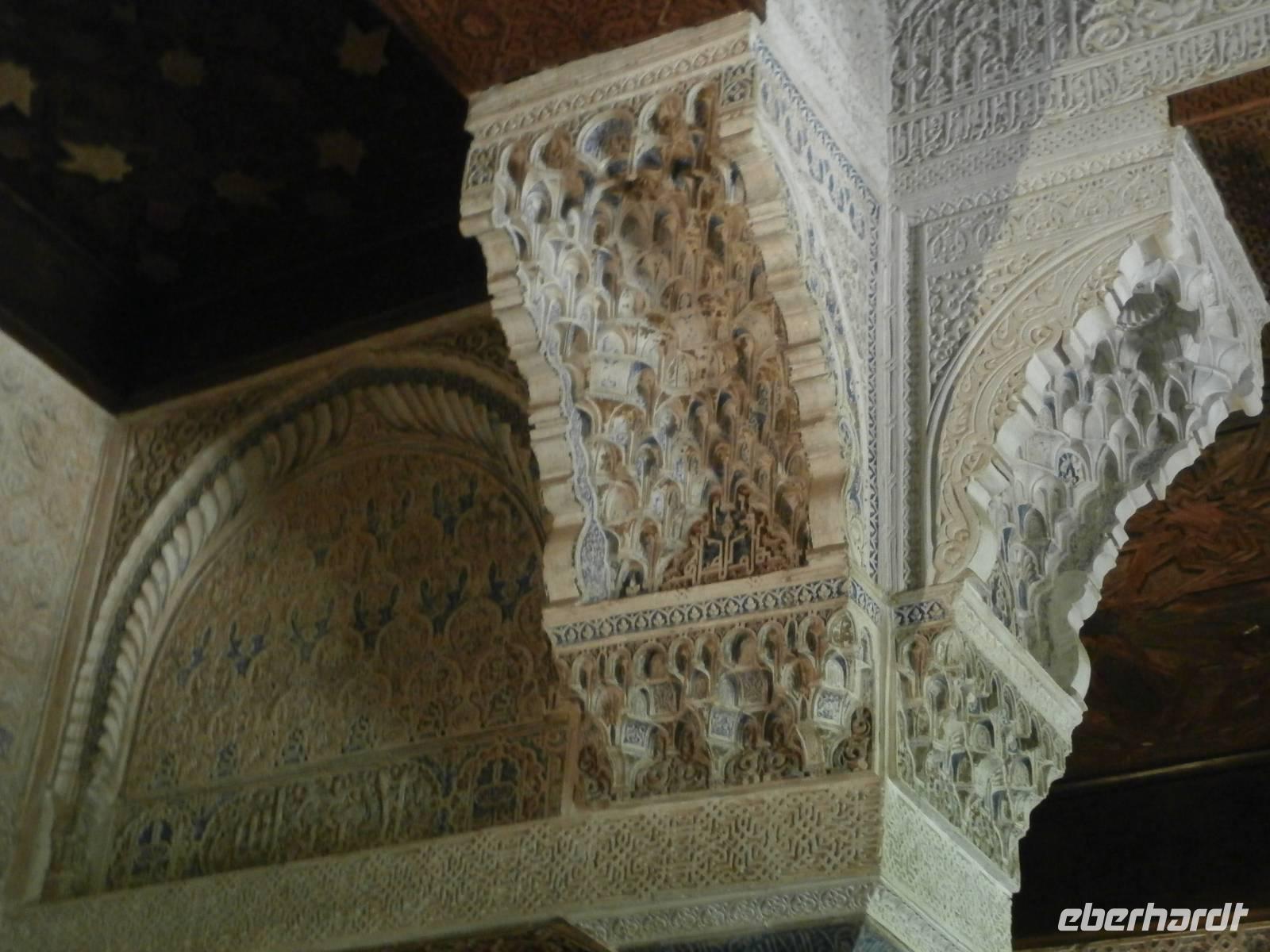 Wir tauchen ein in eine andere Welt, auf Mauern tanzen Blumen, Blätter, Sterne und dazwischen Allahs Name, tausendfach in weißen Marmor gemeißelt. Der älteste Teil der Anlage ist die Festung Alcazaba aus dem 9. JH. Künstlerisches Herzstück der Anlage ist der Löwenhof-ursprünglich ein blühender Garten, durch den das Wasser aus den 4 Himmelsrichtungen zur Mitte fließt. Wuchtig präsentiert sich der Renaissance Palast Karls V.