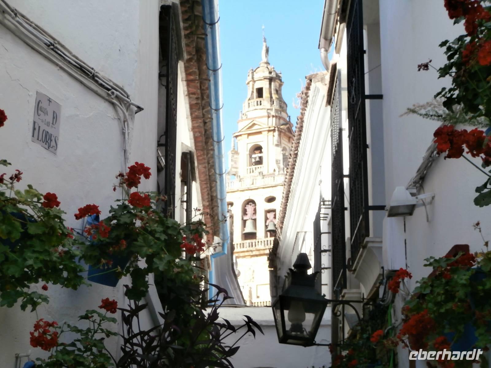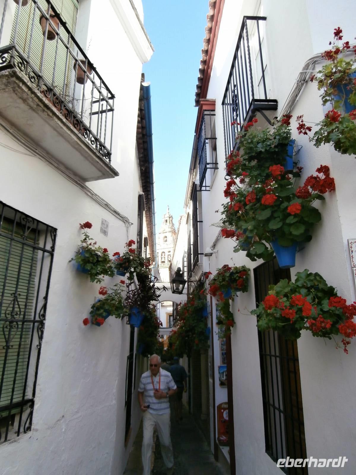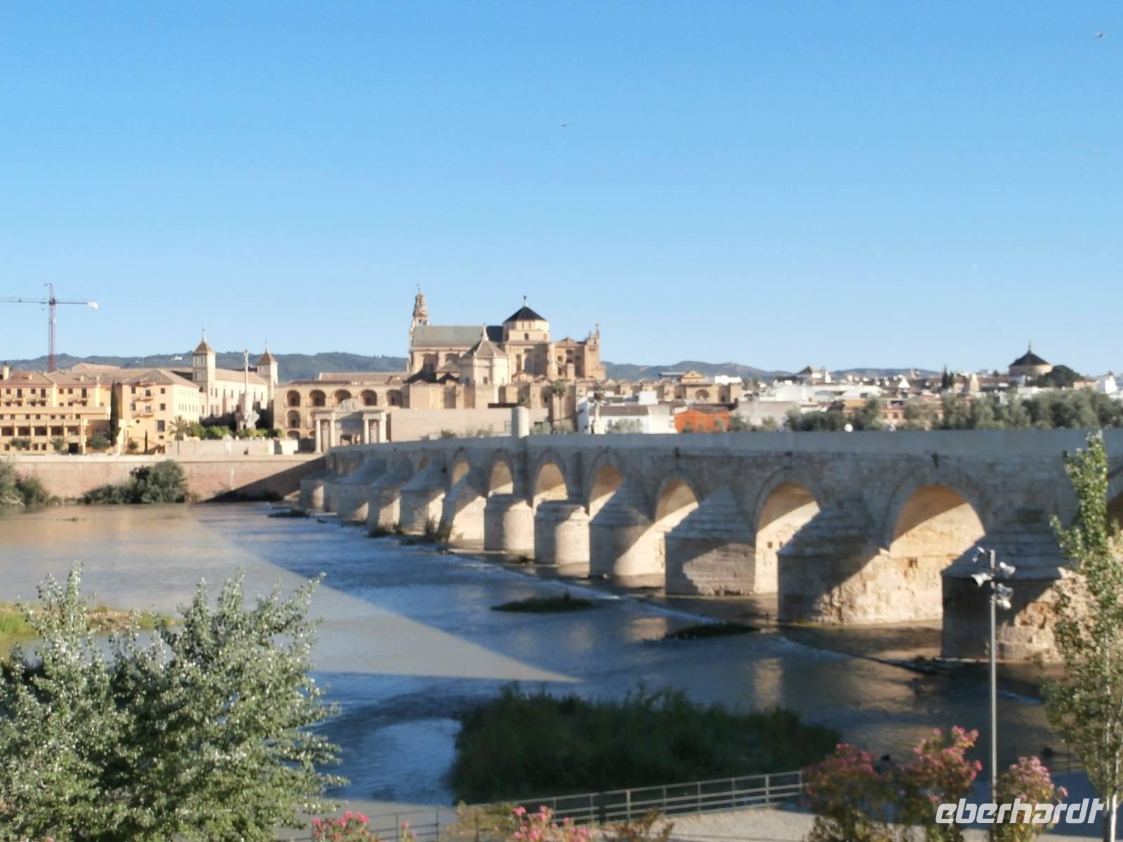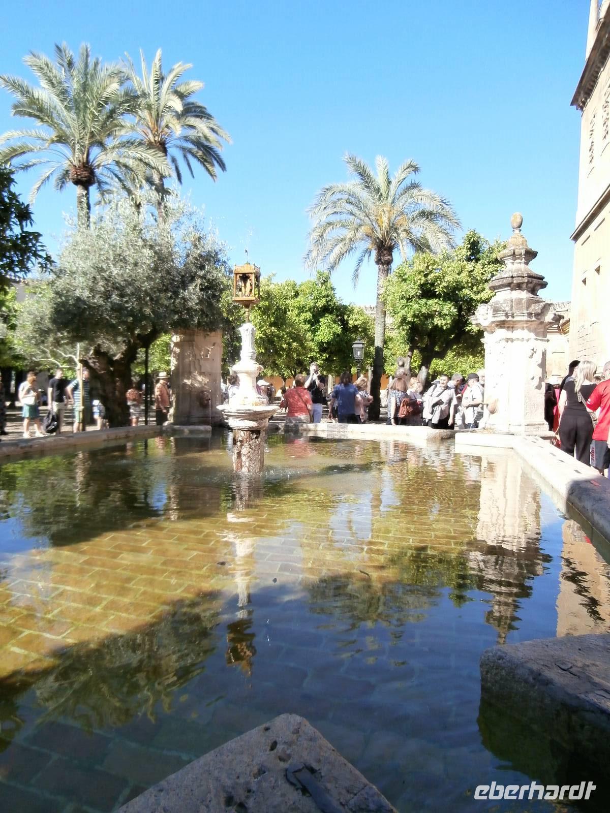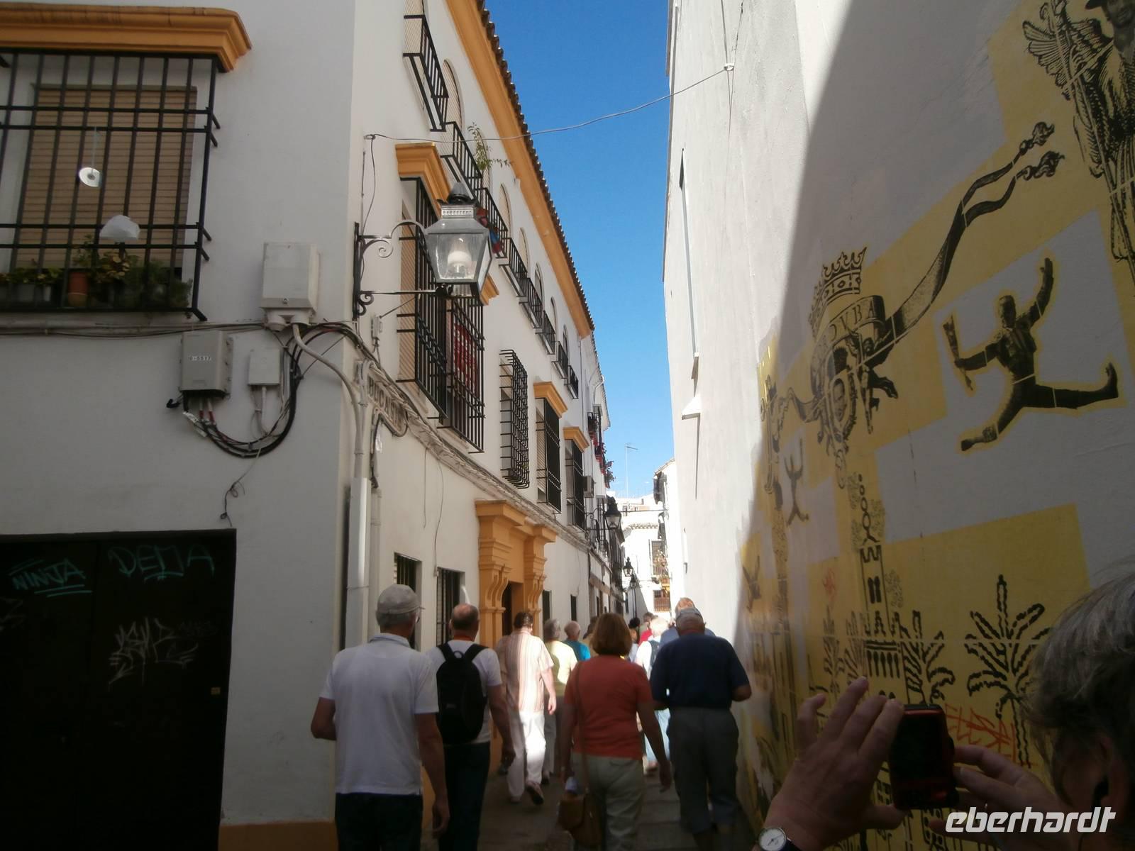 Pünktlich landet unser Bus rückwärtsfahrend vorm Hotel an und schnell sind unsere Koffer wieder im Bus verstaut. Von unserer örtl. Reiseleiterin Pilar werden wir am Hotel erwartet und dann geht es mit unserem Bus zur Stadtrundfahrt vorbei am Garten der Maria Luisa bis hin zum Spanischen Platz. Nach dem Bummel über den Platz und reichlich Fotos und musikalischen Klängen geht die Fahrt im Bus weiter bis zum Ausstieg in Nähe des Torre del Oro, dem Goldenen Turm, am Rio Guadalquivir. Wir besichtigen zuerst den Alcazar, den Königspalast. Er ist ähnlich wie die Alhambra in Granada, aber älter, aus dem 12. JH und erbaut von der Almohaden-Dynastie. Wir sehen Decken aus vergoldeten Zedernholz, Türen aus Lerchen-und Teakholz, Kachelmosaiken in Schleifenmuster, was die Unendlichkeit Allahs verdeutlicht, mit Suren, Stuckarbeiten in Gips, Alabaster und beeindruckend auch die Hufeisenbögen und der Hof der Puppen. Durch das liebreizende Judenviertel gelangen wir zur Kathedrale, sie ist die drittgrößte der Welt nach dem Petersdom und St. Paul in London. 1402-1506 erbaut, der Hochaltar ist der größte christliche Altar der Welt. Der Glockenturm der Kathedrale entstand aus der Moschee, auf der Spitze ist die Wetterfahne, das Giralda-Siegeszeichen über den Islam. Am Grab von Kolumbus verweilen wir kurz und für Sportliche geht es hinauf auf der Rampe mit 35 Kurven, anstelle von Treppen, damit die Wächter früher mit dem Pferd zum Dienst gelangen konnten. Geniale Aussichten eröffnen sich von oben. Man sieht auch die Stierkampfarena von Sevilla. Wir verabschieden uns aus Sevilla, am Brunnen ist Treff und weiter geht die Fahrt nach Cordoba. Im Hotel las Adelfas etwas außerhalb in einer schönen Anlage Cordobas laden wir unser Gepäck aus und kühlen uns im Pool von der Hitze des Tages ab.