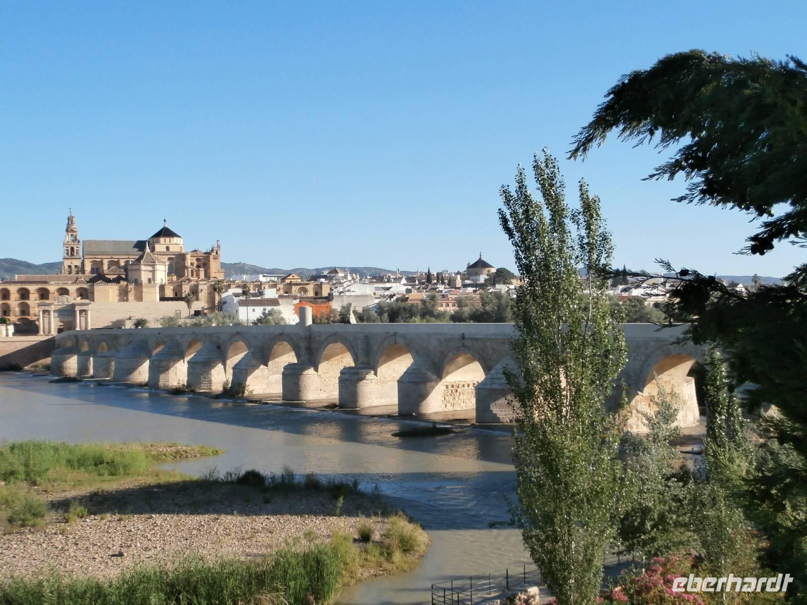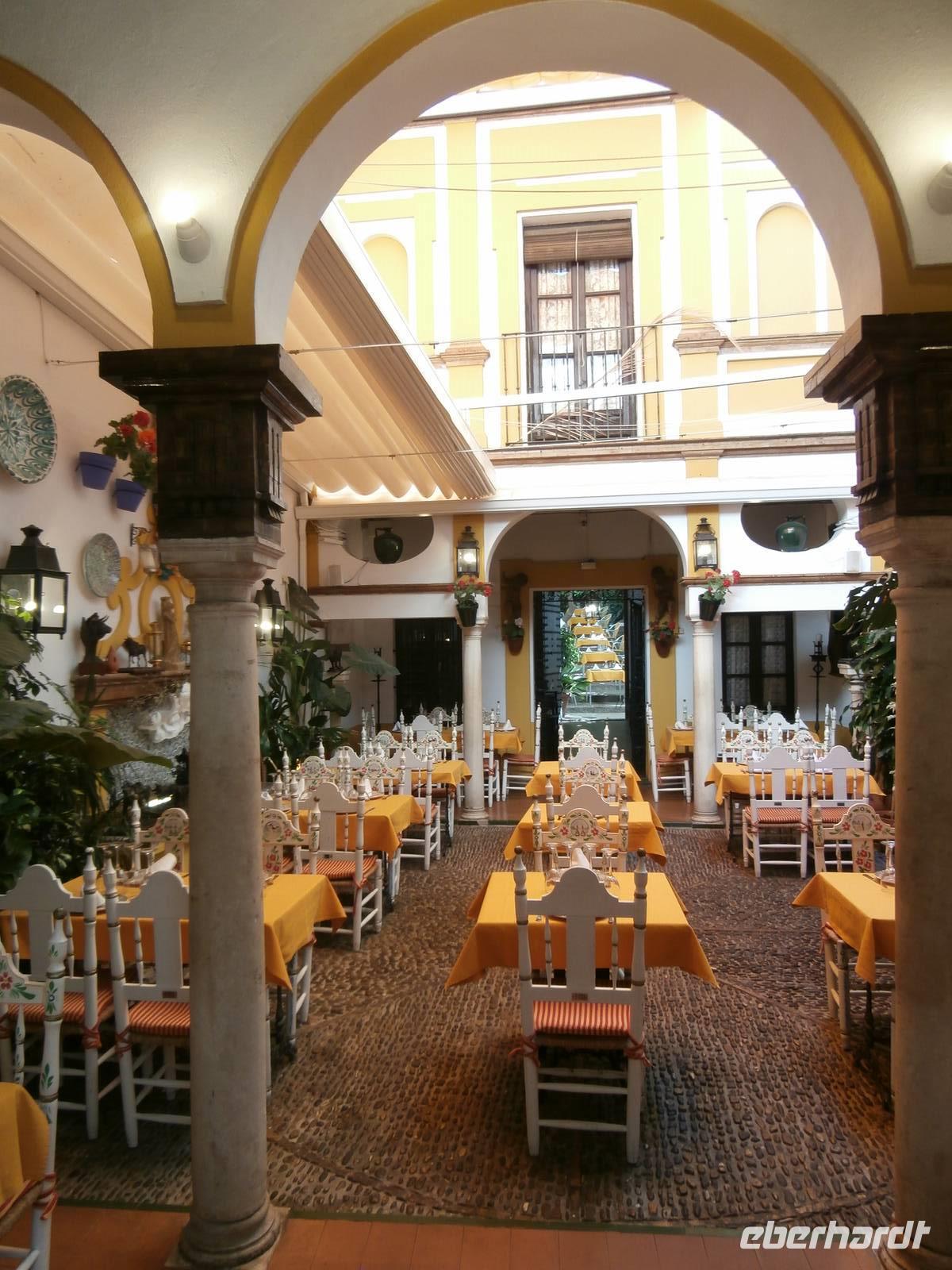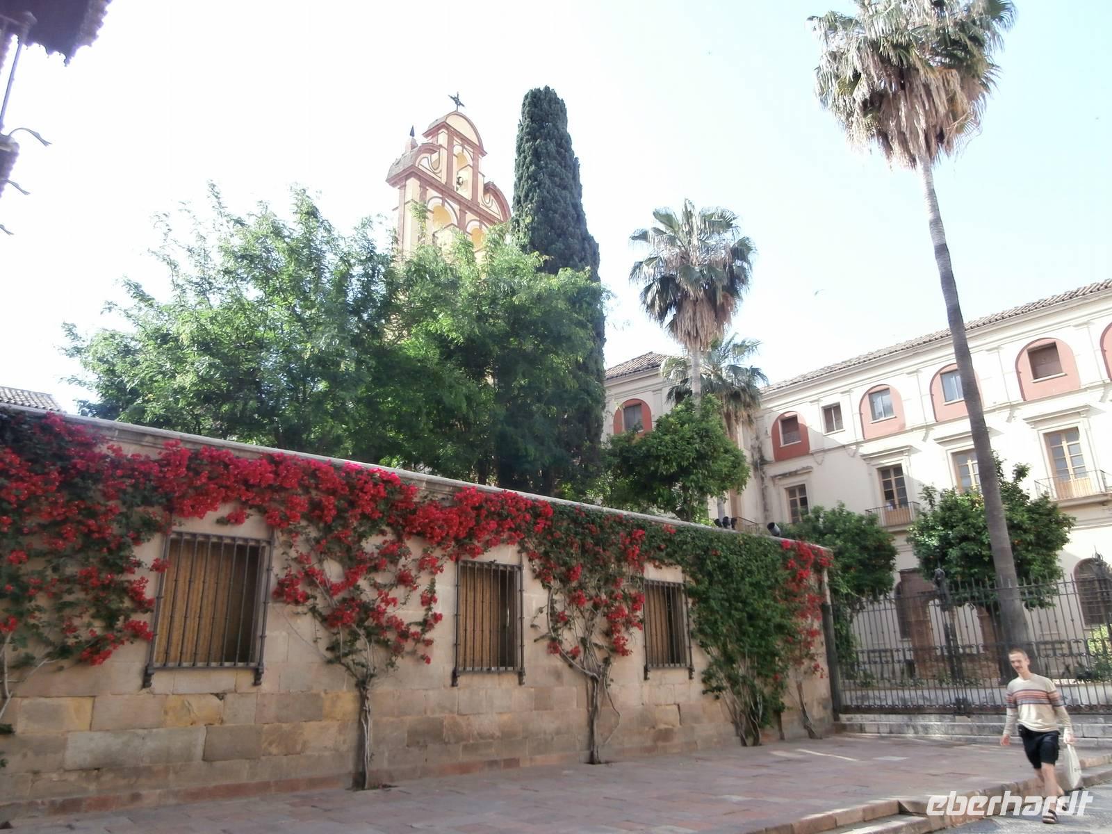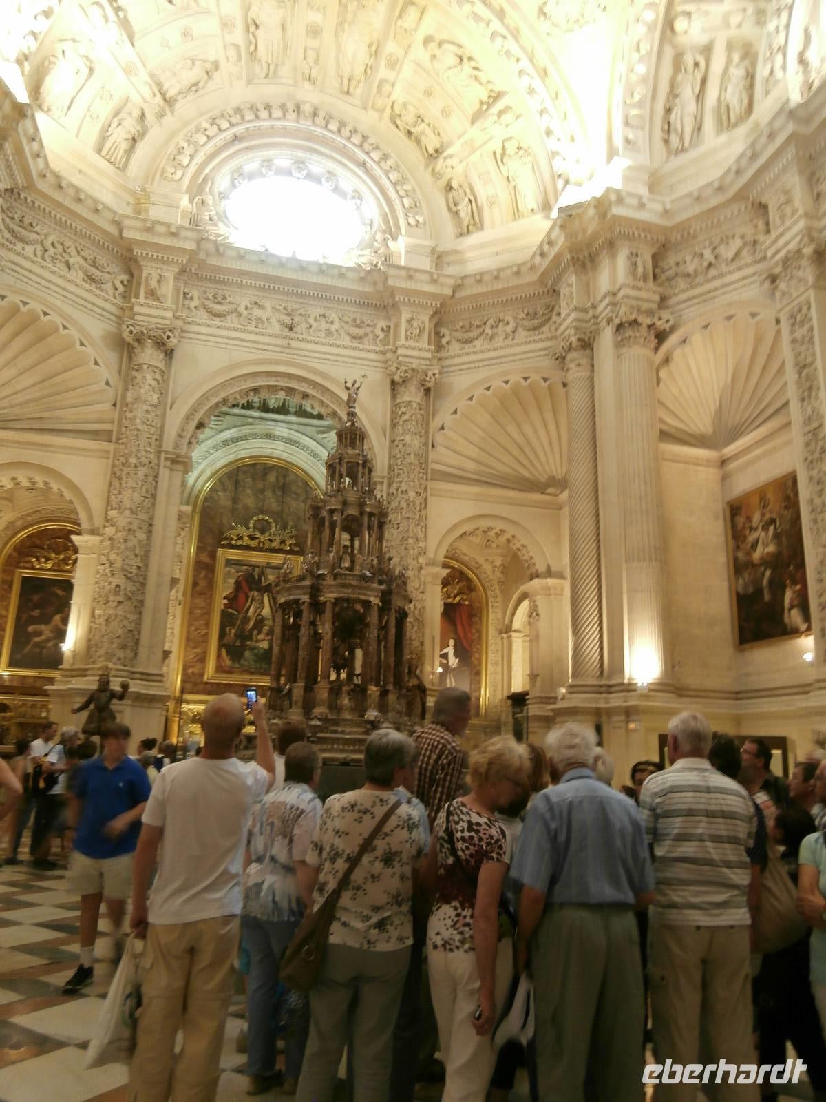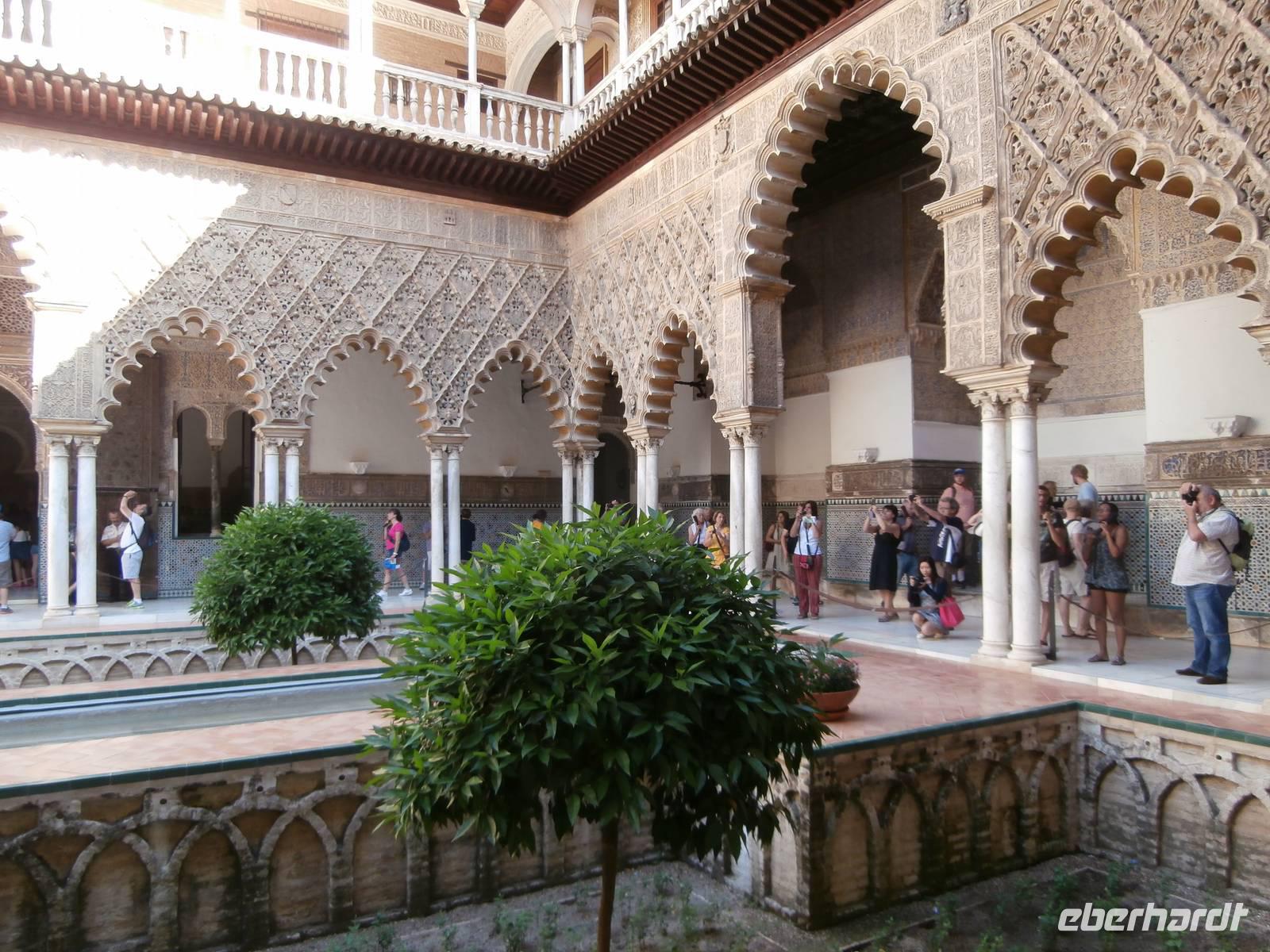 Pünktlich landet unser Bus rückwärtsfahrend vorm Hotel an und schnell sind unsere Koffer wieder im Bus verstaut. Von unserer örtl. Reiseleiterin Pilar werden wir am Hotel erwartet und dann geht es mit unserem Bus zur Stadtrundfahrt vorbei am Garten der Maria Luisa bis hin zum Spanischen Platz. Nach dem Bummel über den Platz und reichlich Fotos und musikalischen Klängen geht die Fahrt im Bus weiter bis zum Ausstieg in Nähe des Torre del Oro, dem Goldenen Turm, am Rio Guadalquivir. Wir besichtigen zuerst den Alcazar, den Königspalast. Er ist ähnlich wie die Alhambra in Granada, aber älter, aus dem 12. JH und erbaut von der Almohaden-Dynastie. Wir sehen Decken aus vergoldeten Zedernholz, Türen aus Lerchen-und Teakholz, Kachelmosaiken in Schleifenmuster, was die Unendlichkeit Allahs verdeutlicht, mit Suren, Stuckarbeiten in Gips, Alabaster und beeindruckend auch die Hufeisenbögen und der Hof der Puppen. Durch das liebreizende Judenviertel gelangen wir zur Kathedrale, sie ist die drittgrößte der Welt nach dem Petersdom und St. Paul in London. 1402-1506 erbaut, der Hochaltar ist der größte christliche Altar der Welt. Der Glockenturm der Kathedrale entstand aus der Moschee, auf der Spitze ist die Wetterfahne, das Giralda-Siegeszeichen über den Islam. Am Grab von Kolumbus verweilen wir kurz und für Sportliche geht es hinauf auf der Rampe mit 35 Kurven, anstelle von Treppen, damit die Wächter früher mit dem Pferd zum Dienst gelangen konnten. Geniale Aussichten eröffnen sich von oben. Man sieht auch die Stierkampfarena von Sevilla. Wir verabschieden uns aus Sevilla, am Brunnen ist Treff und weiter geht die Fahrt nach Cordoba. Im Hotel las Adelfas etwas außerhalb in einer schönen Anlage Cordobas laden wir unser Gepäck aus und kühlen uns im Pool von der Hitze des Tages ab.
