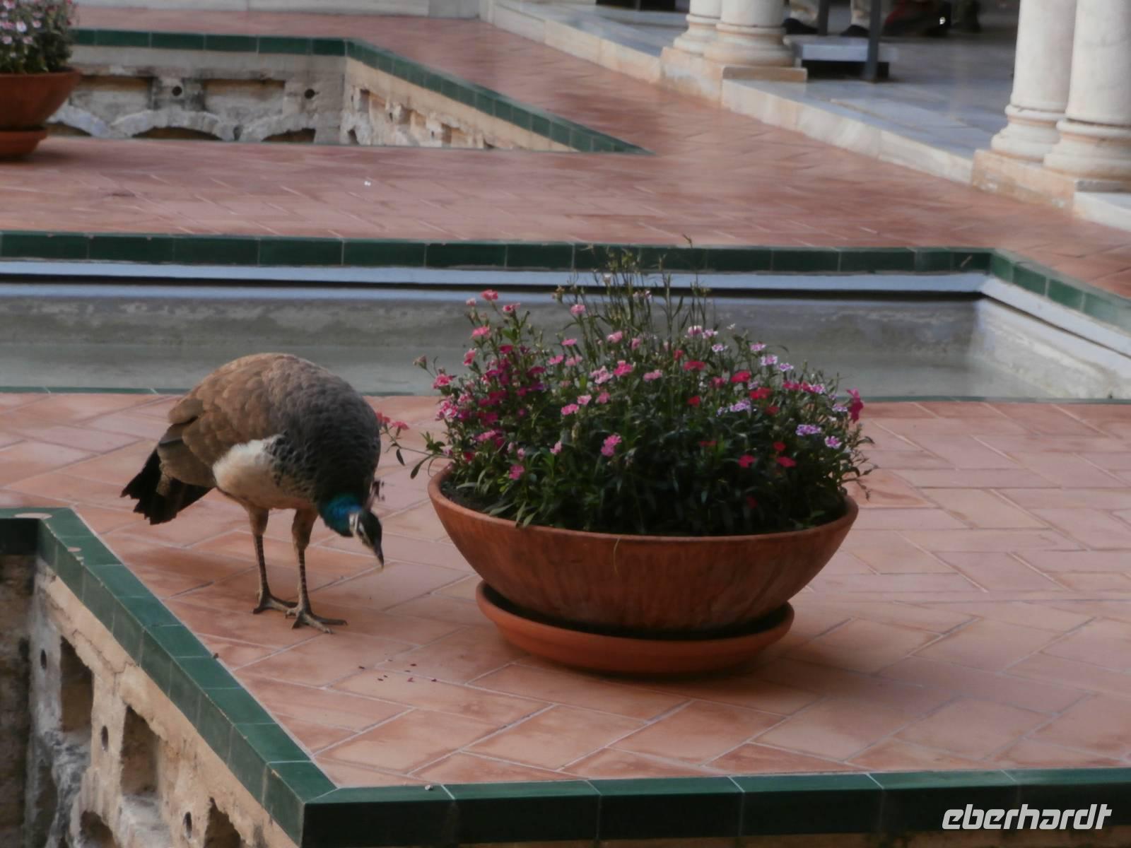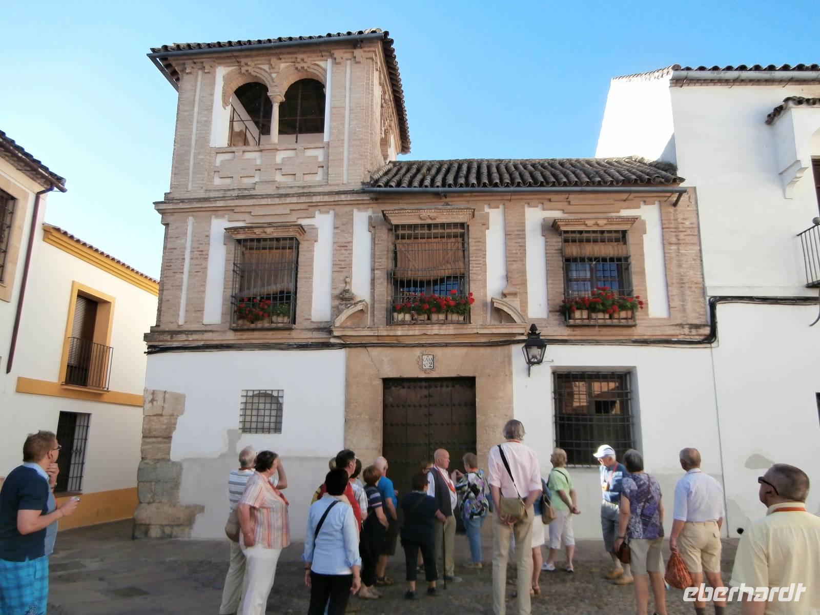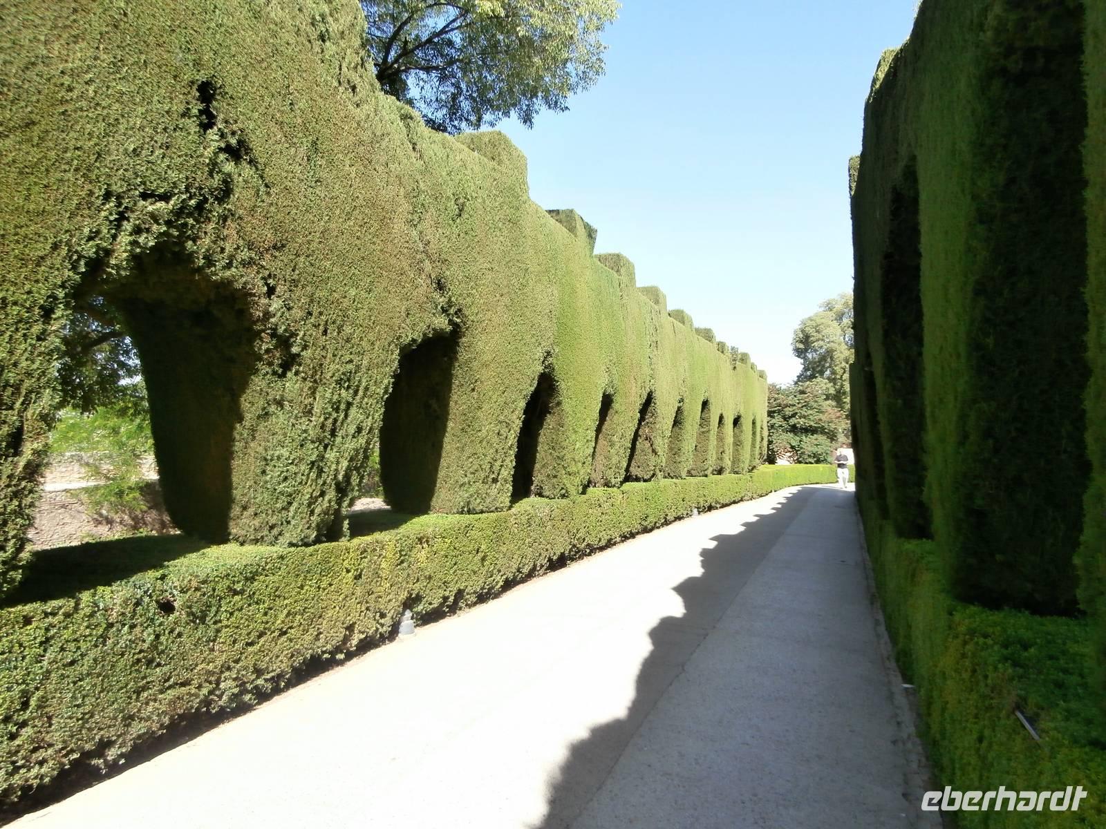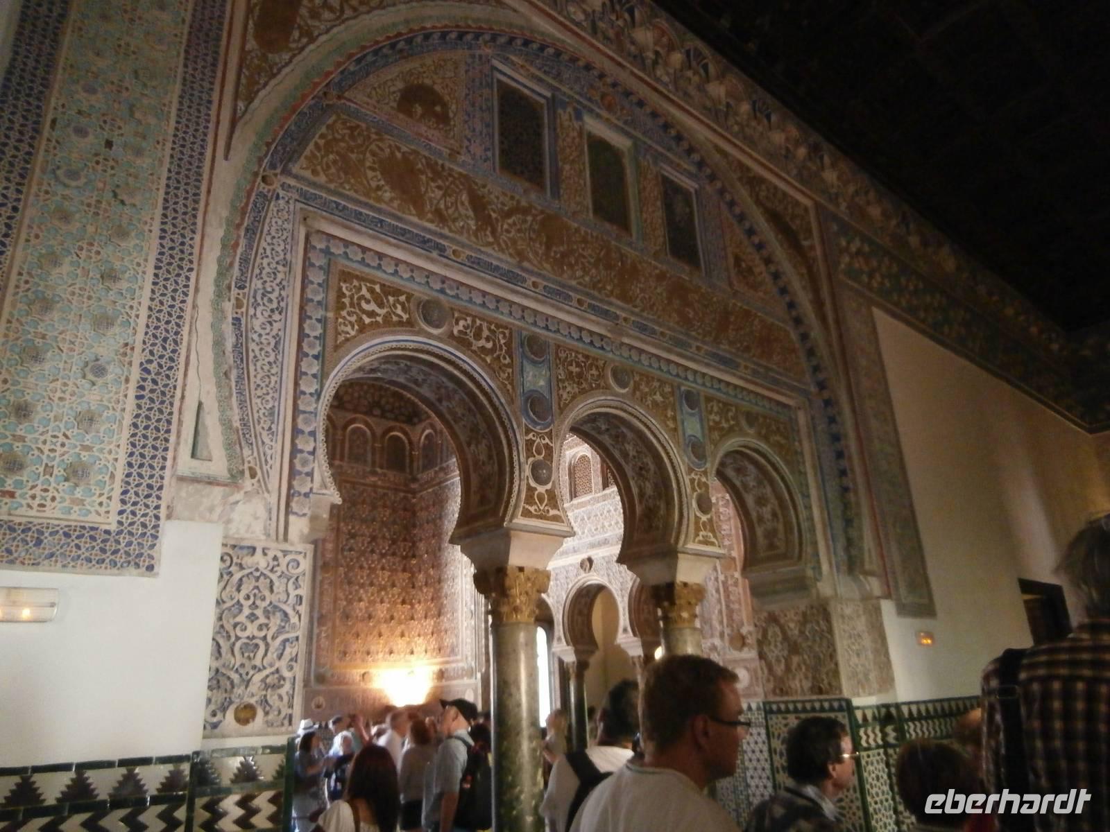 Pünktlich landet unser Bus rückwärtsfahrend vorm Hotel an und schnell sind unsere Koffer wieder im Bus verstaut. Von unserer örtl. Reiseleiterin Pilar werden wir am Hotel erwartet und dann geht es mit unserem Bus zur Stadtrundfahrt vorbei am Garten der Maria Luisa bis hin zum Spanischen Platz. Nach dem Bummel über den Platz und reichlich Fotos und musikalischen Klängen geht die Fahrt im Bus weiter bis zum Ausstieg in Nähe des Torre del Oro, dem Goldenen Turm, am Rio Guadalquivir. Wir besichtigen zuerst den Alcazar, den Königspalast. Er ist ähnlich wie die Alhambra in Granada, aber älter, aus dem 12. JH und erbaut von der Almohaden-Dynastie. Wir sehen Decken aus vergoldeten Zedernholz, Türen aus Lerchen-und Teakholz, Kachelmosaiken in Schleifenmuster, was die Unendlichkeit Allahs verdeutlicht, mit Suren, Stuckarbeiten in Gips, Alabaster und beeindruckend auch die Hufeisenbögen und der Hof der Puppen. Durch das liebreizende Judenviertel gelangen wir zur Kathedrale, sie ist die drittgrößte der Welt nach dem Petersdom und St. Paul in London. 1402-1506 erbaut, der Hochaltar ist der größte christliche Altar der Welt. Der Glockenturm der Kathedrale entstand aus der Moschee, auf der Spitze ist die Wetterfahne, das Giralda-Siegeszeichen über den Islam. Am Grab von Kolumbus verweilen wir kurz und für Sportliche geht es hinauf auf der Rampe mit 35 Kurven, anstelle von Treppen, damit die Wächter früher mit dem Pferd zum Dienst gelangen konnten. Geniale Aussichten eröffnen sich von oben. Man sieht auch die Stierkampfarena von Sevilla. Wir verabschieden uns aus Sevilla, am Brunnen ist Treff und weiter geht die Fahrt nach Cordoba. Im Hotel las Adelfas etwas außerhalb in einer schönen Anlage Cordobas laden wir unser Gepäck aus und kühlen uns im Pool von der Hitze des Tages ab.
