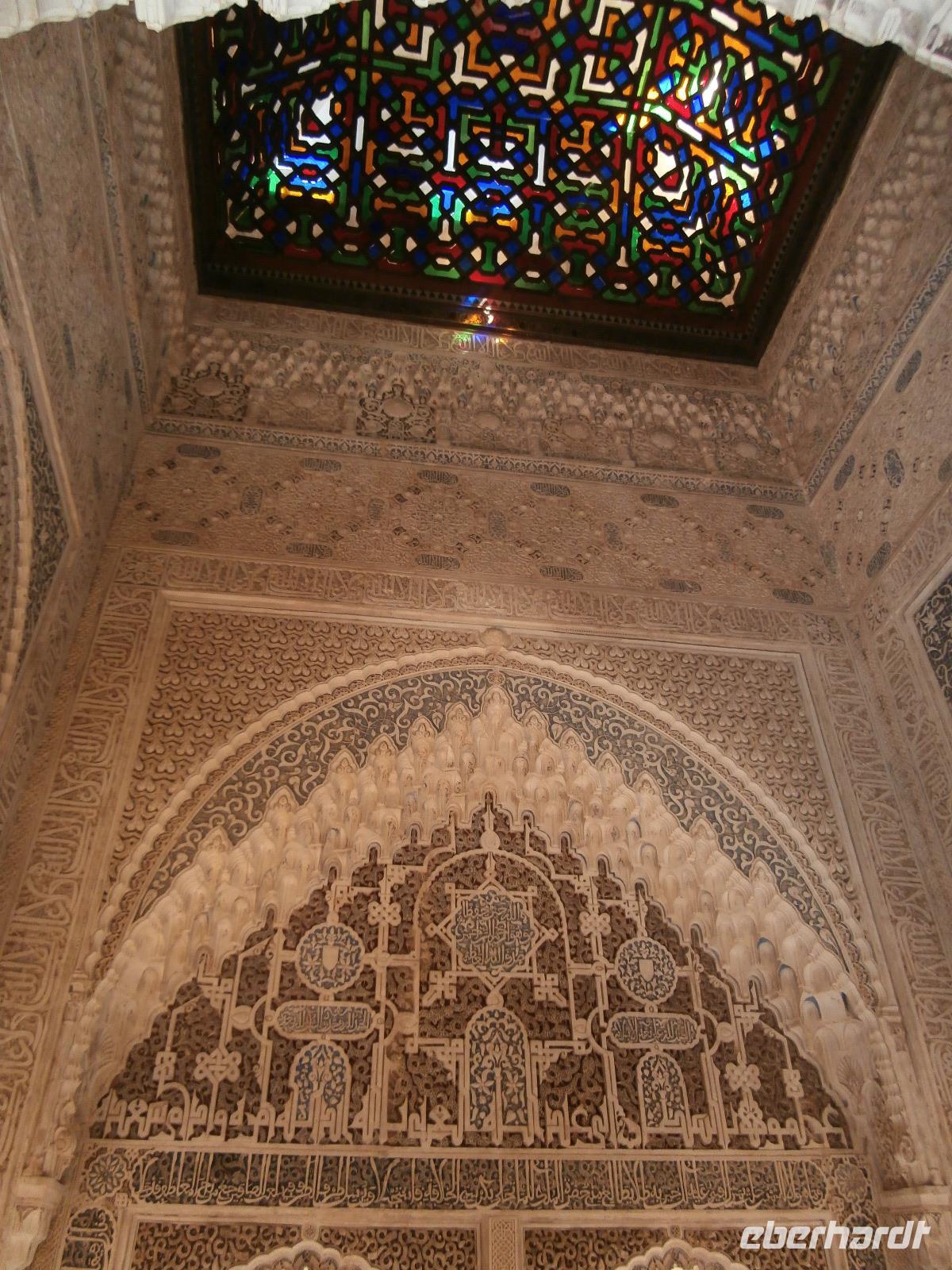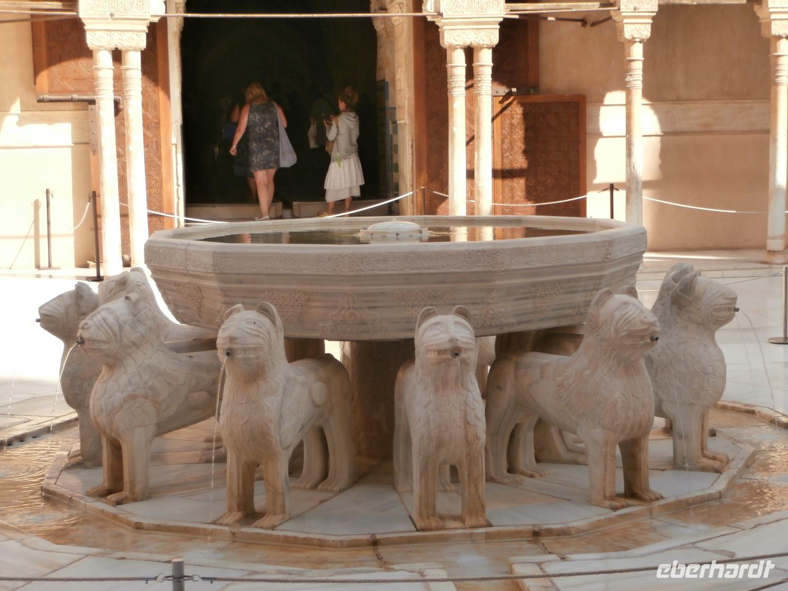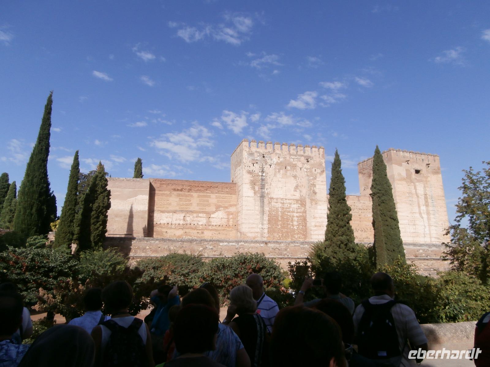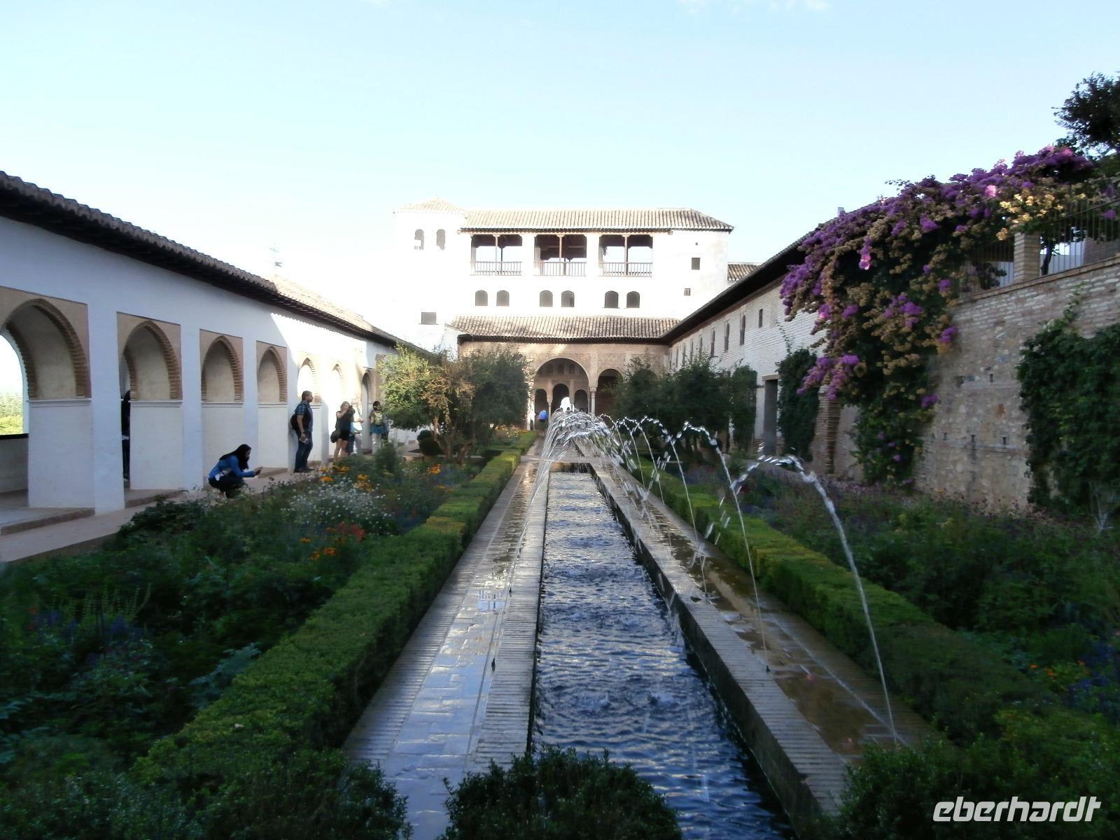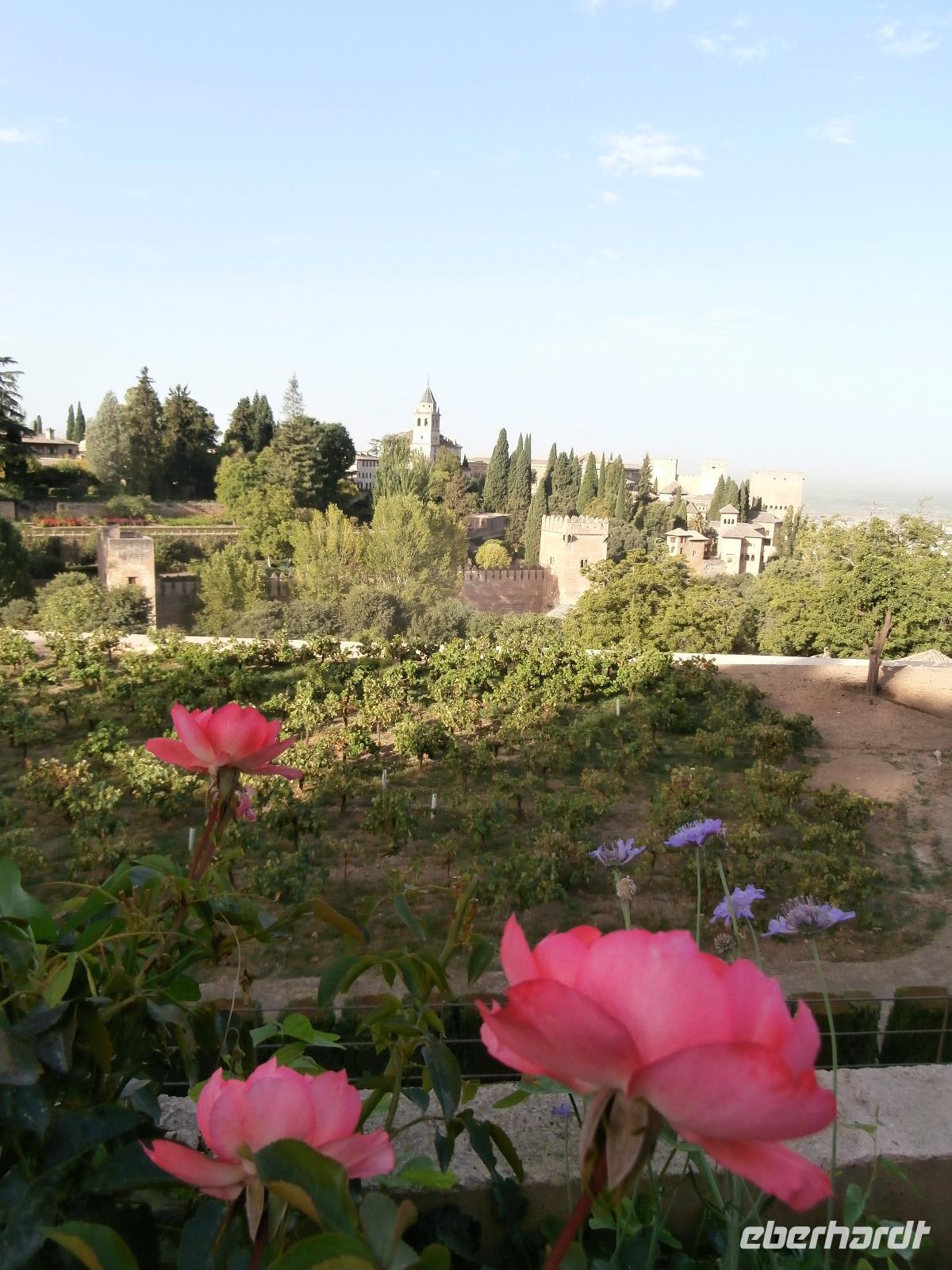 Eingestellt auf schönes Sommerwetter und mit angekündigten hitzigen Temperaturen, sind wir gespannt auf die Alhambra. Gemeinsam mit unserem Pepe, Reiseleiter mit Herz und Verstand und Maria seiner Kollegin, starten wir zur Besichtigung. Damit alle Gäste den Ausführungen entspannt lauschen können, werden zu Beginn Audioguids verteilt. Unsere Besichtigung führt uns heute Morgen zuerst hin zur Generalife, der weiträumige Garten des Architekten ist ein Refugium voller blühender Pflanzen, Orangen und Myrten mit Blick auf die Alhambra. Die wunderschöne sommerliche Bepflanzung ist schön anzusehen. Beeindruckend auch die Wasserspiele im Fontänen Hof, sehenswert ist auch der Patio de los Cipreses und die berühmte Wassertreppe. Ausblicke überall, teilweise Azur blau der Himmel über uns-einzigartig ist das Erlebnis in den Palastgärten. Danach besichtigen wir die Paläste, wir tauchen ein in eine andere Welt, auf Mauern tanzen Blumen, Blätter, Sterne und dazwischen Allahs Name, tausendfach in weißen Marmor gemeißelt. Der älteste Teil der Anlage ist die Festung Alcazaba aus dem 9. JH. Künstlerisches Herzstück der Anlage ist der Löwenhof-ursprünglich ein blühender Garten, durch den das Wasser aus den 4 Himmelsrichtungen zur Mitte fließt. Wuchtig präsentiert sich der Renaissance Palast Karls V.