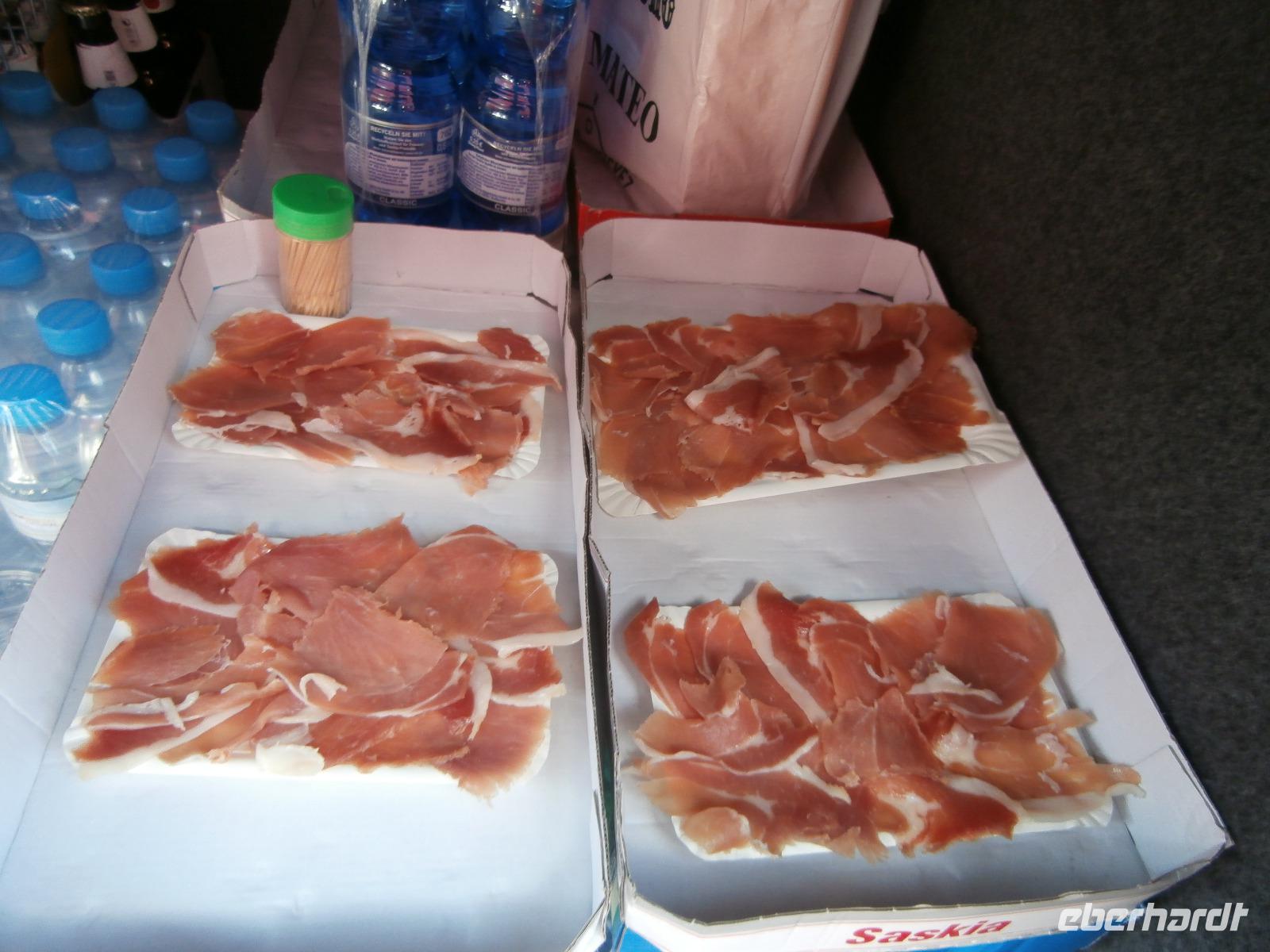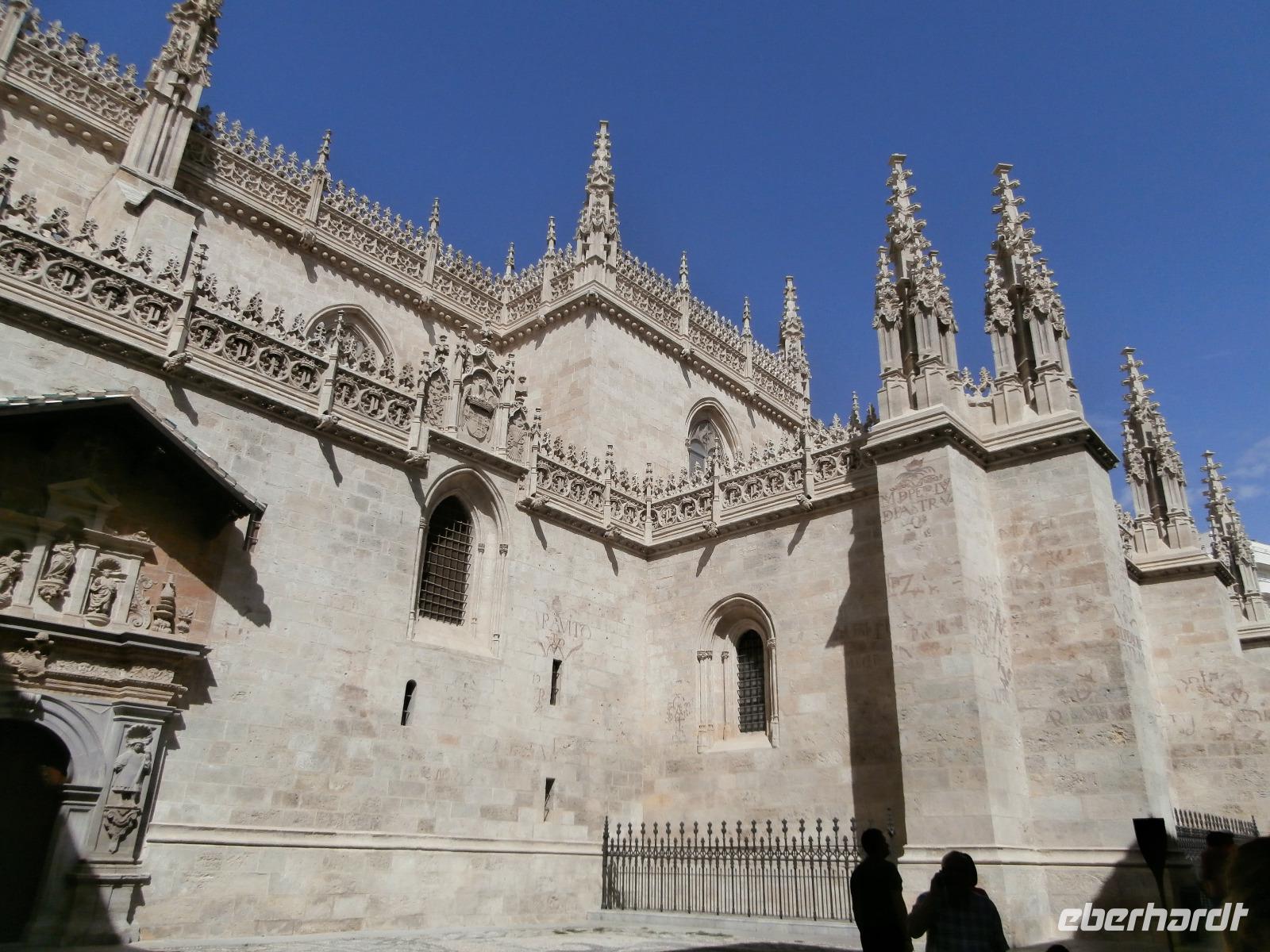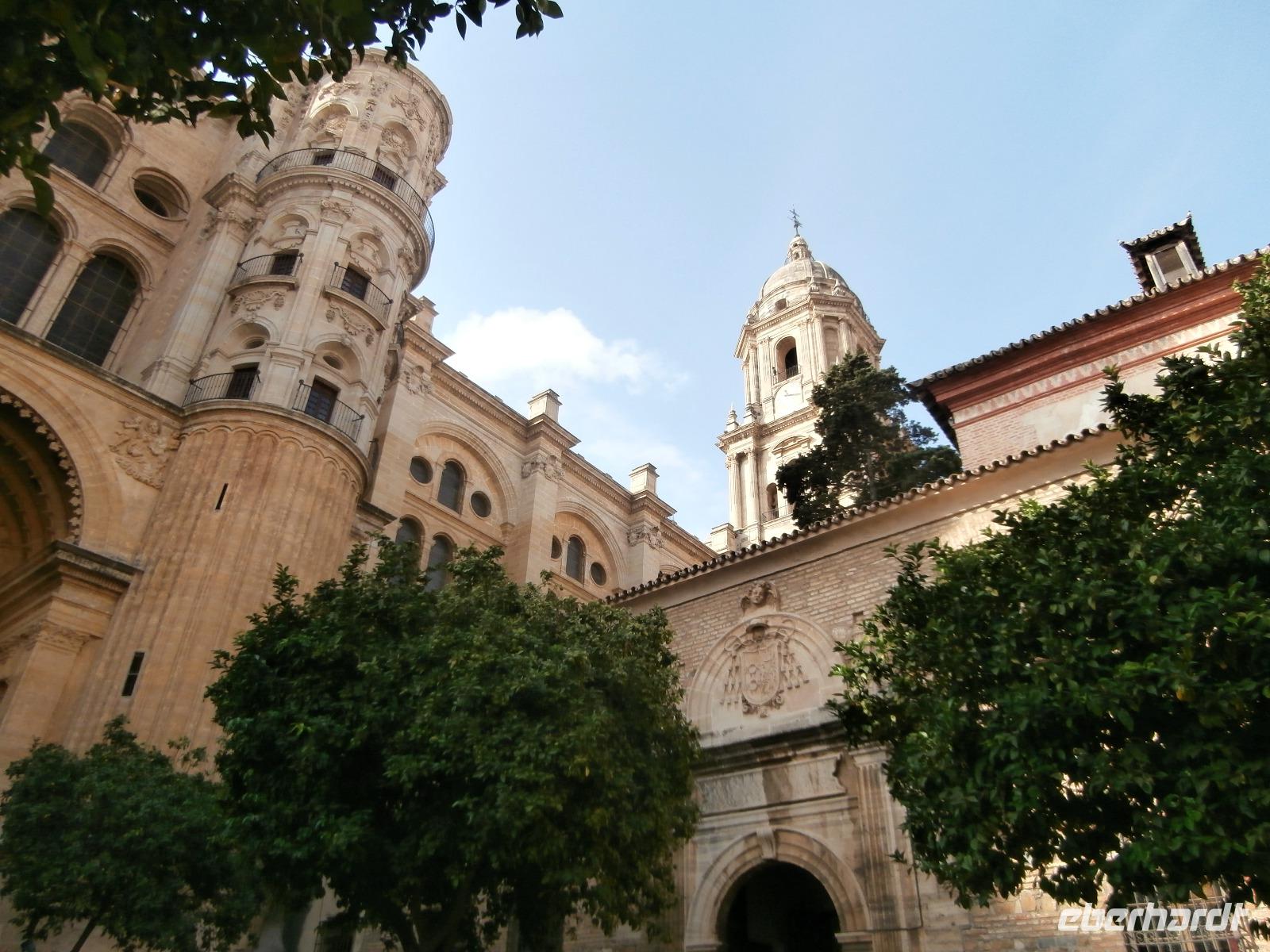 Mit unserem Bus stoppen wir noch in Granadas Altstadt und verbringen den Nachmittag mit Besichtigung der Kathedrale und der Capella Real, wir sehen die verschiedenen Baustile von Mujedar bis Renaissance, verwinkelte Gassen und Bars laden ein zum Verweilen. In Nerja wollen wir vom Balkon de Europa in das aufgewühlte Mittelmeer schauen, aber ein bevorstehendes Fest läßt uns nicht auf den Parkplatz für Busse gelangen und so fahren wir wieder aus der Stadt heraus ohne Besichtigung und weiter geht's nach Málaga. Hier gestaltet sich das Ausladen der Koffer etwas schwierig, im Kreisverkehr lädt Andreas schließlich unsere Koffer aus. Ein leckeres Abendessen mit Wein und Wasser gratis lässt uns schnell die Strapazen vergessen. 180km