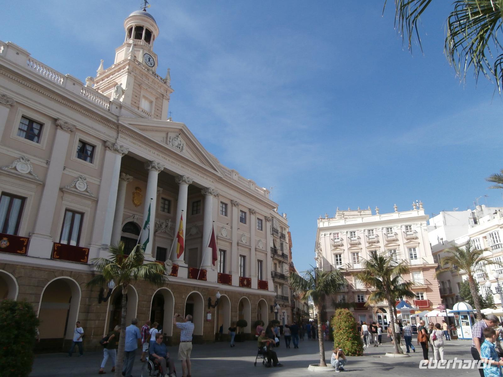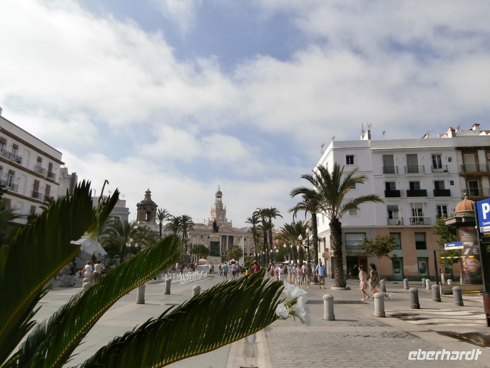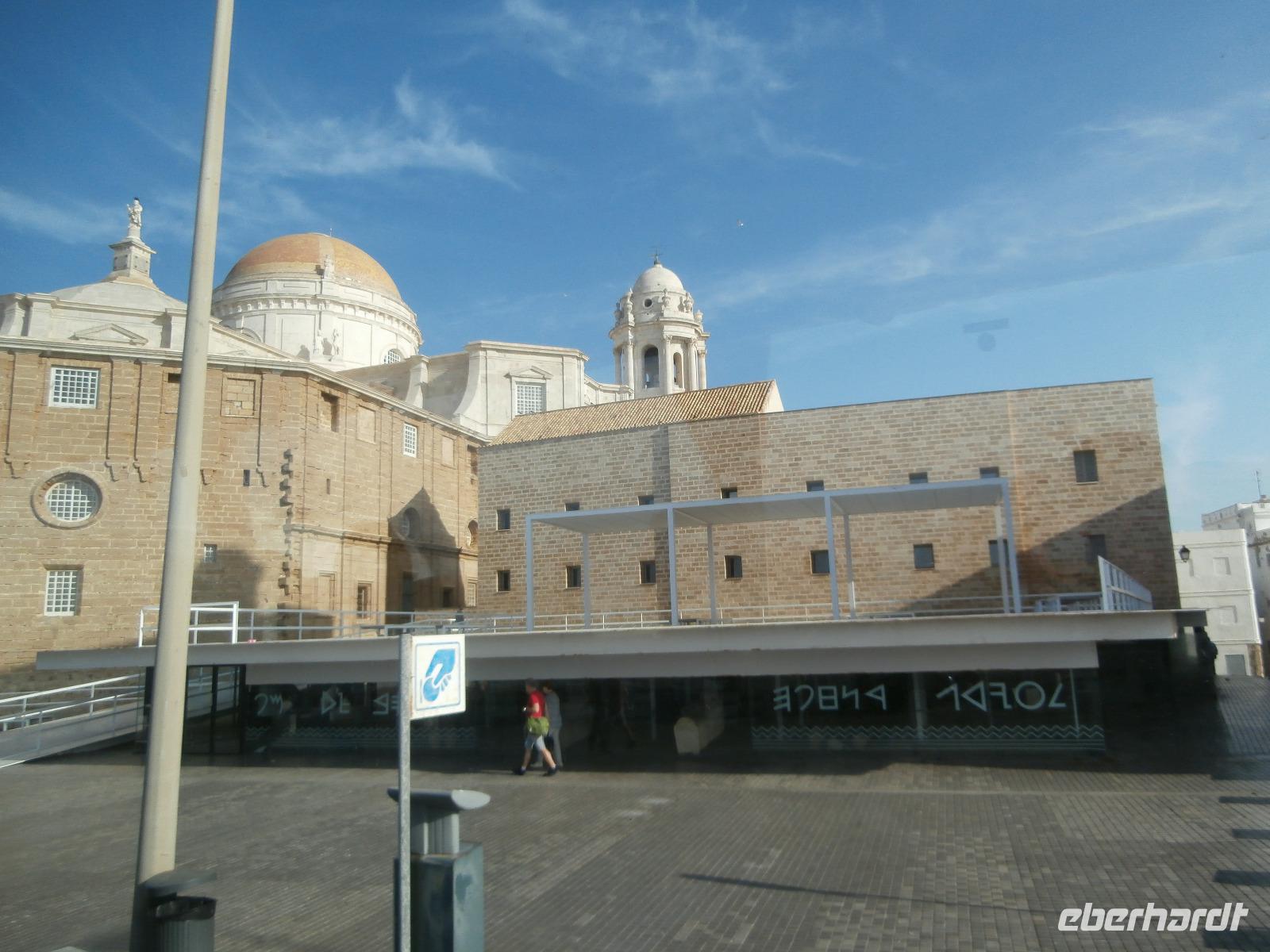 Nach dem Frühstück bringen wir wieder unsere Koffer zum Bus. Andreas fährt vor und seine sportliche Übung jeden Tag besteht im Koffer ein- und ausladen, er stemmt ganz schön Gewichte. Erstes Ziel ist die schöne Hafenstadt Cádiz, hier feiert man einen besonders bekannten Karneval. Der einstige Reichtum der Stadt ist noch an der Kathedrale und an anderen barocken Gebäuden zu sehen. Unsere örtl. Reiseleiterinnen Maria und Marianne nehmen uns mit auf eine Rundfahrt durch Cádiz, wir haben danach einen schönen Stadtrundgang, sie führen uns bis zum Platz der Blumen, die Markthalle ist heute wegen des örtlichen Feiertages, dem Fest der Madonna des Rosenkranzes, geschlossen.