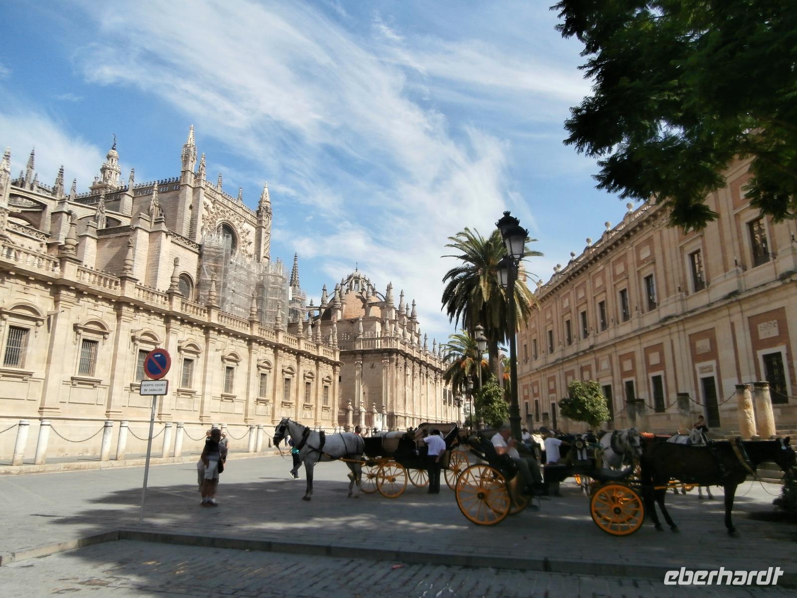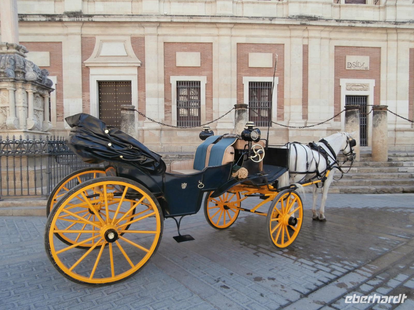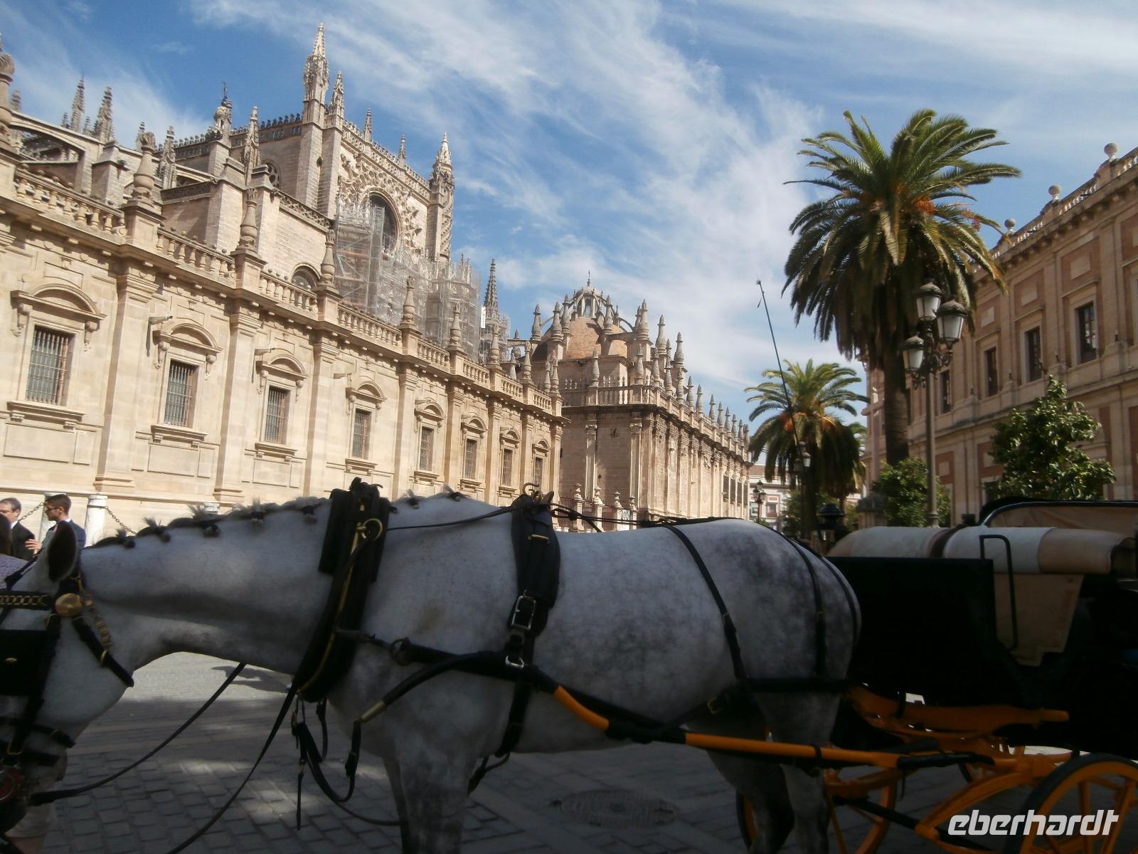 In Jerez de la Frontera kehren wir in der Bodega Real Tesoro ein und erhalten von Marike eine Führung durch das Reich der alten Sherry Fässer, sehen Pferde und Kutschen und verkosten 5 Sorten des edlen Weines, dazu werden uns leckere Tapas gereicht. Wir erleben wieder einen weiteren Höhepunkt unserer Andalusien Reise und das bei sommerlichen Temperaturen. Zeitig kommen wir nicht weiter, möchte doch jeder Gast vom Sherry oder Brandy etwas einkaufen und mitnehmen. Während unserer Fahrt nach Sevilla sehen wir Baumwolle auf den Feldern, sie wird teilweise schon geerntet. Am Abend kommen wir in Sevilla an und schnell sind unsere Koffer ausgeladen und die Zimmer bezogen. Morgen steht die Erkundung dieser fantastischen Stadt Sevilla auf unserem Programm. 275km