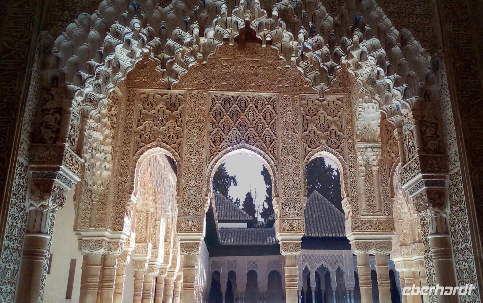 Wir teilen uns in zwei Untergruppen auf und lassen uns vom Granadino Pepe und seiner Schwester die Gartenanlagen und Paläste auf dem weitläufigen Gelände zeigen. Heutzutage sind beide Bereiche mit einer Brücke verbunden, ursprünglich musste man mit dem Pferd durch eine Schlucht reiten, um vom Generalife zum Palast zu gelangen. Generalife bedeutet „Garten des Archtikten" und ist niemand geringerem gewidmet als dem „Architekten der Welt". Wunderbar lässt es sich hier zwischen den Zierpflanzen und kleinen Wasserspielen spazieren gehen. Der kulturelle Unterschied zwischen muslimischer Konzentration auf das Innere und der christlichen Ausgerichtetheit auf ein repräsentatives Außen zeigt sich am deutlichsten in den unterschiedlichen architektonischen Traditionen. Der wuchtige Palacio de Carlos V im Renaissance-Stil steht ganz im Gegensatz zum nach außen hin unscheinbaren Nasridenpalast, wo sich erst im Innenhof seine ganze Schönheit zeigt.