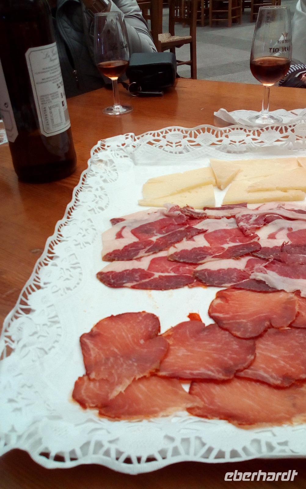 Der windige Atlantik beschert der Provinz nicht nur Surferparadiese und wilde Dünenlandschaften, sondern auch ganz besondere Weine: Wir befinden uns im sogenannten Sherry-Dreieck aus El Puerto, Sanlucar de Barrameda und Jerez de la Frontera. In letzterem schauen wir uns das Ganze etwas genauer an. In der Kellerei Marqués del Real Tesoro wird uns gezeigt, wie jedes Jahr hundert Liter Wein von einer Fassreihe in die nächste umgefüllt und so die Sherrys ohne Jahrgang aber mit gleichbleibender Qualität hergestellt werden. Wie gut das mit der Qualität hinhaut, davon überzeugen wir uns im Anschluss lieber selbst und lassen uns mit trockenen und süßen Sherrys und zahlreichen Tapas-Happen verwöhnen.